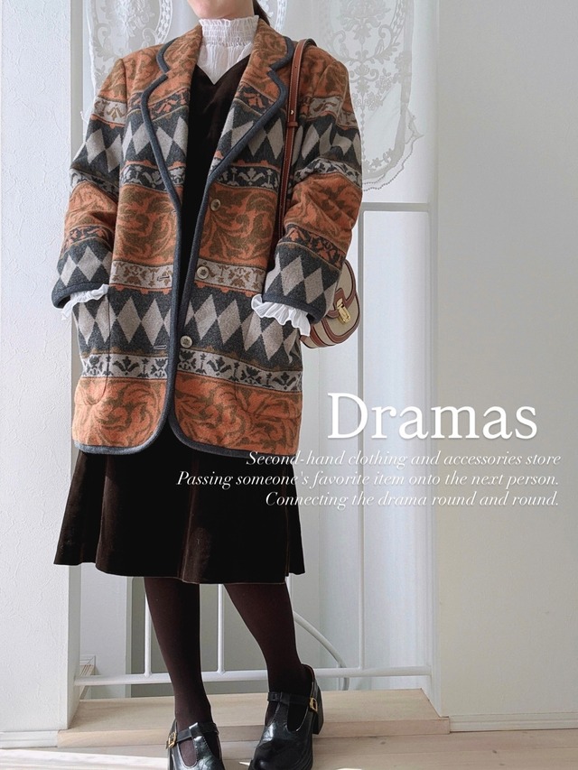 上品な立体感が美しい、ブラウンのジャカードニットジャケット。 織りで描かれたクラシカルな柄模様が、まるで絵画のように奥行きを感じさせます。 柔らかくしなやかなニット素材ながら、程よく厚みがあり、アウターとしてもカーディガン感覚でも着られる一枚。 裏地のない軽やかな仕立てで、季節の変わり目や室内の羽織にもぴったりです。 艶を抑えたゴールドボタンがアクセントとなり、どこかヴィンテージムード漂う佇まい。 きちんと感と柔らかさを兼ね備えた、上質な日本製の一着です。 【サイズ】 表記:Mサイズ 肩幅:約38cm 身幅:約45cm 着丈:約64cm 袖丈:約54cm 【コンディション】 目立つダメージや汚れはなく、全体的にとてもきれいな状態です。 自宅洗濯OKな素材です。当店にて手洗いしております。 【お勧めコーディネート例】 ハイネックニットやブラウスと合わせて上品に。 フレアスカートでクラシカルガーリーに、デニムと合わせれば程よくカジュアルダウンも。 ベージュやアイボリーなどの柔らかなトーンと相性抜群です。 【キーワード】 ブラウンジャケット ジャカードニット レトロジャケット 日本製 秋冬コーデ 古着女子 クラシカルファッション 軽アウター ゴールドボタン Dramas ※平置き採寸は多少の誤差があります。 (着画モデルは骨格ウェーブ、普段Mサイズまたは9号サイズ着用者で身長160㎝体重46kg、肩幅約38㎝、ウエスト62〜64㎝、胸囲78㎝、ヒップ88㎝程度、首の太さ約29㎝、手首の太さ約14㎝、ブルベ夏) ※丁寧に撮影・検品したお品を、Dramasより大切にお届けいたします。 古着がはじめての方にも安心してお選びいただける一枚です。 ※こちらはヴィンテージのお品物になります。最低限のクリーニングや補修はしてありますが多少の傷や汚れなどがありますので、中古品にご理解のない方はご購入をお控えください。 ※古着・ヴィンテージ品については返品交換は致しかねますので必ず上記の事にご納得いただいた上でご購入下さい。 ※ なるべく実物に近い色味で掲載しておりますが色味は光の当たり方や、PC・スマホのディスプレイによって多少違う事があります。