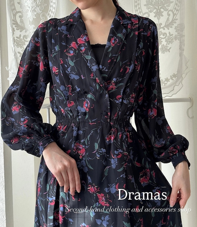 1503. ヴィンテージ 花柄 シフォンワンピース ブラック|ダブルボタン風 ウエストゴム 裏地付き ロング丈 レトロクラシカル