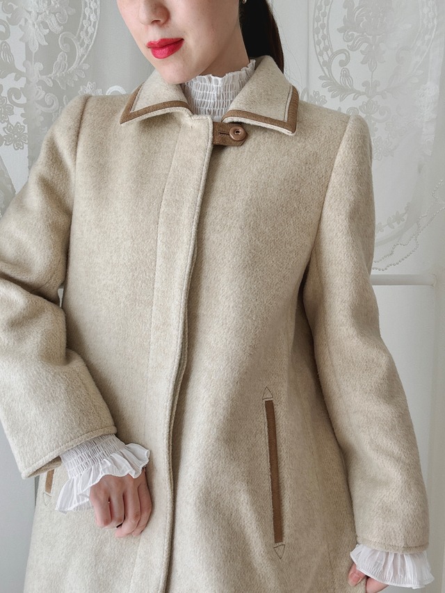 1583. 【上品ウールコート・11号】cojana 東京スタイル|スエード調トリミング×ロング丈|ベージュ・フォーマルにも◎