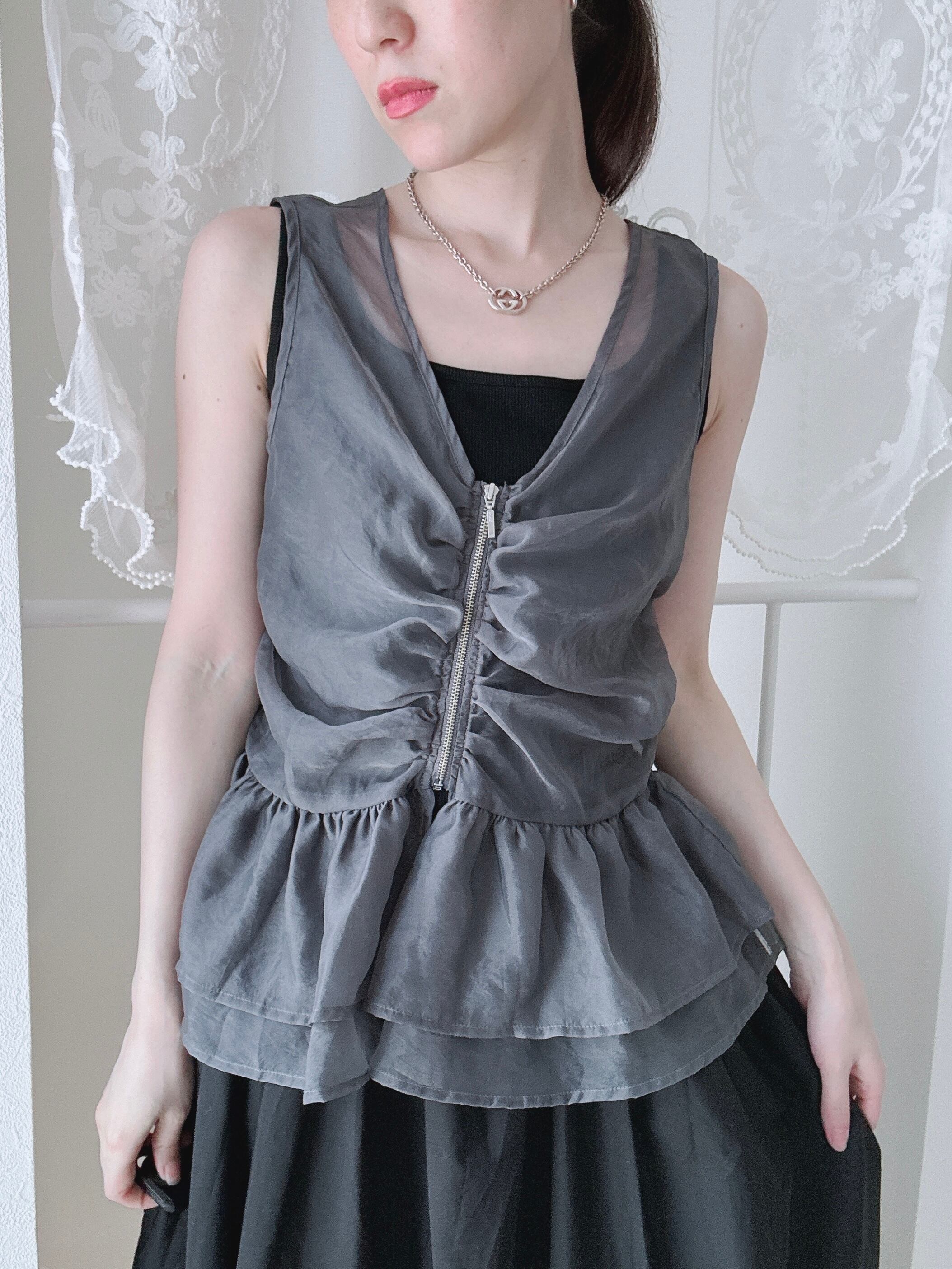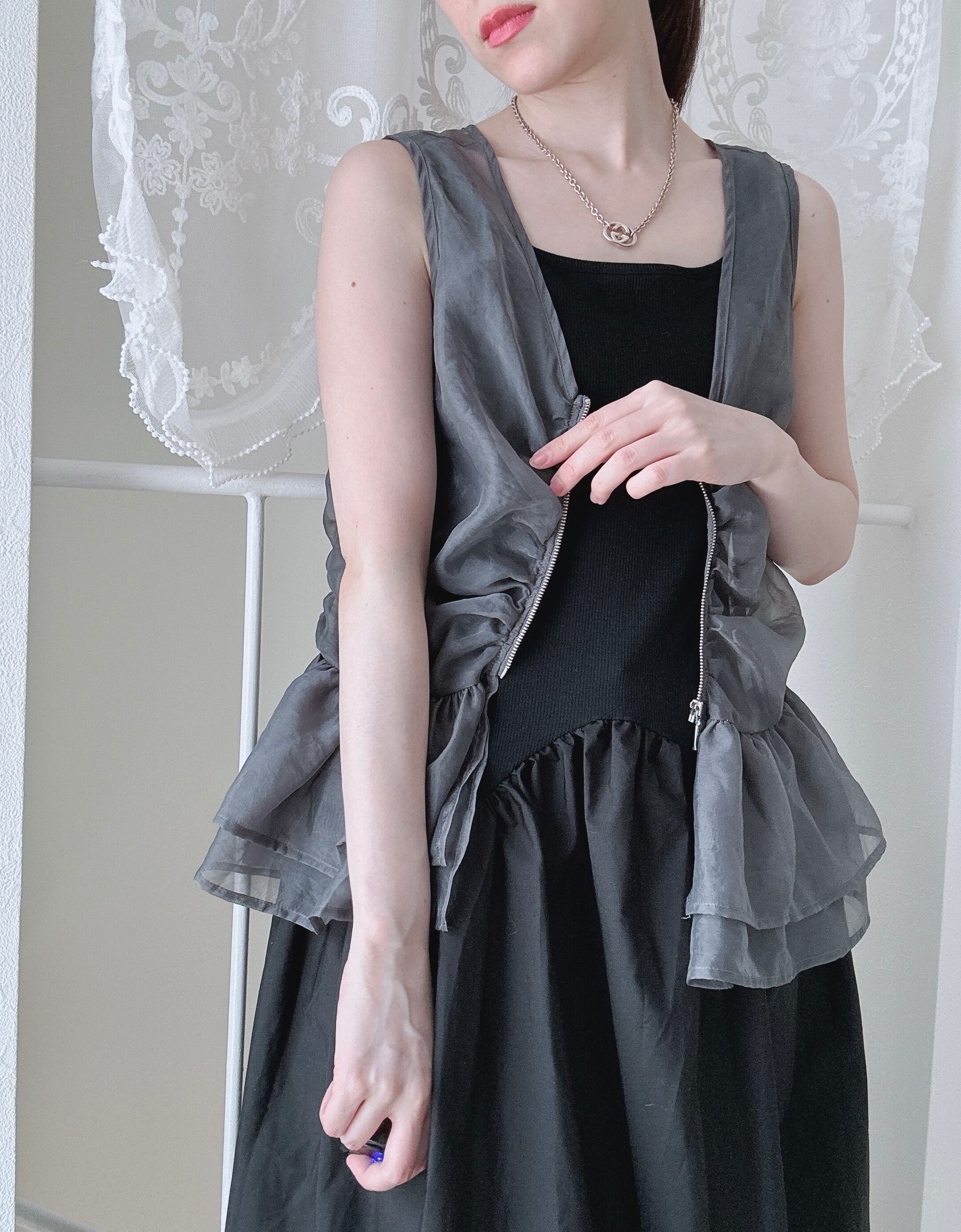 薄いシフォン生地で出来たふんわりとしたシルエットのジレです。