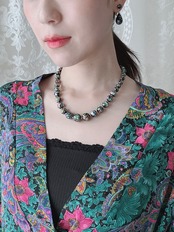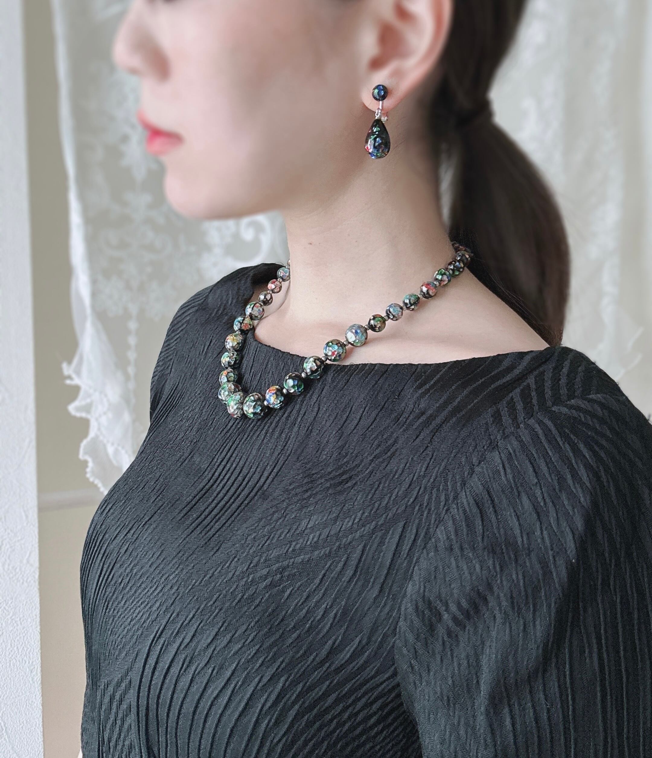 七色に輝くブラックオパールのような蛍ガラスビーズが贅沢に連なったネックレスです。