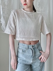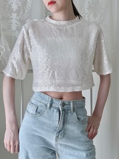 小さめのスパンコールがぎっしり縫い付けられた細やかな光を反射するTシャツです。