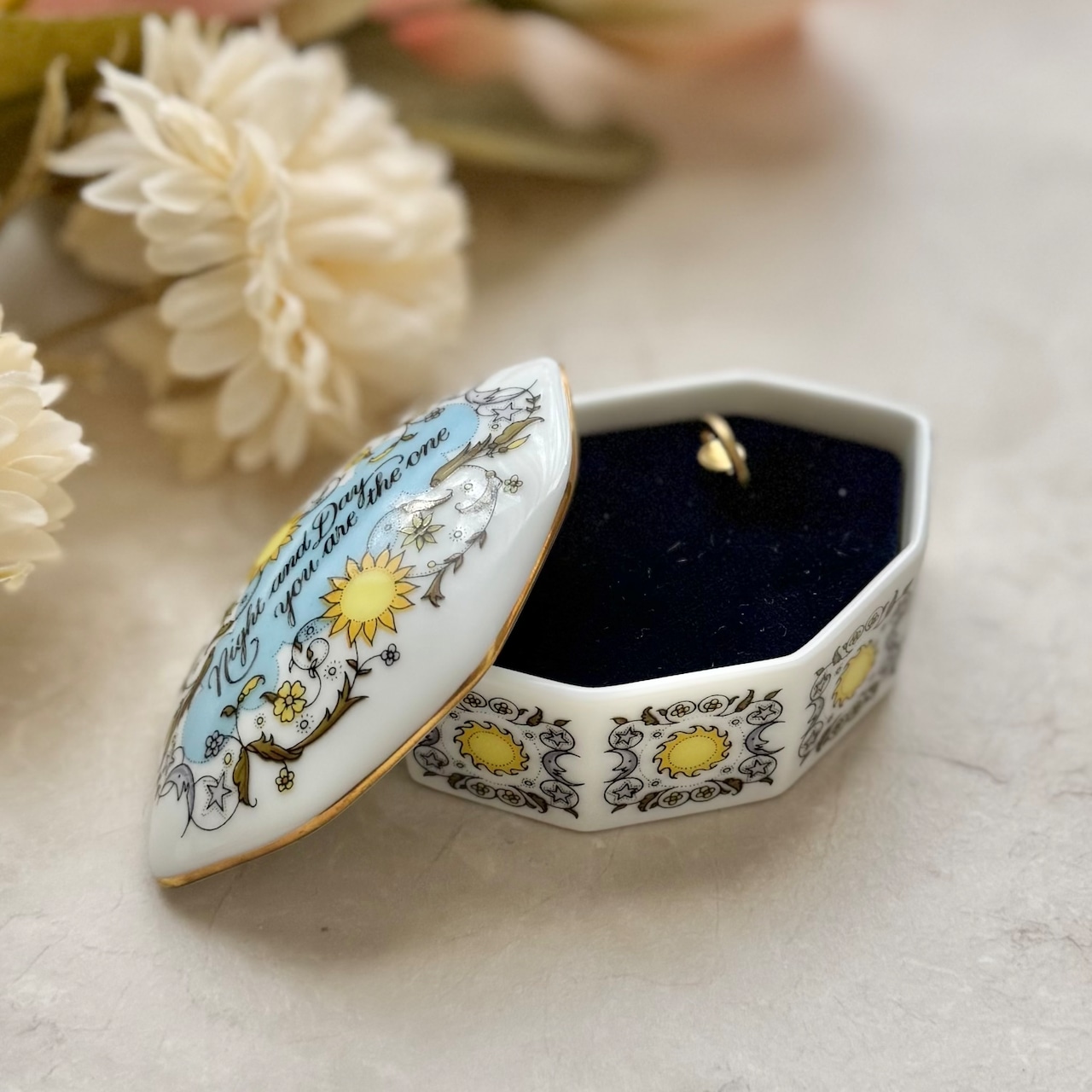 太陽と月の絵柄と『Night and day you are the one.』(夜も昼もあなたは唯一無二の存在です。)というロマンチックなメッセージが素敵です。