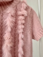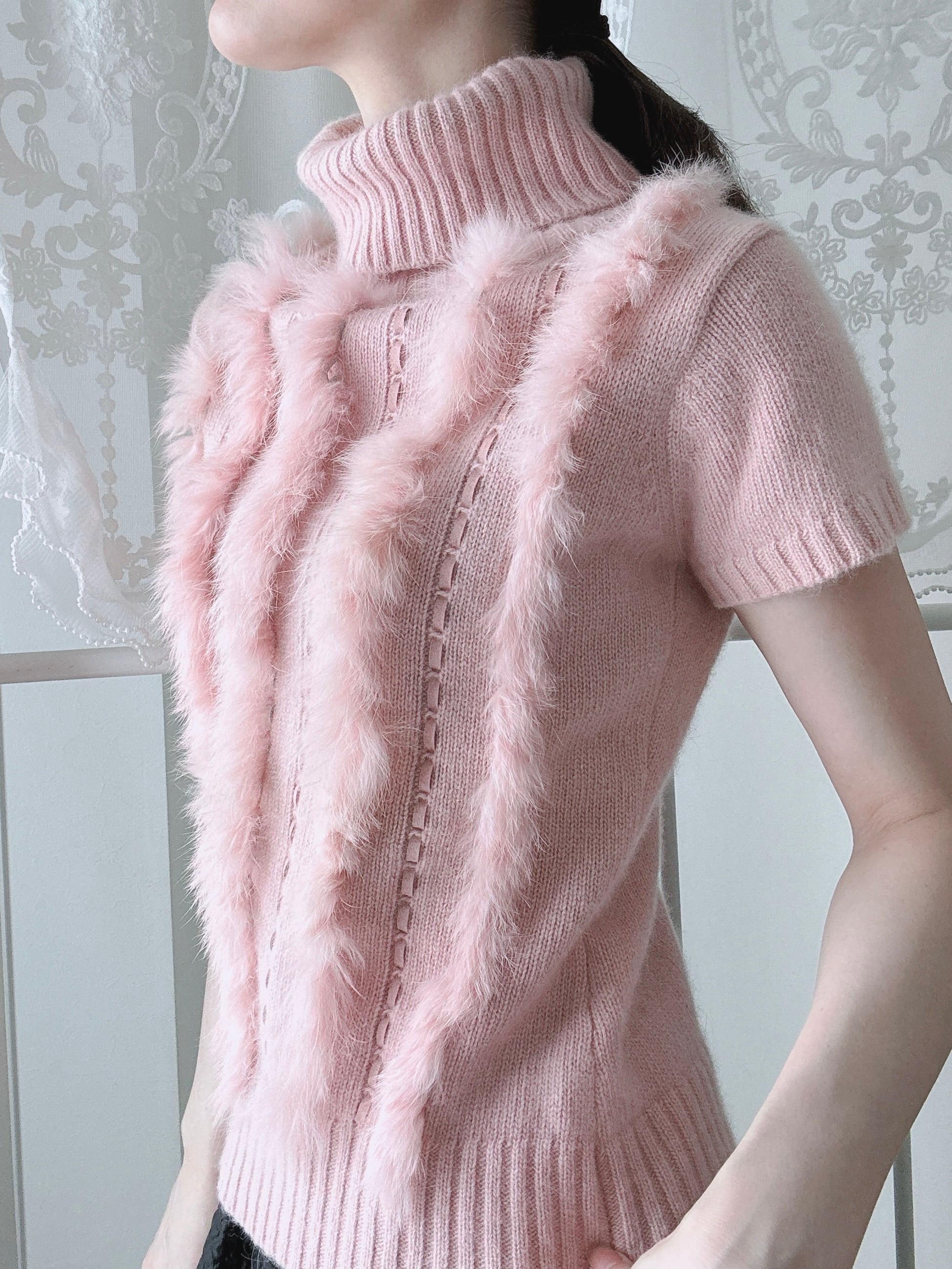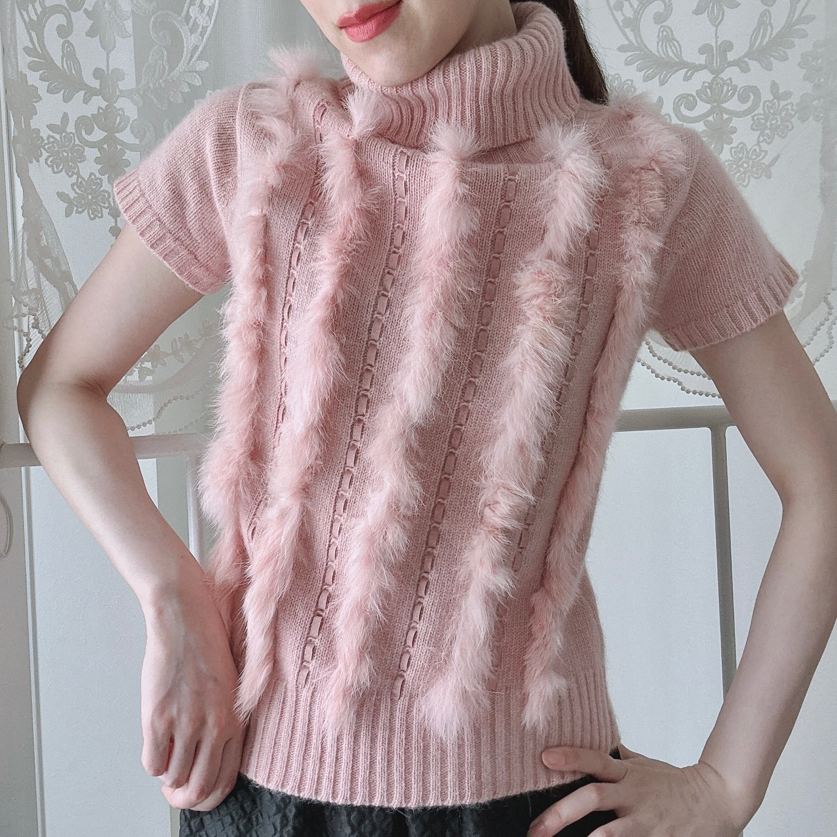 1566. ラビットファー付き アンゴラ混 ペールピンクニット|ふわふわタートルネック フェミニン セーター レディース 秋冬