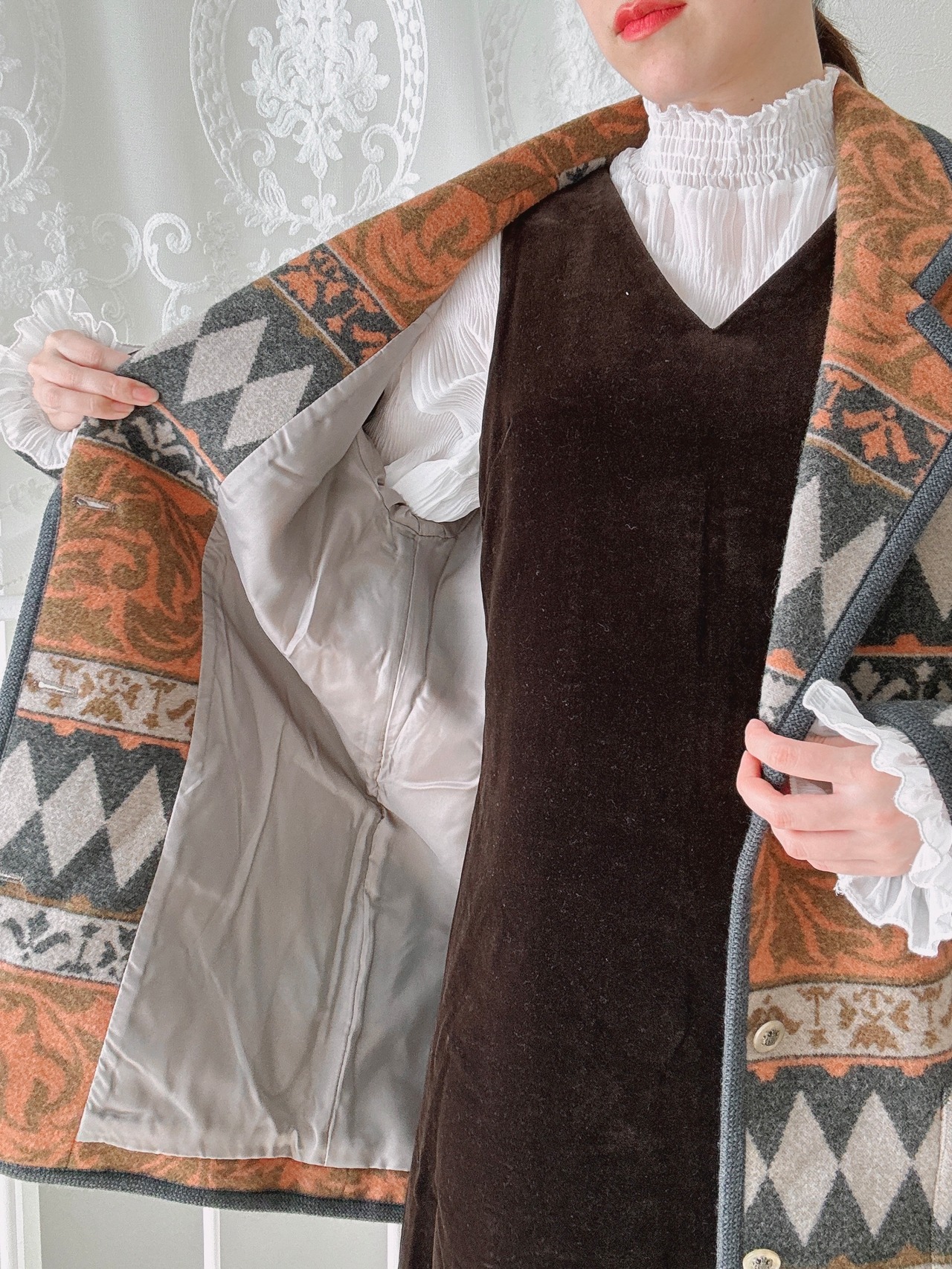 1578. 【PINORE】ウール90% ジャガード柄コート|大きめシルエット・レトロクラシカル|古着・日本製アウター【Dramas】