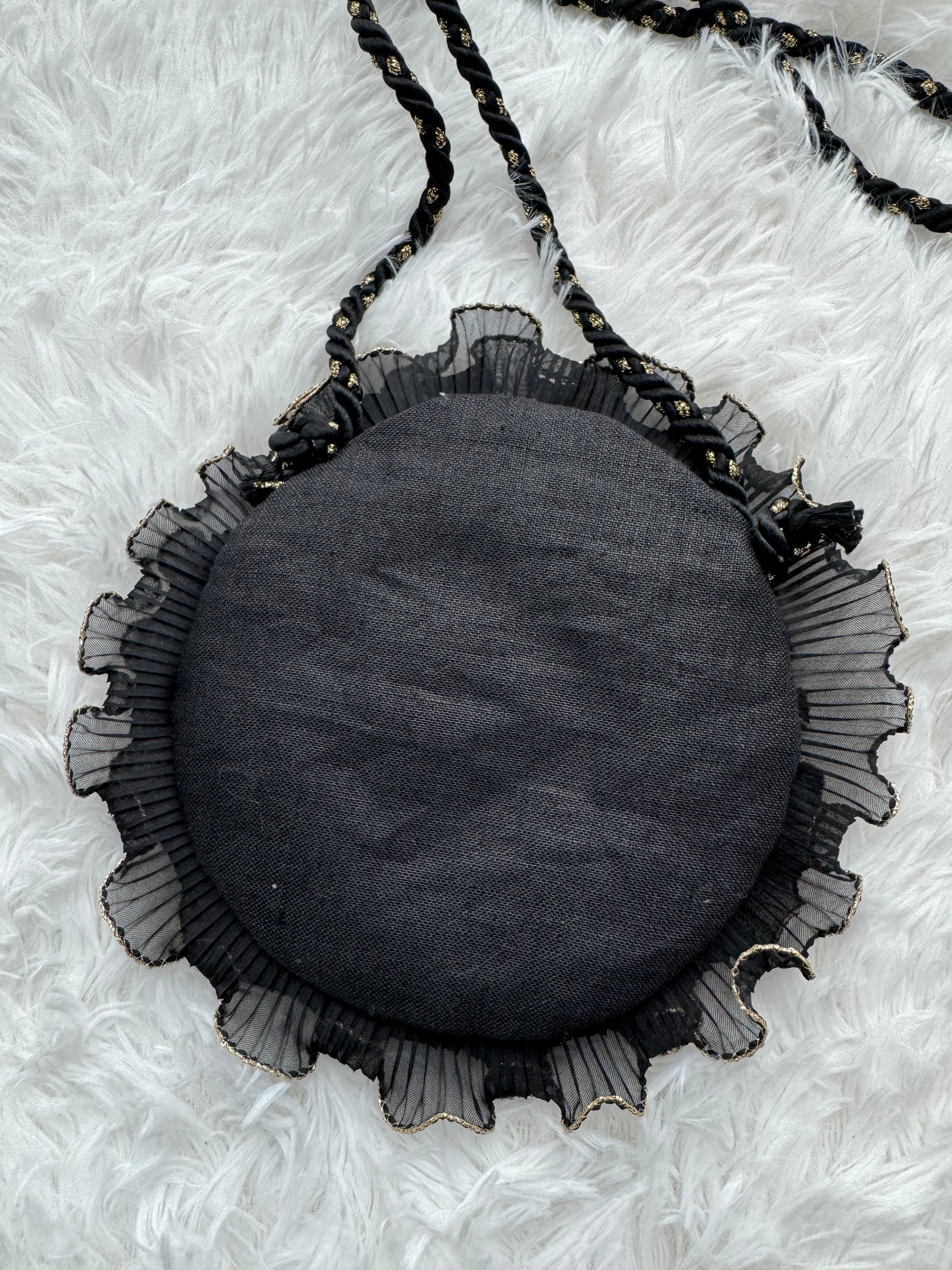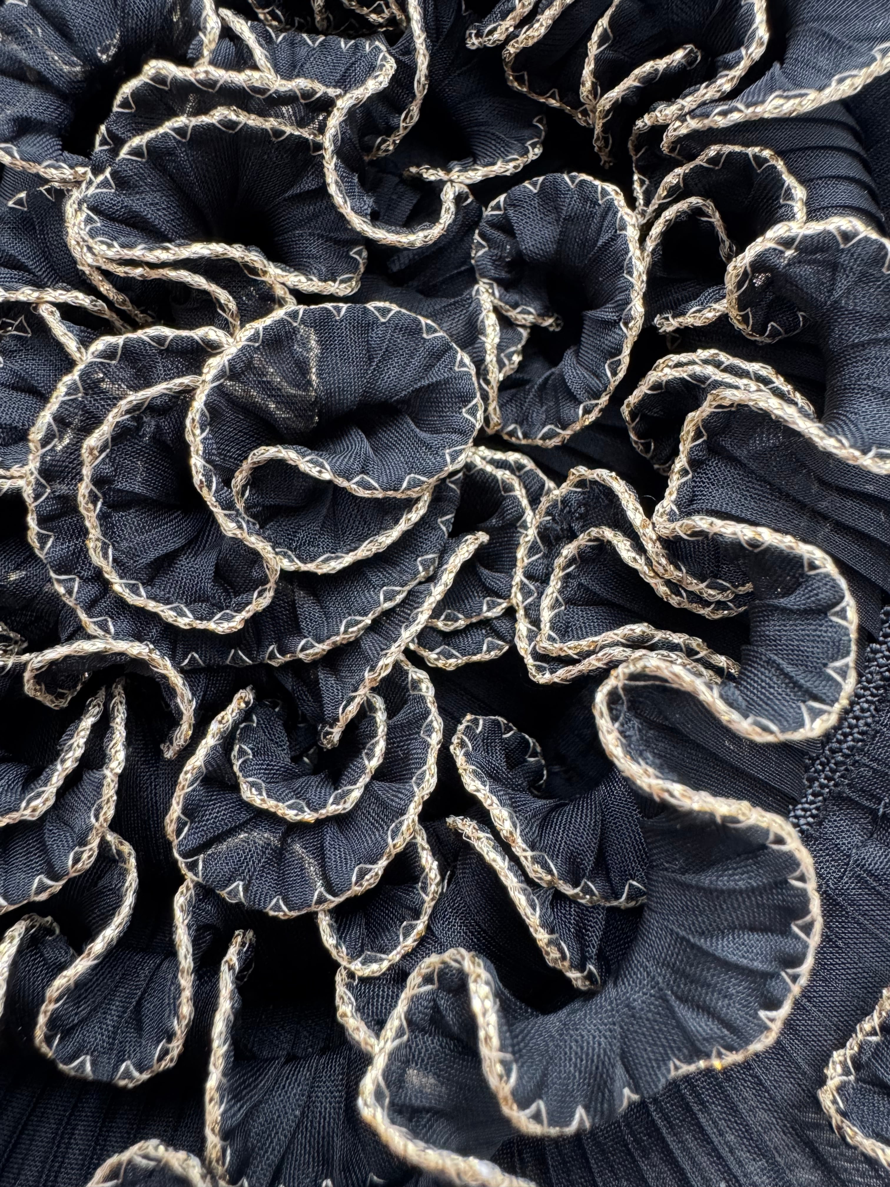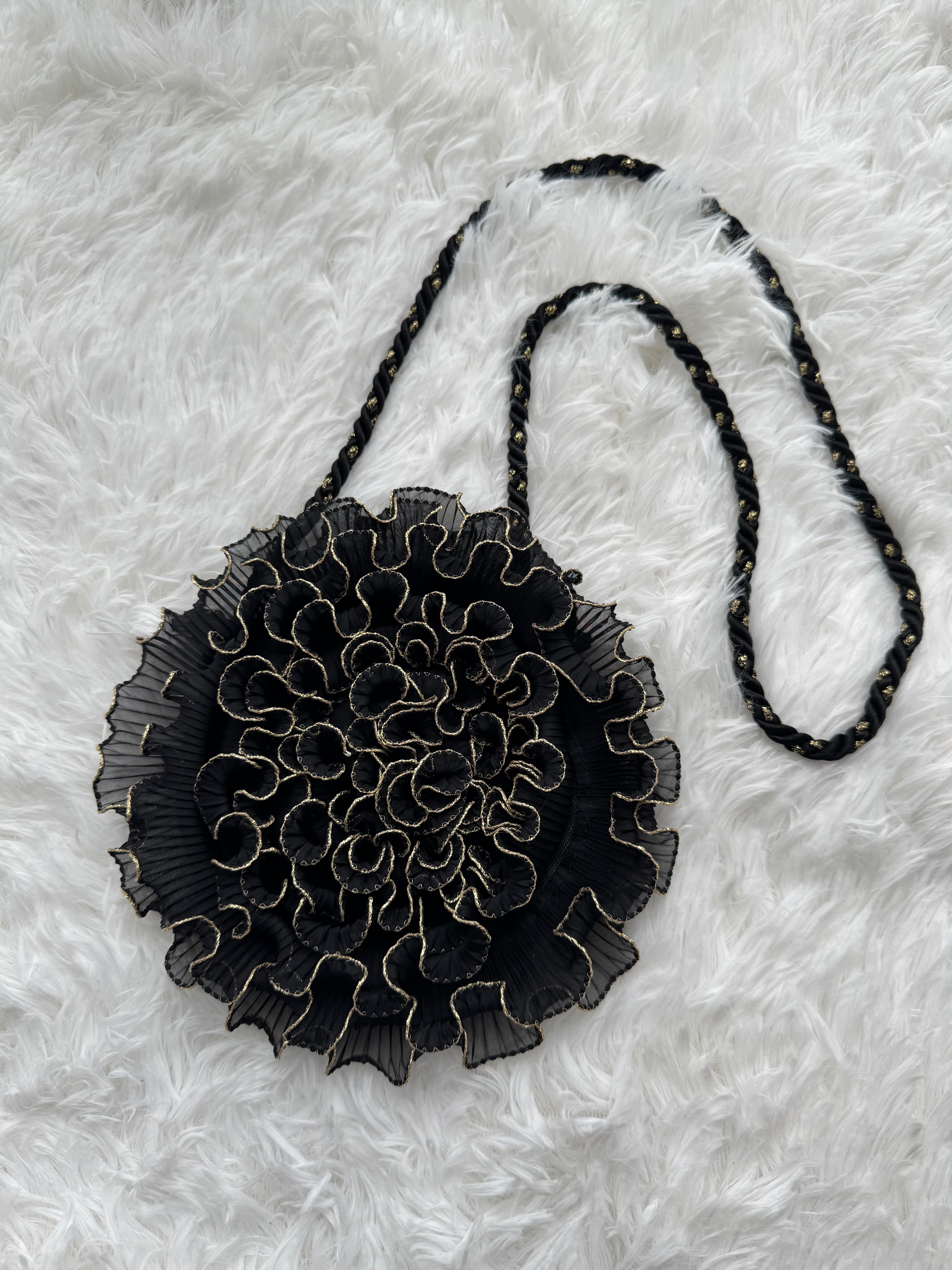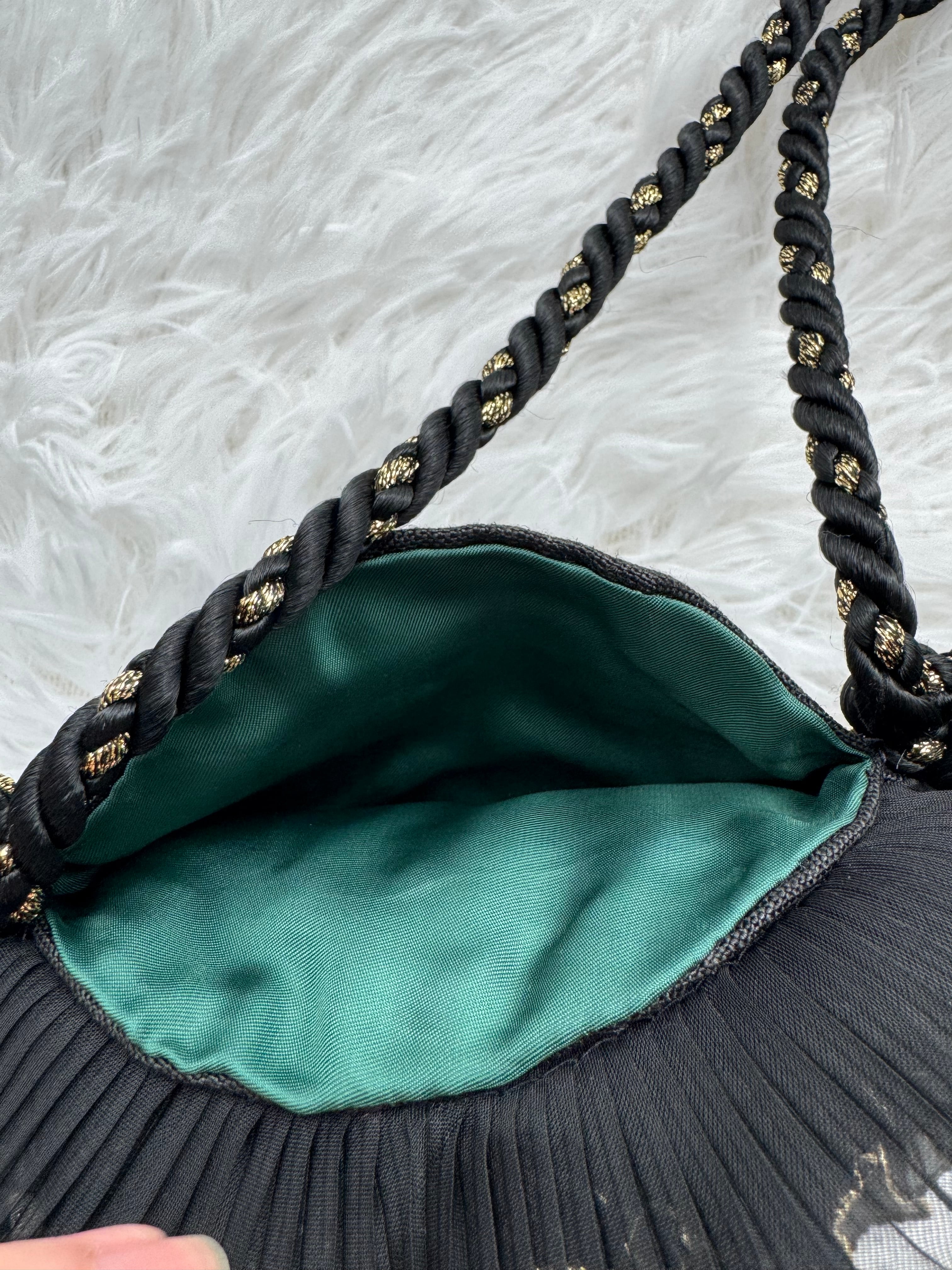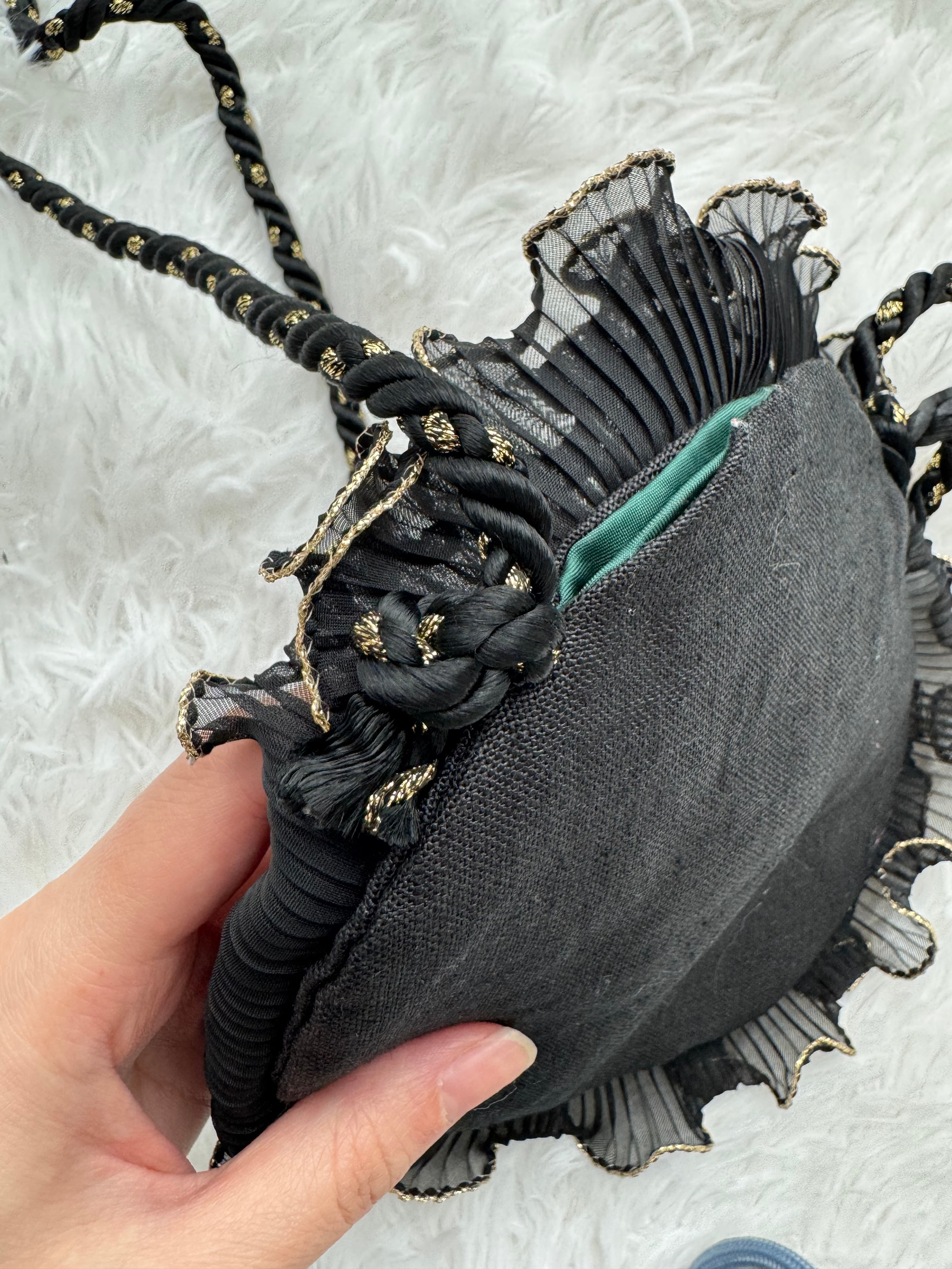 1584. くしゅくしゅシアーナイロンポシェット/軽やかで透け感のあるショルダーバッグブラック×ゴールド フリルオーガンジーポシェット|深緑サテン裏地|立体フラワーデザイン 美品 ヴィンテージライク