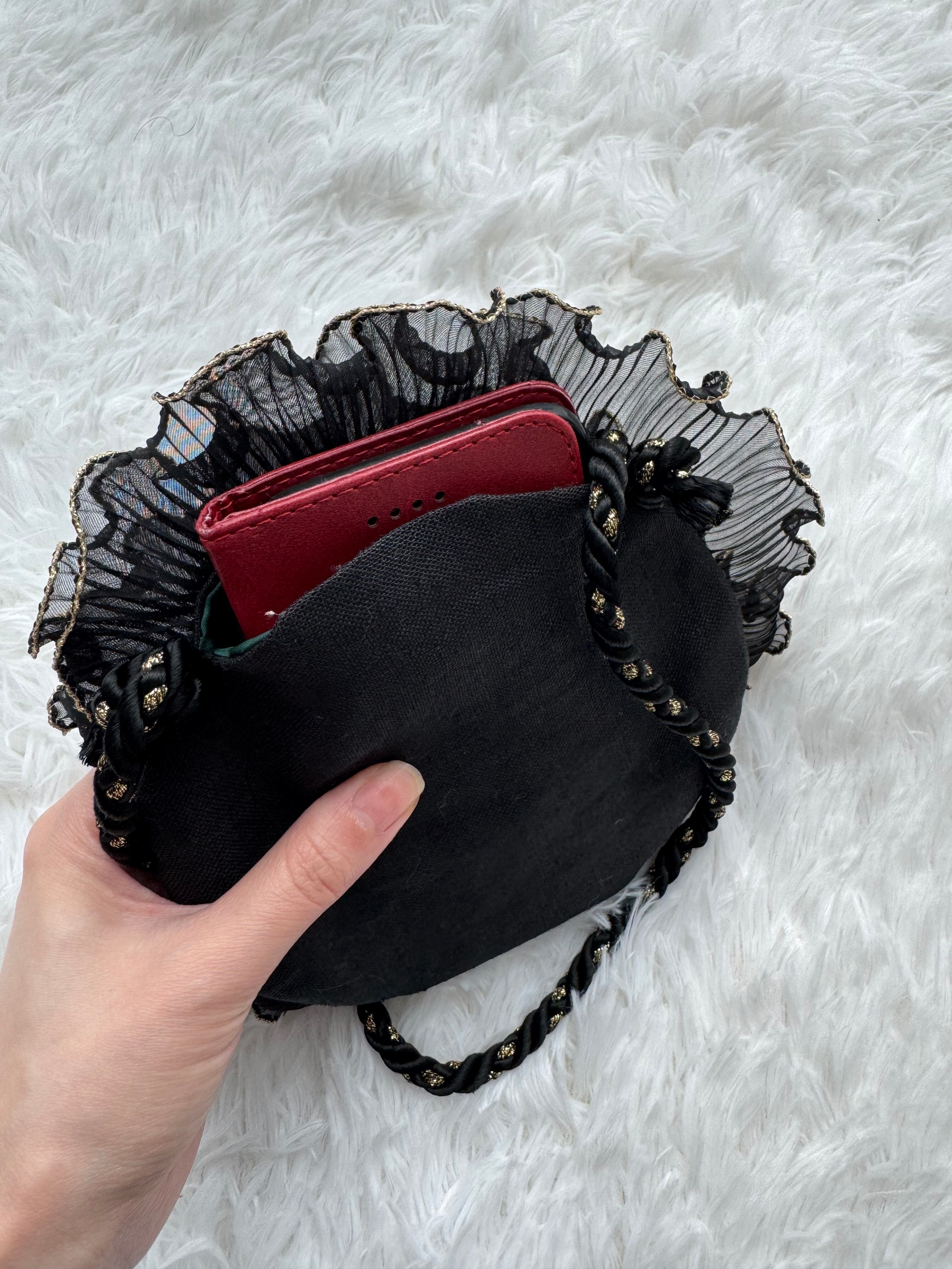 #オーガンジーバッグ #フリルポシェット #ブラックゴールド #ドーリーファッション #クラシカルガーリー #ヴィンテージライク #深緑サテン #ハンドバッグ #ショルダーバッグ #ミニバッグ #dramas #ドラマズ #物語を纏う #古着女子 #レトロガーリー