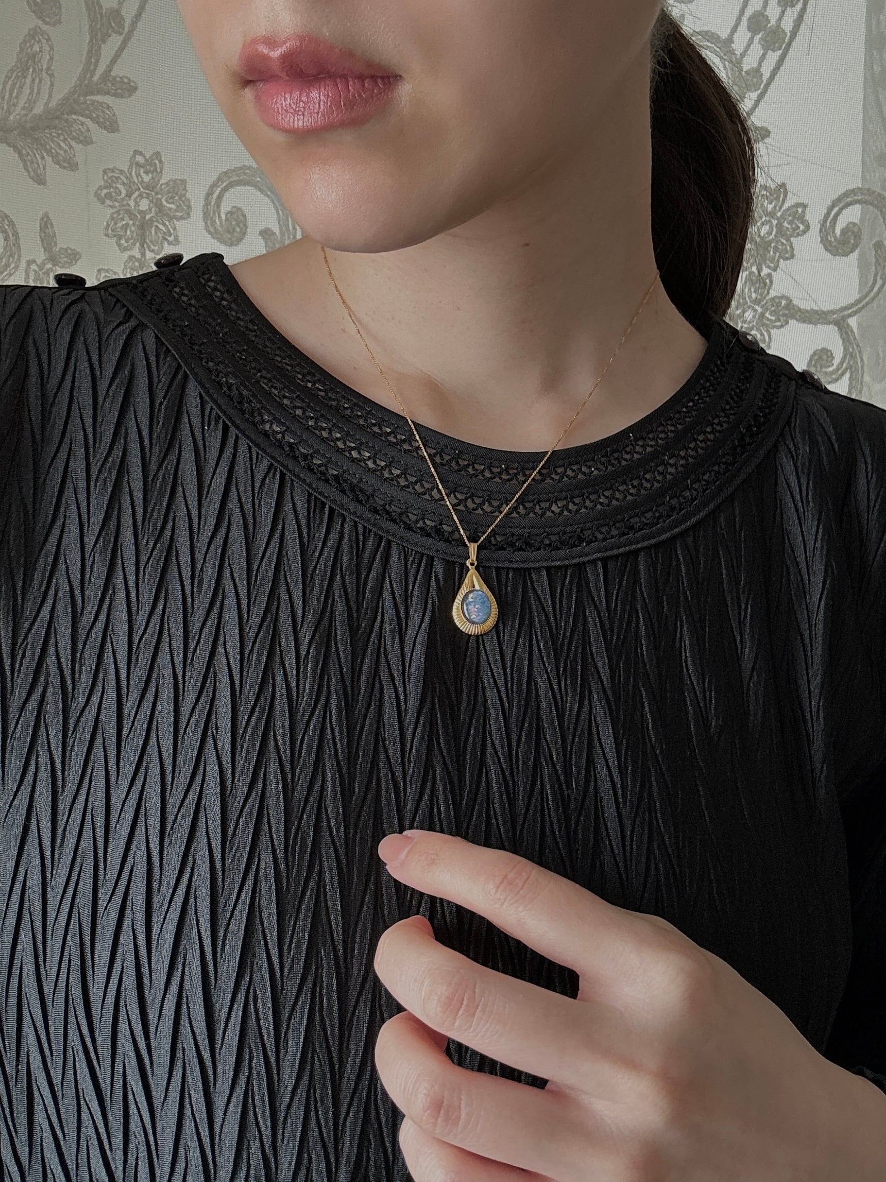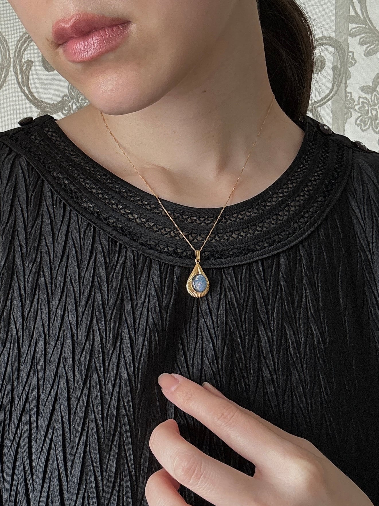 見る角度によって青・緑・紫にきらめくトリプレットオパールをセットした、上品なゴールドペンダントです。