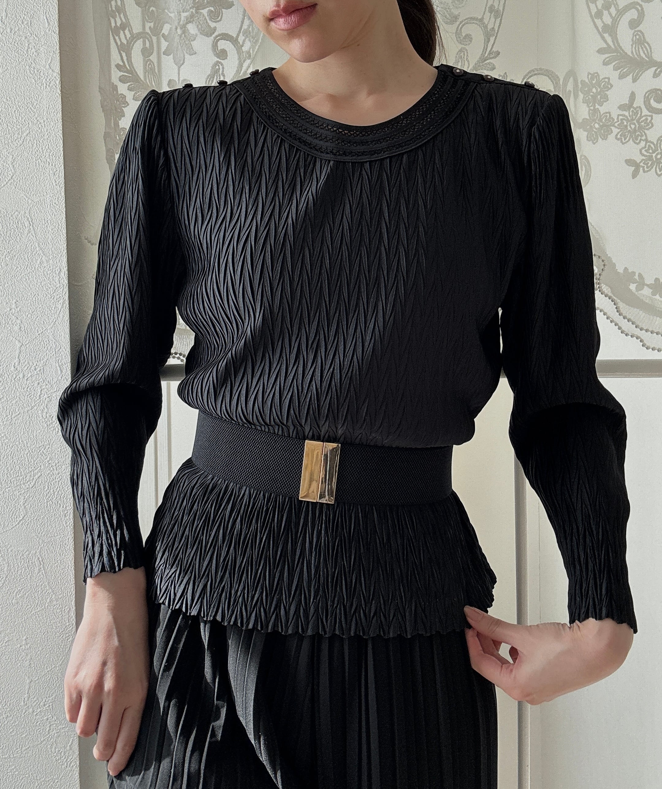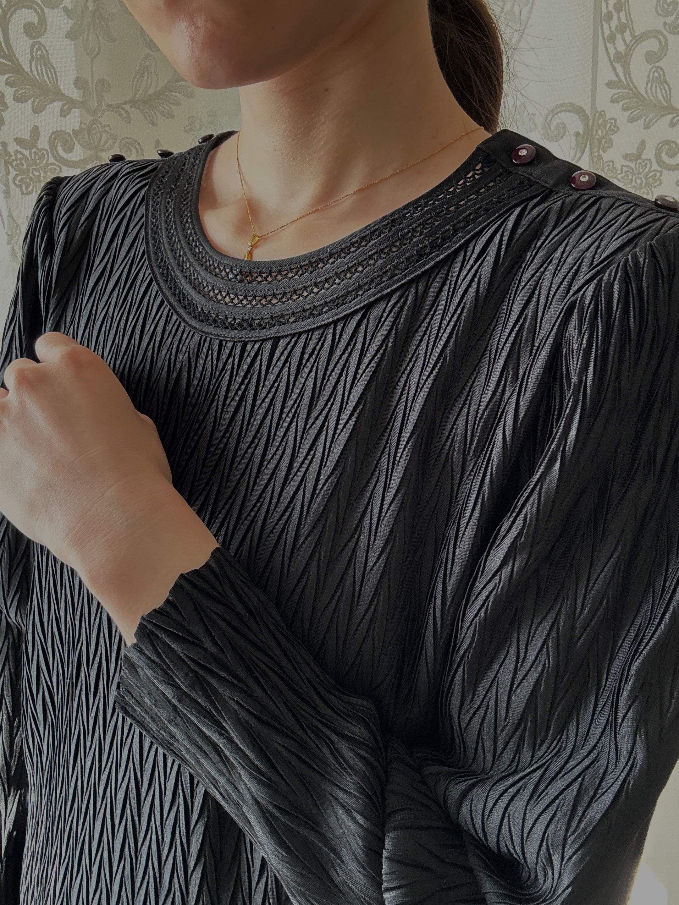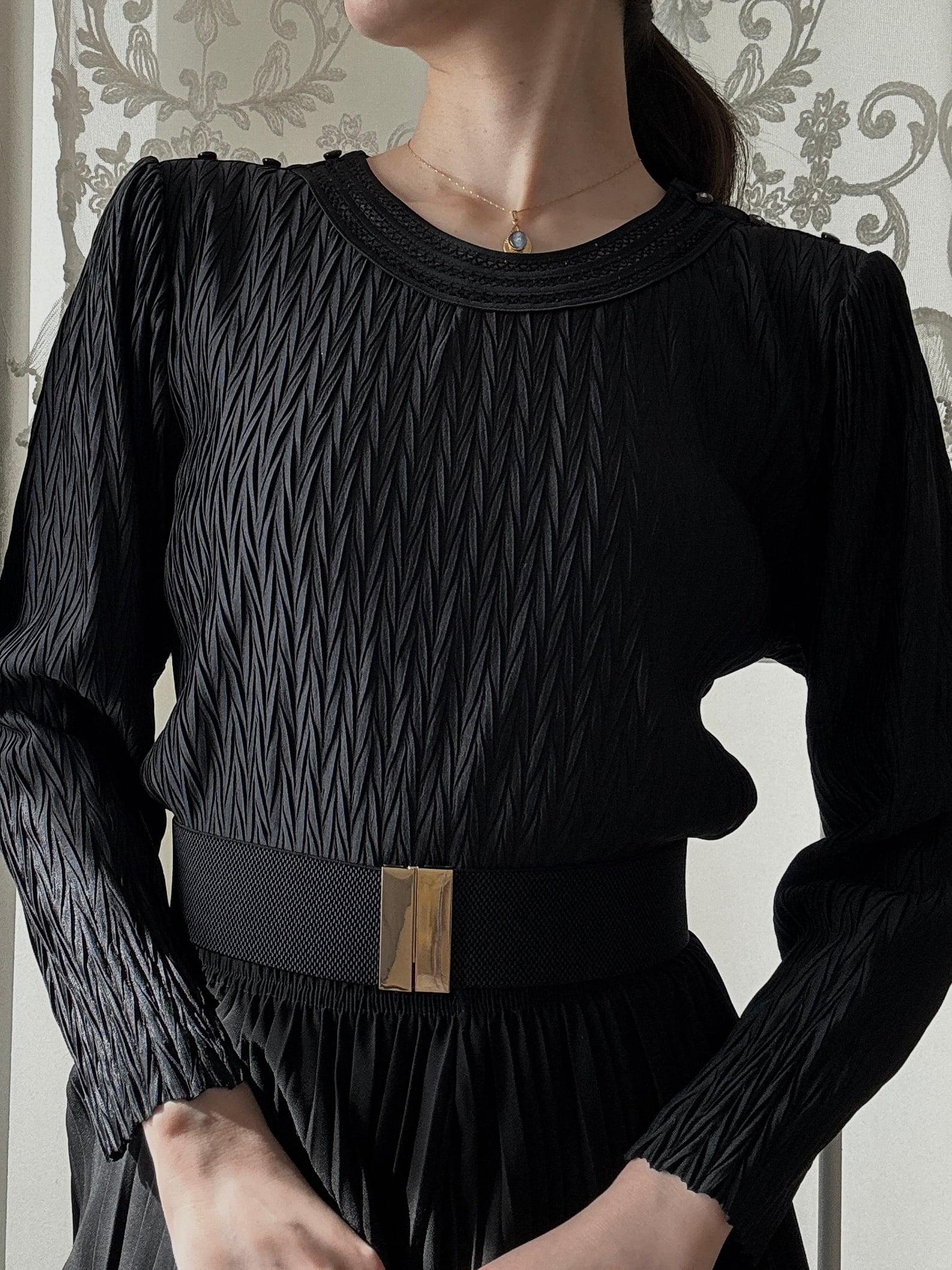 立体的なシャーリングプリーツ生地が美しく光を反射する、ブラックの長袖ブラウス。