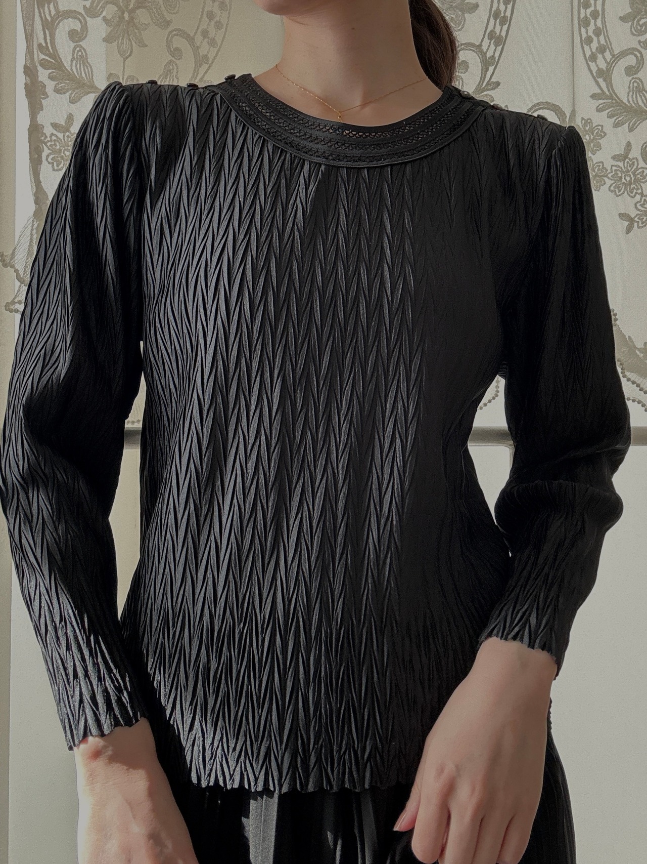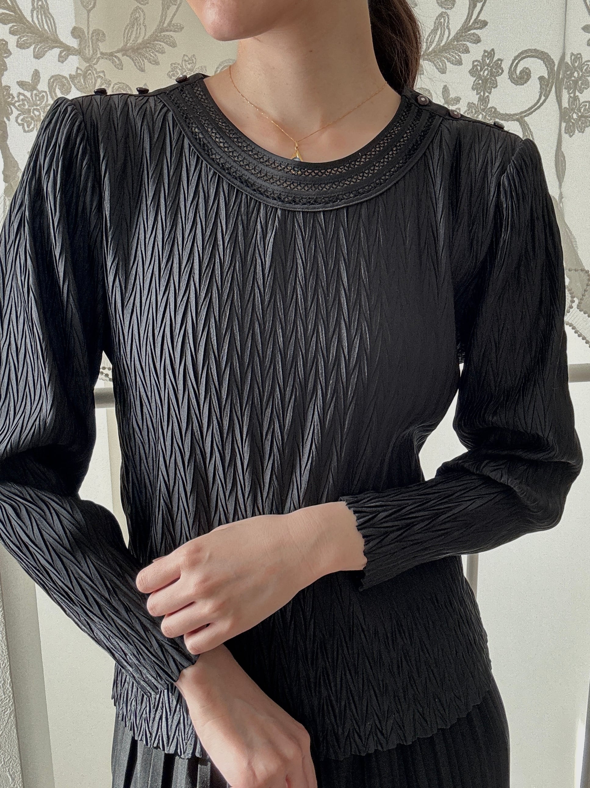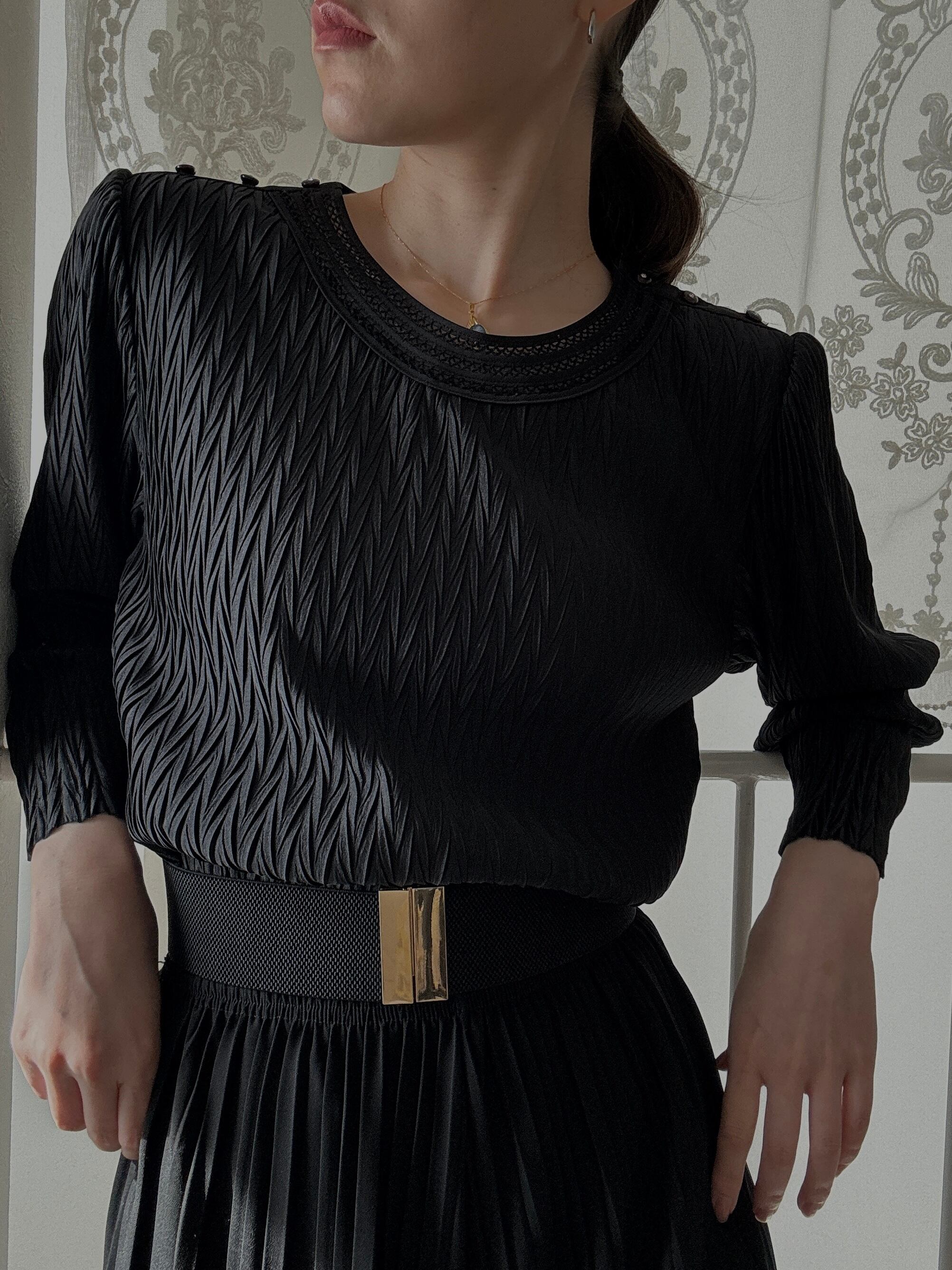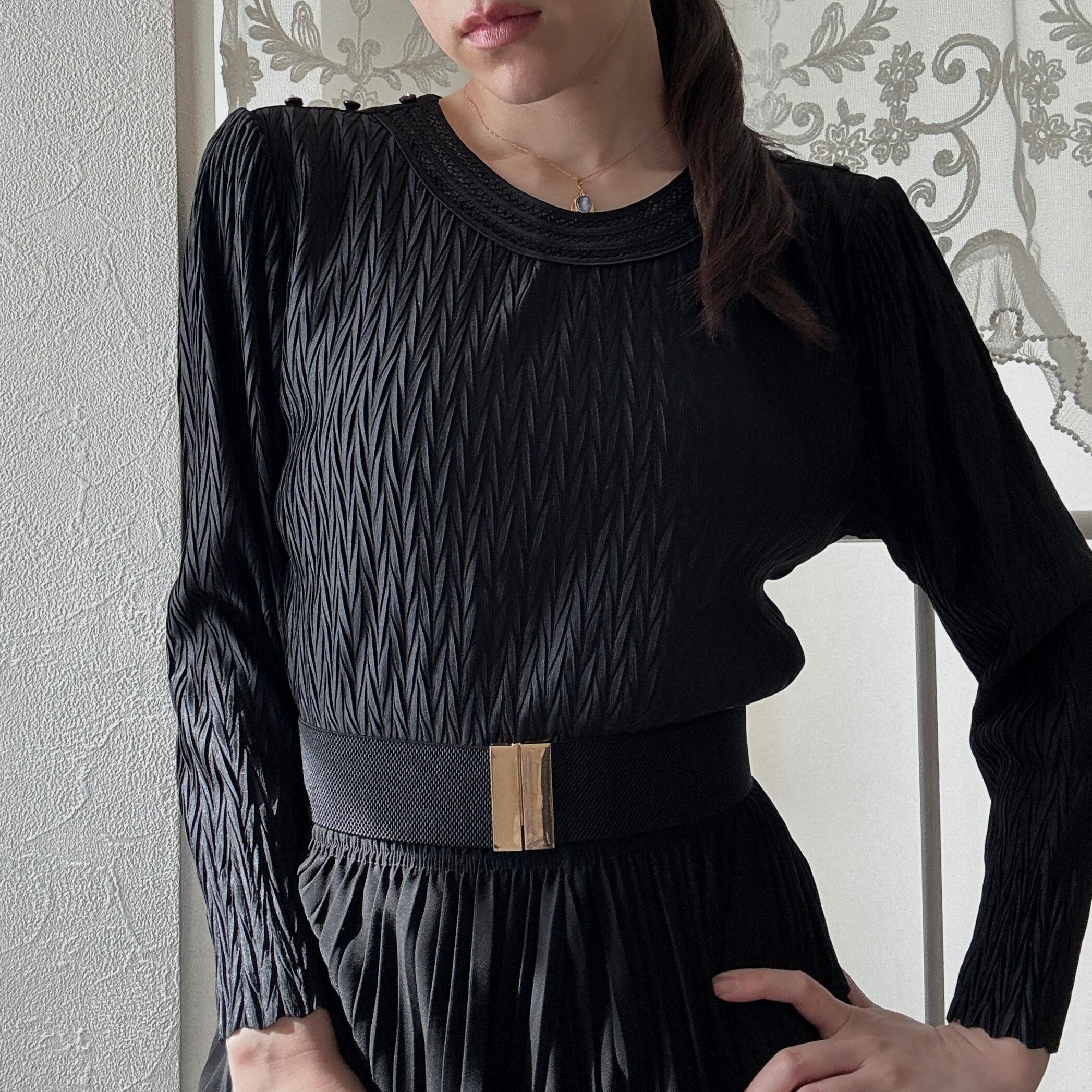 立体的なシャーリングプリーツ生地が美しく光を反射する、ブラックの長袖ブラウス。