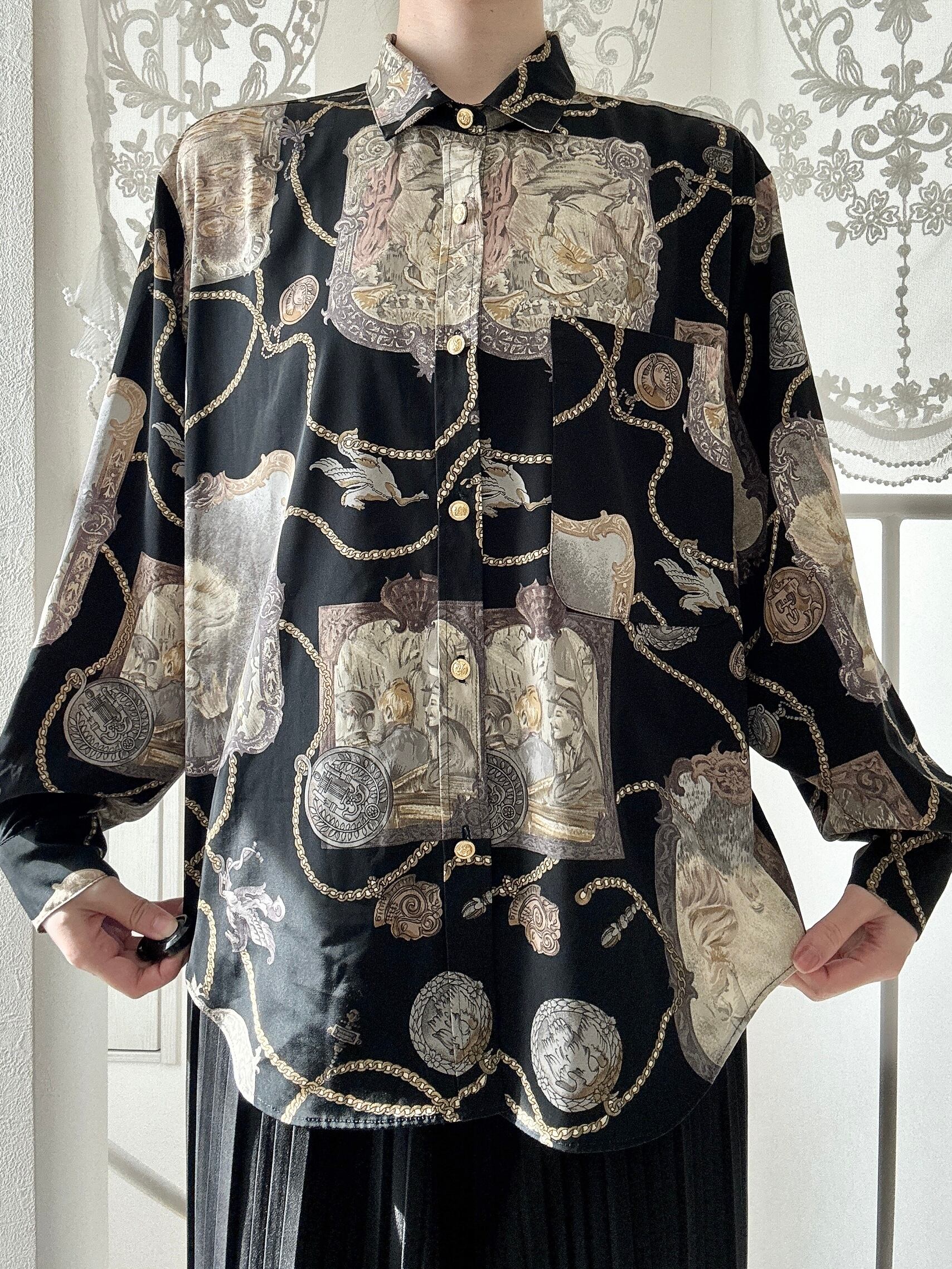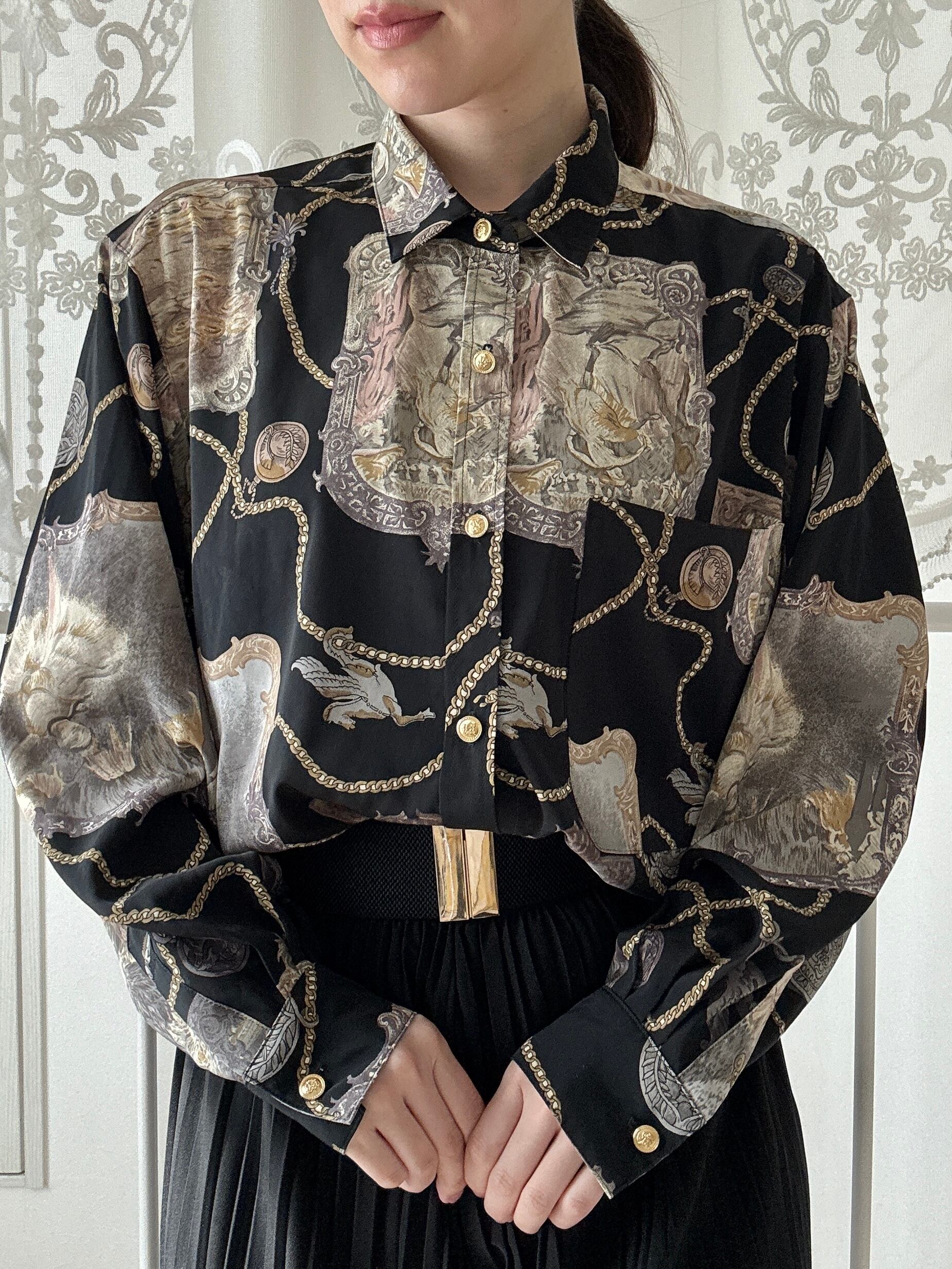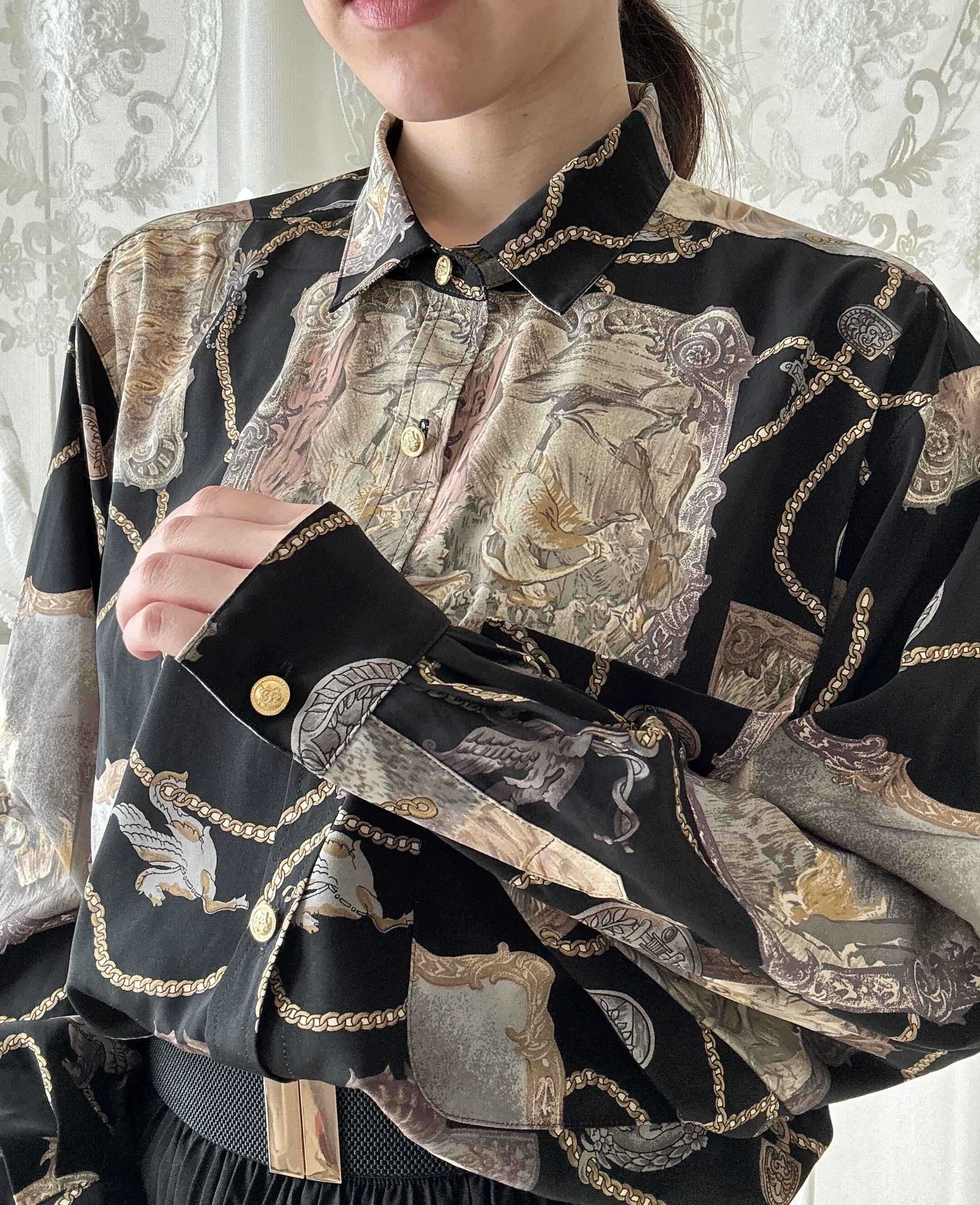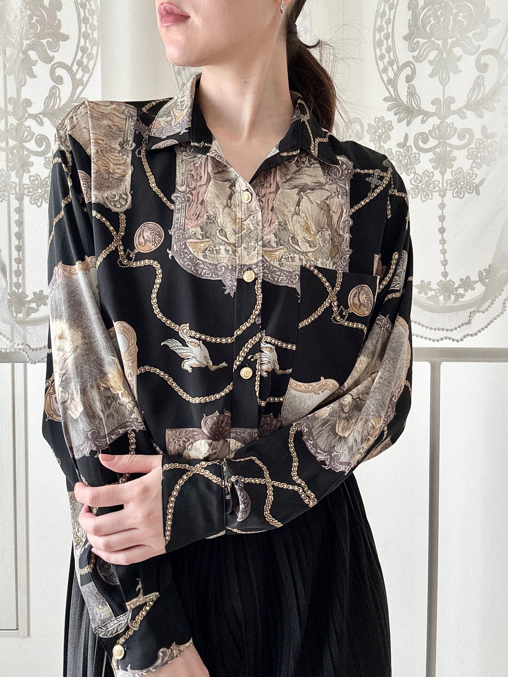 #アンティーク調ブラウス #クラシカルシャツ #アートプリント #ゴールドボタン #ヴィンテージトップス #ヨーロッパ古着 #クラシカルガーリー #モードブラウス #黒シャツ #レトロ柄