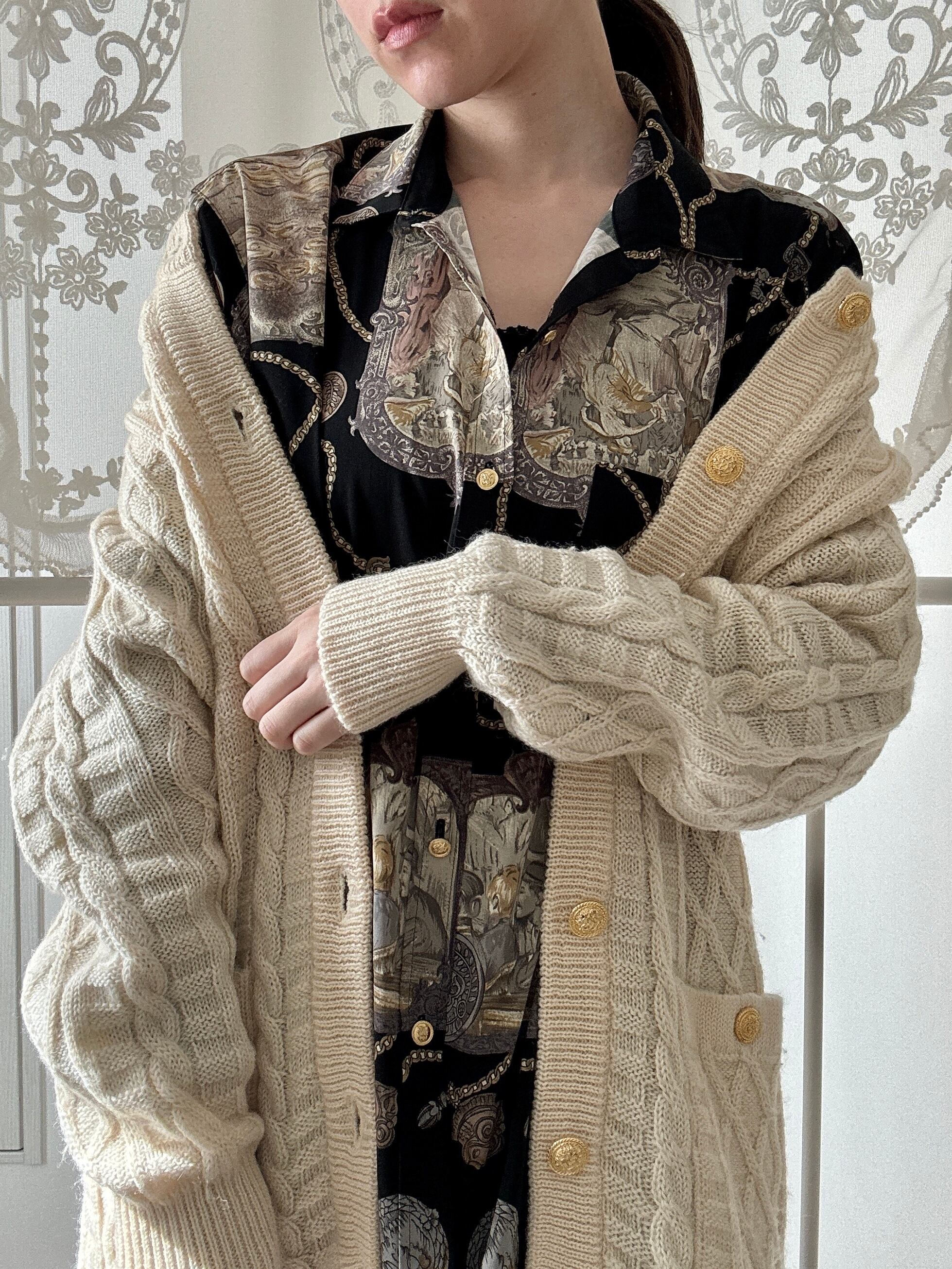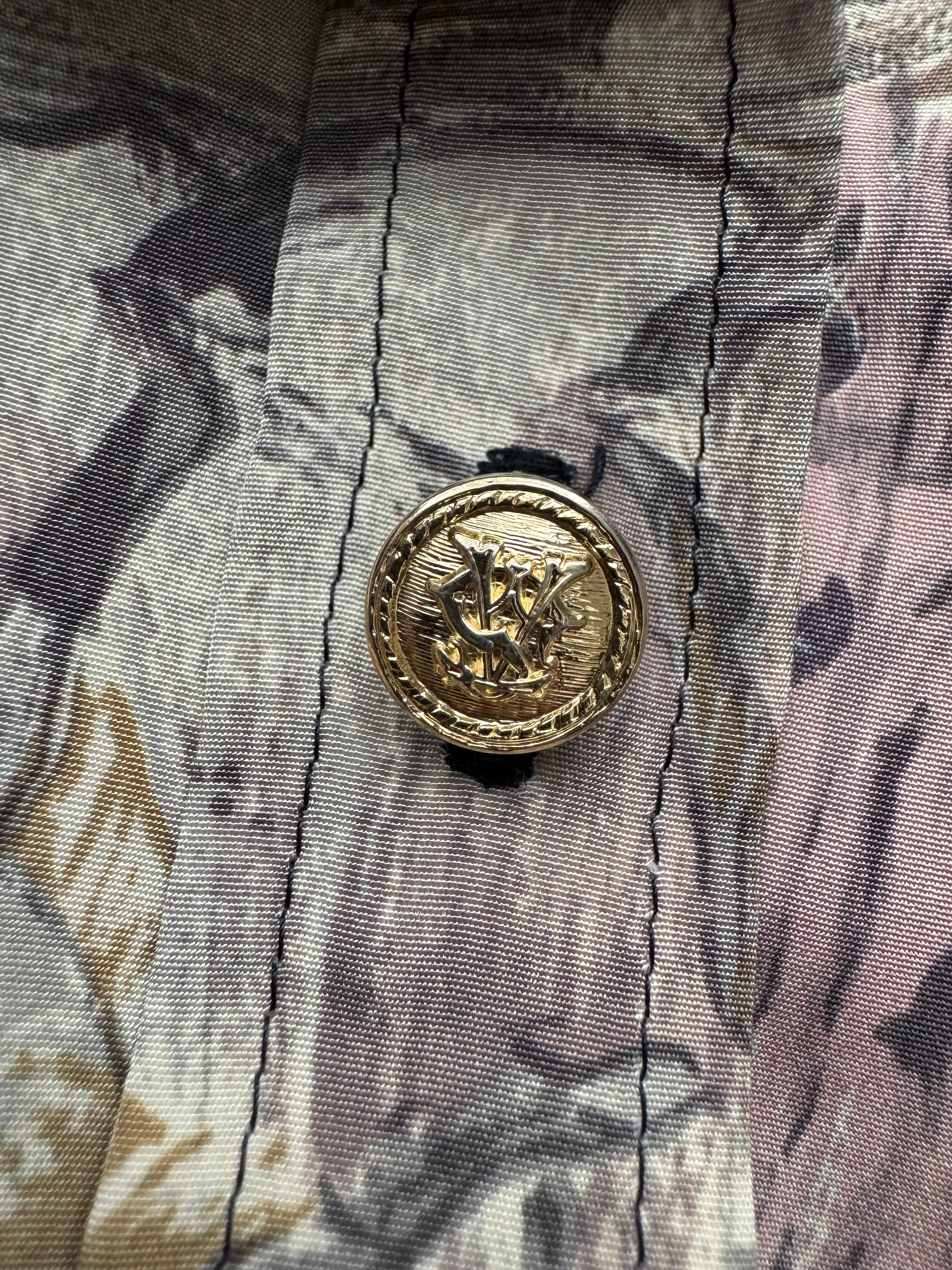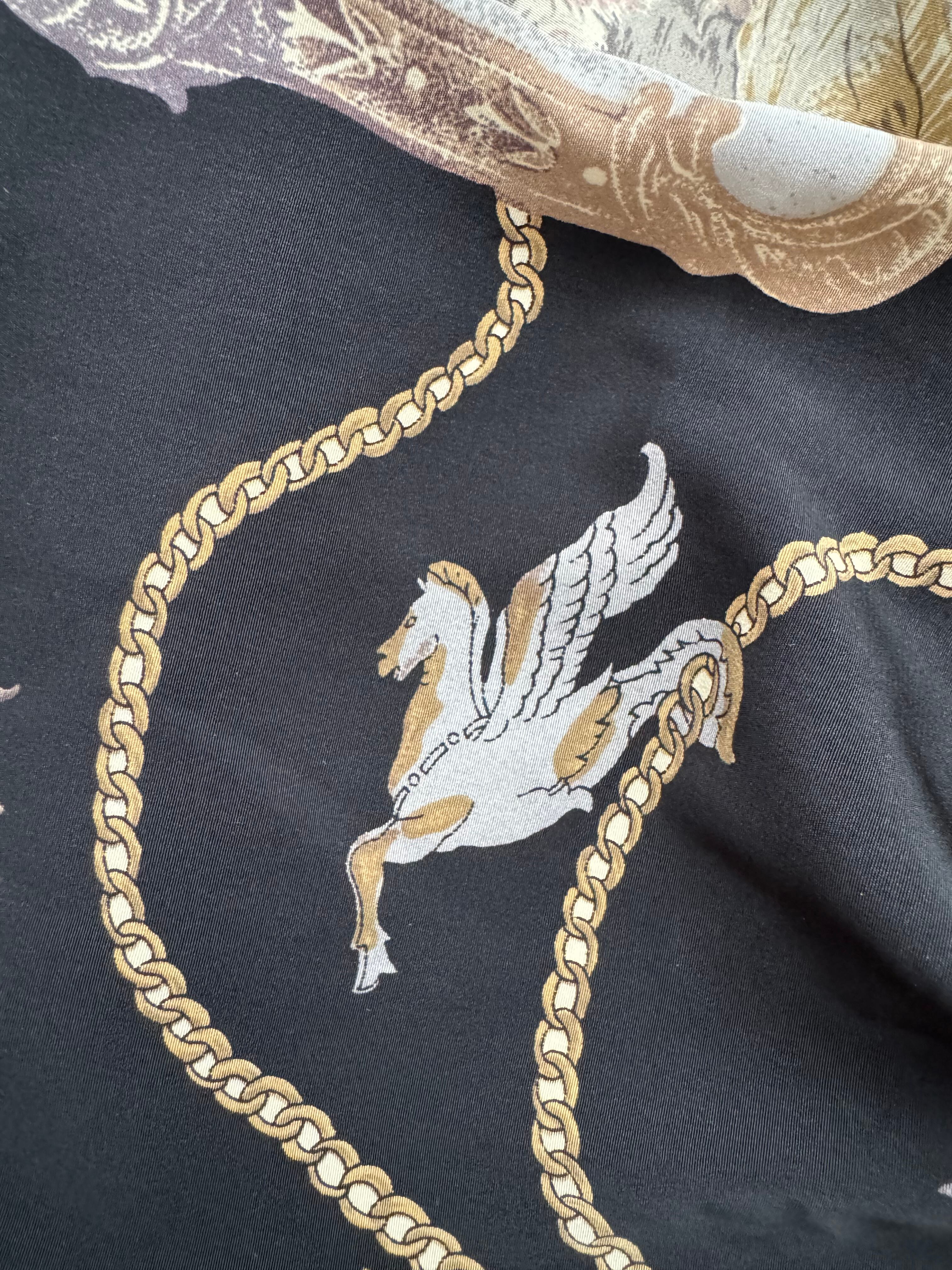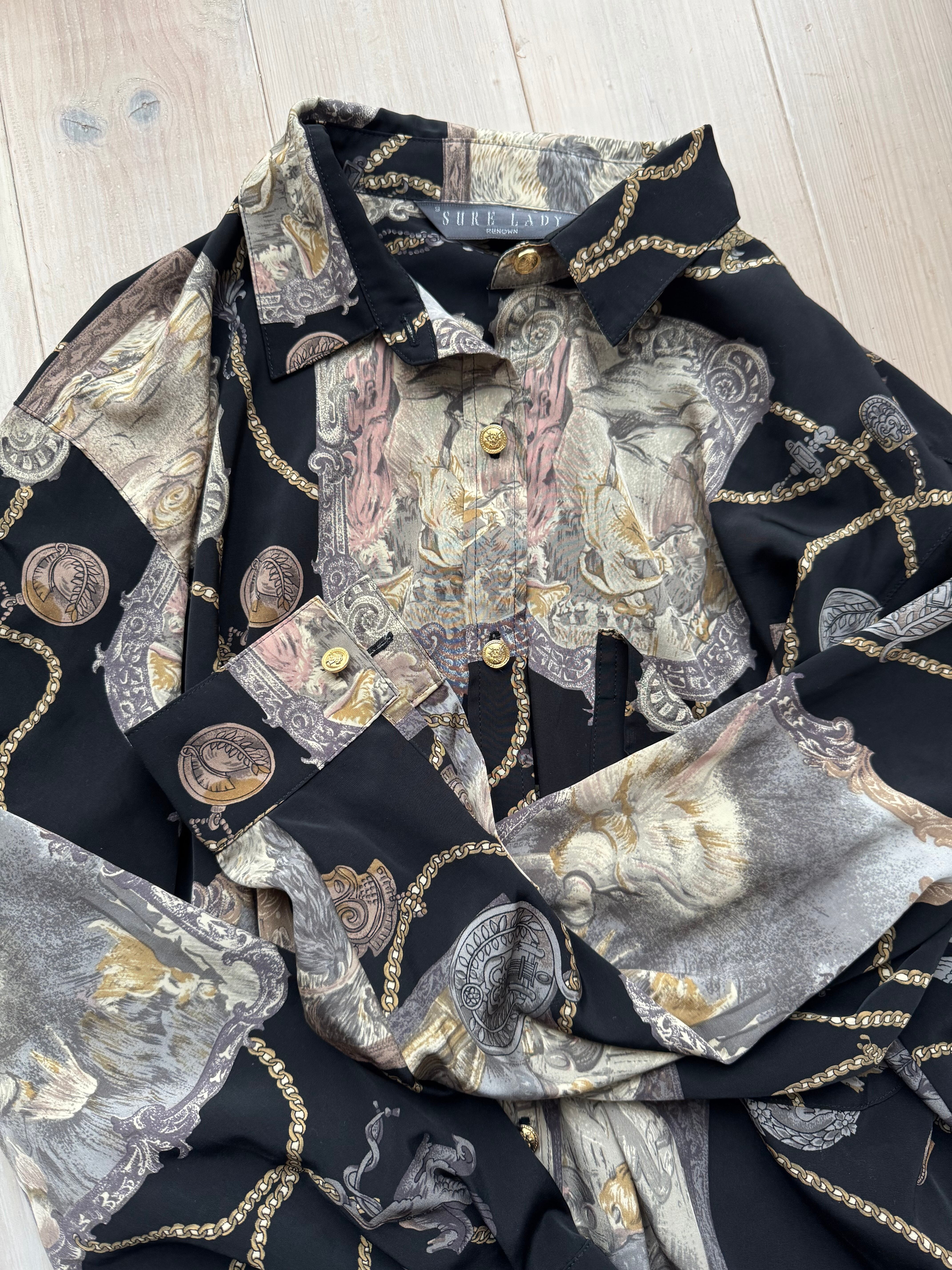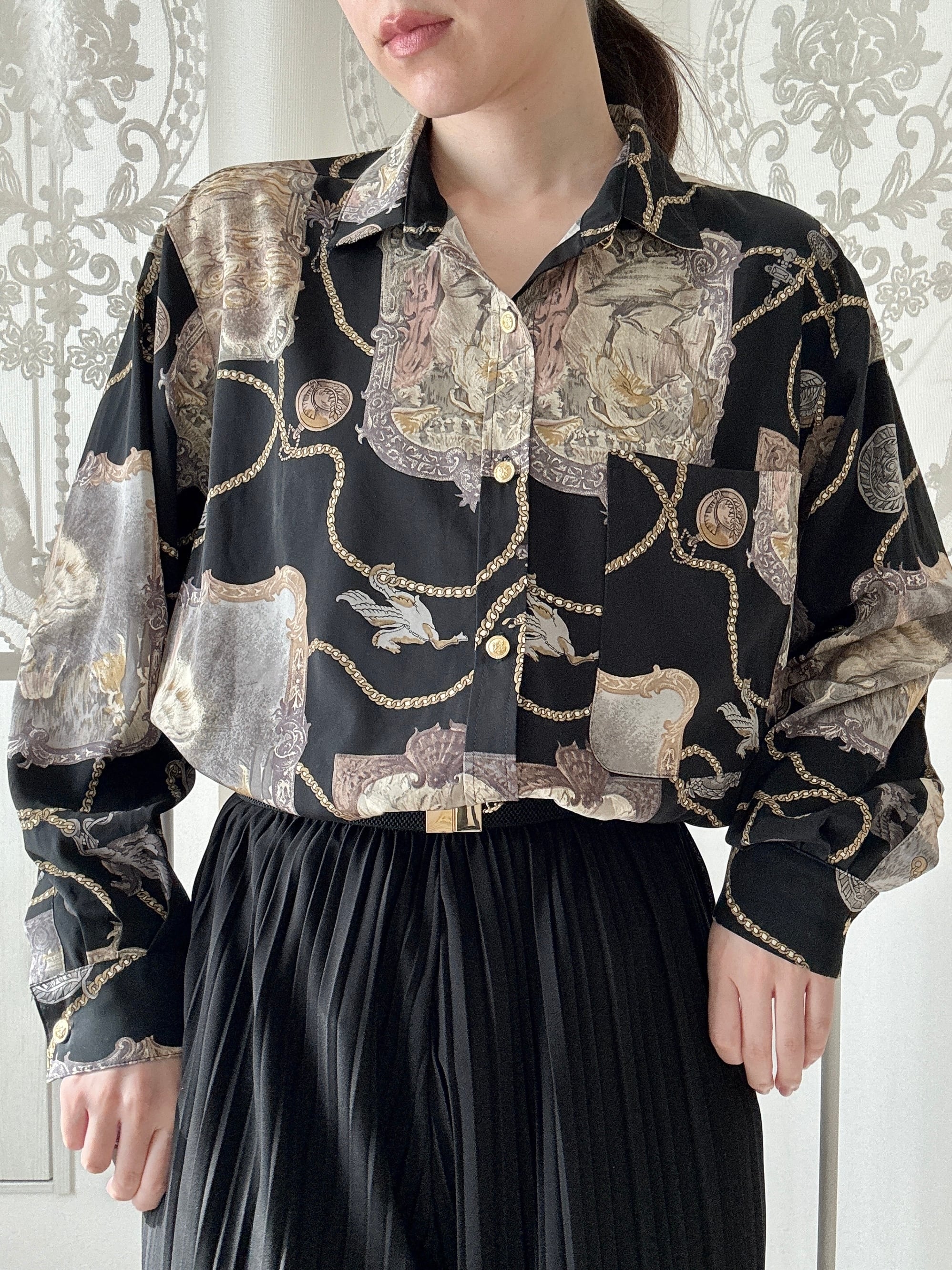 #アンティーク調ブラウス #クラシカルシャツ #アートプリント #ゴールドボタン #ヴィンテージトップス #ヨーロッパ古着 #クラシカルガーリー #モードブラウス #黒シャツ #レトロ柄