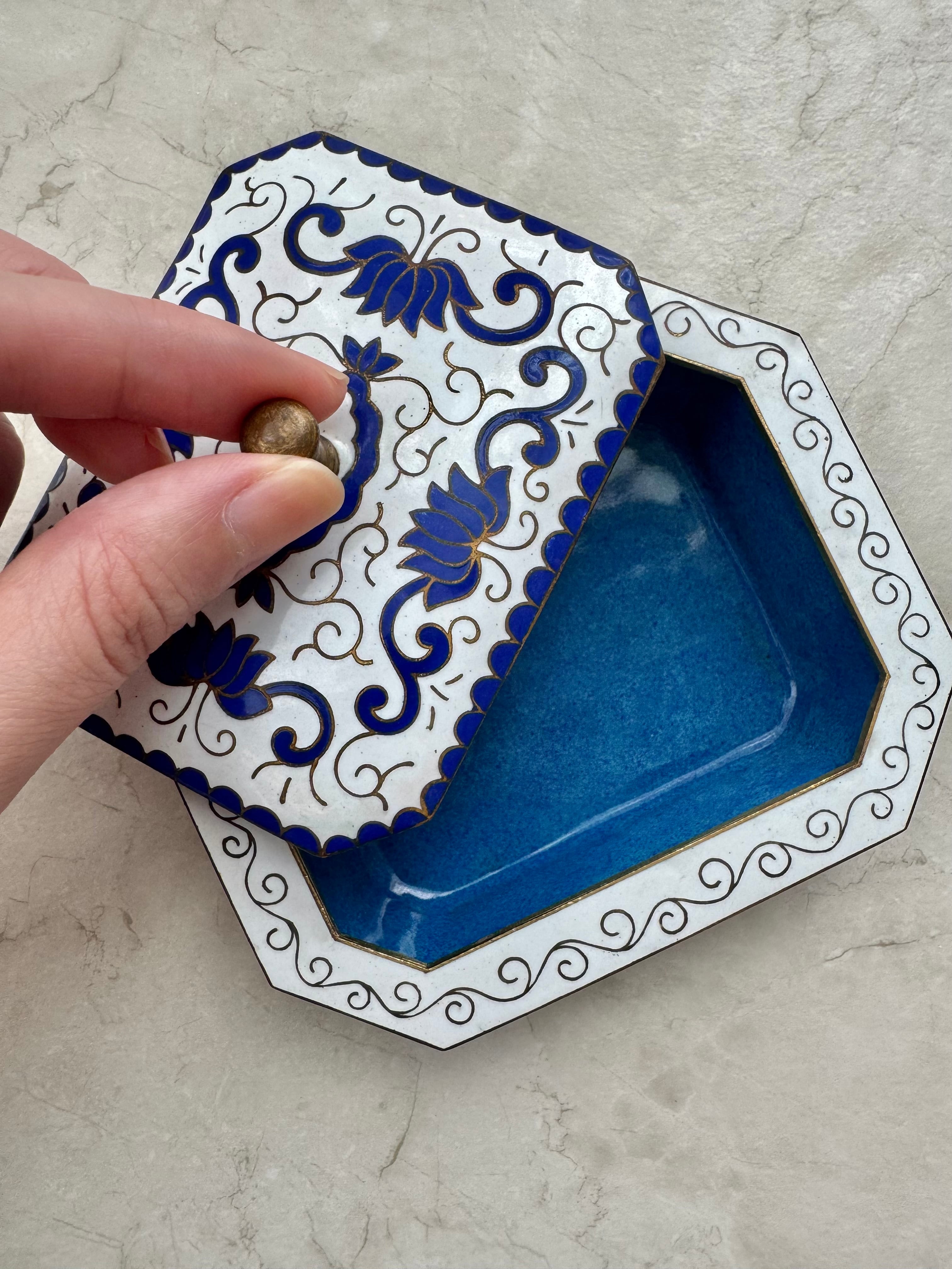 1589. インド 七宝焼き風ミーナカリ小物入れ/ホワイト×ブルー八角形ジュエリーボックス/ヴィンテージ雑貨・小箱