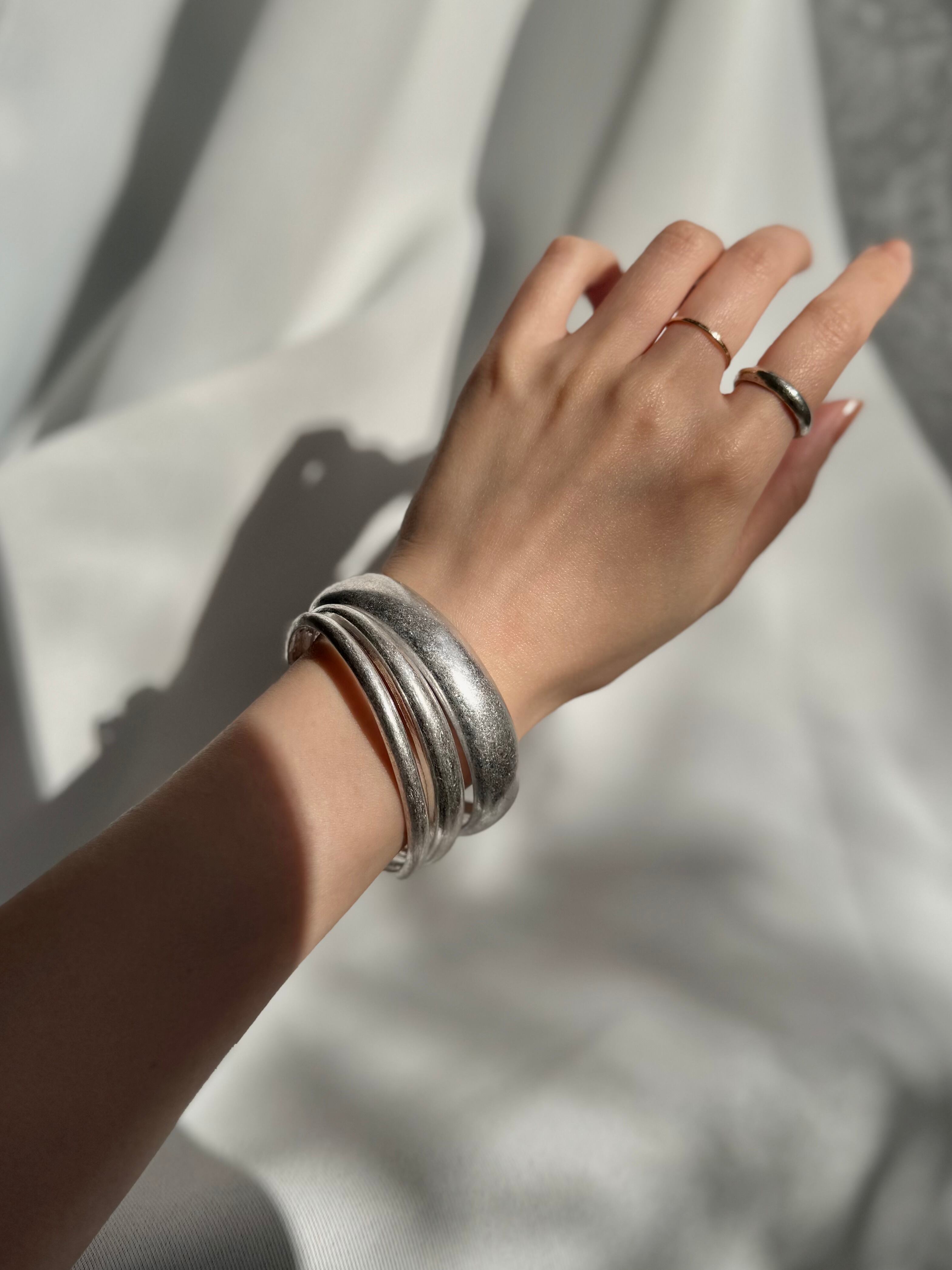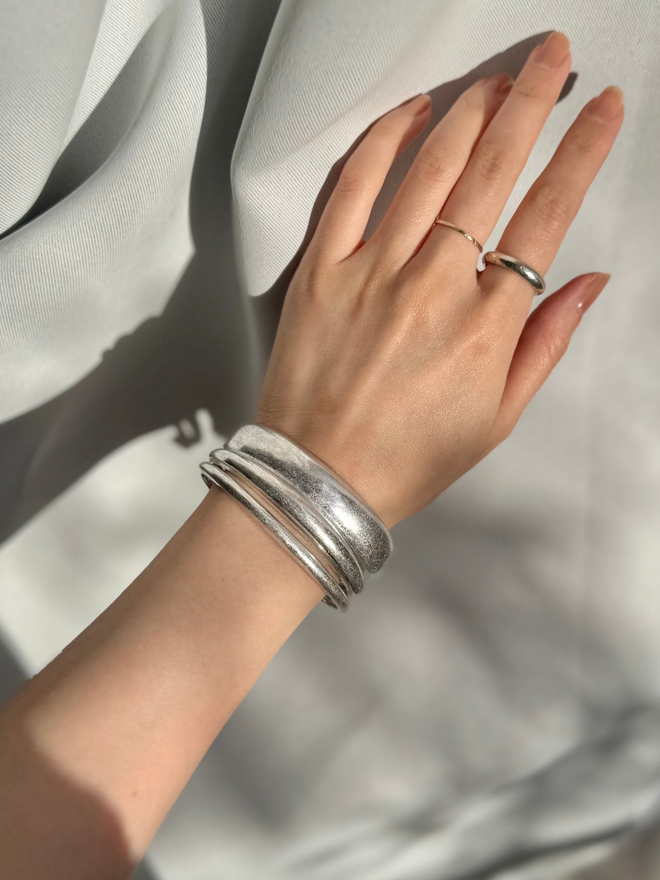 影が落ちた瞬間にこそ、このバングルの美しさが際立ちます。