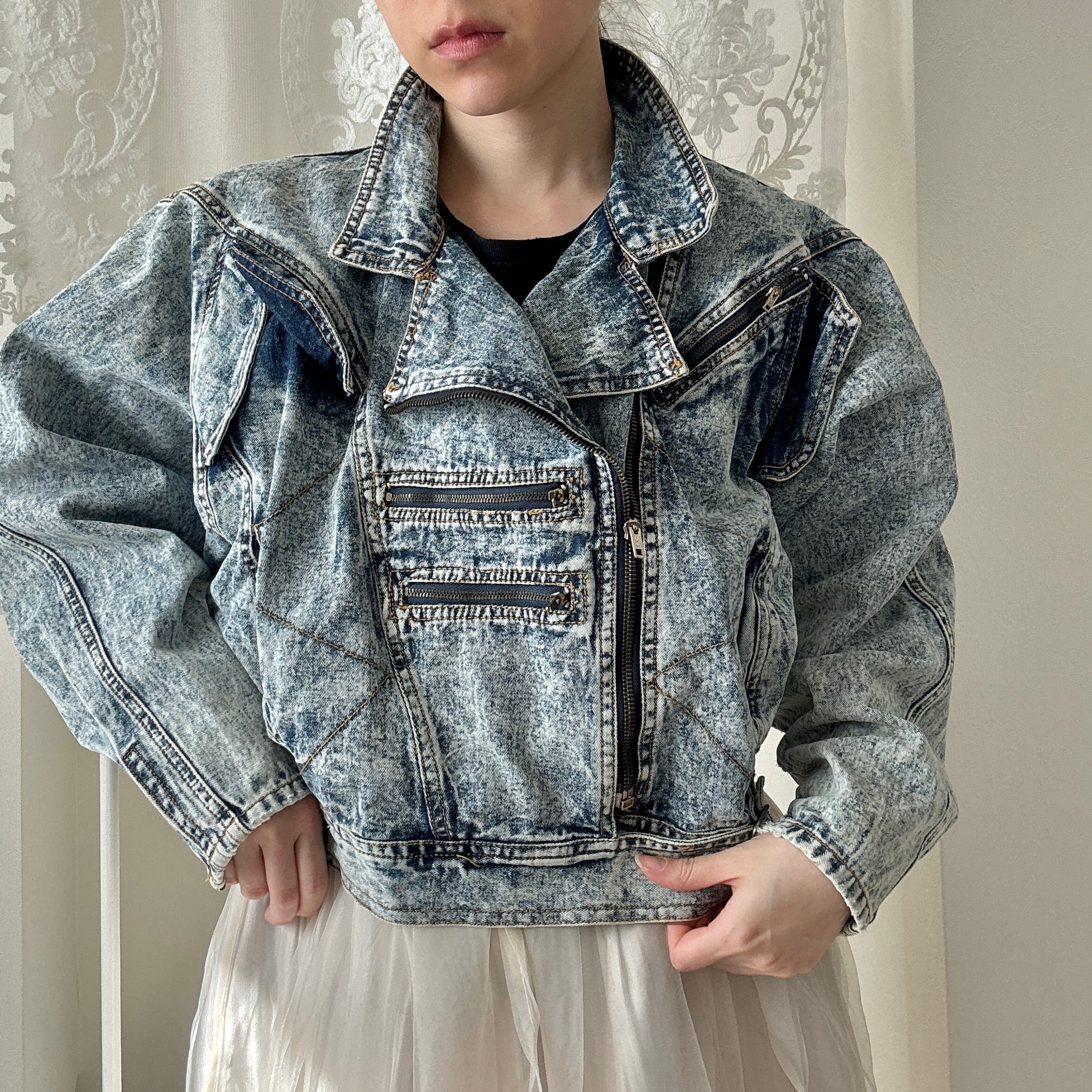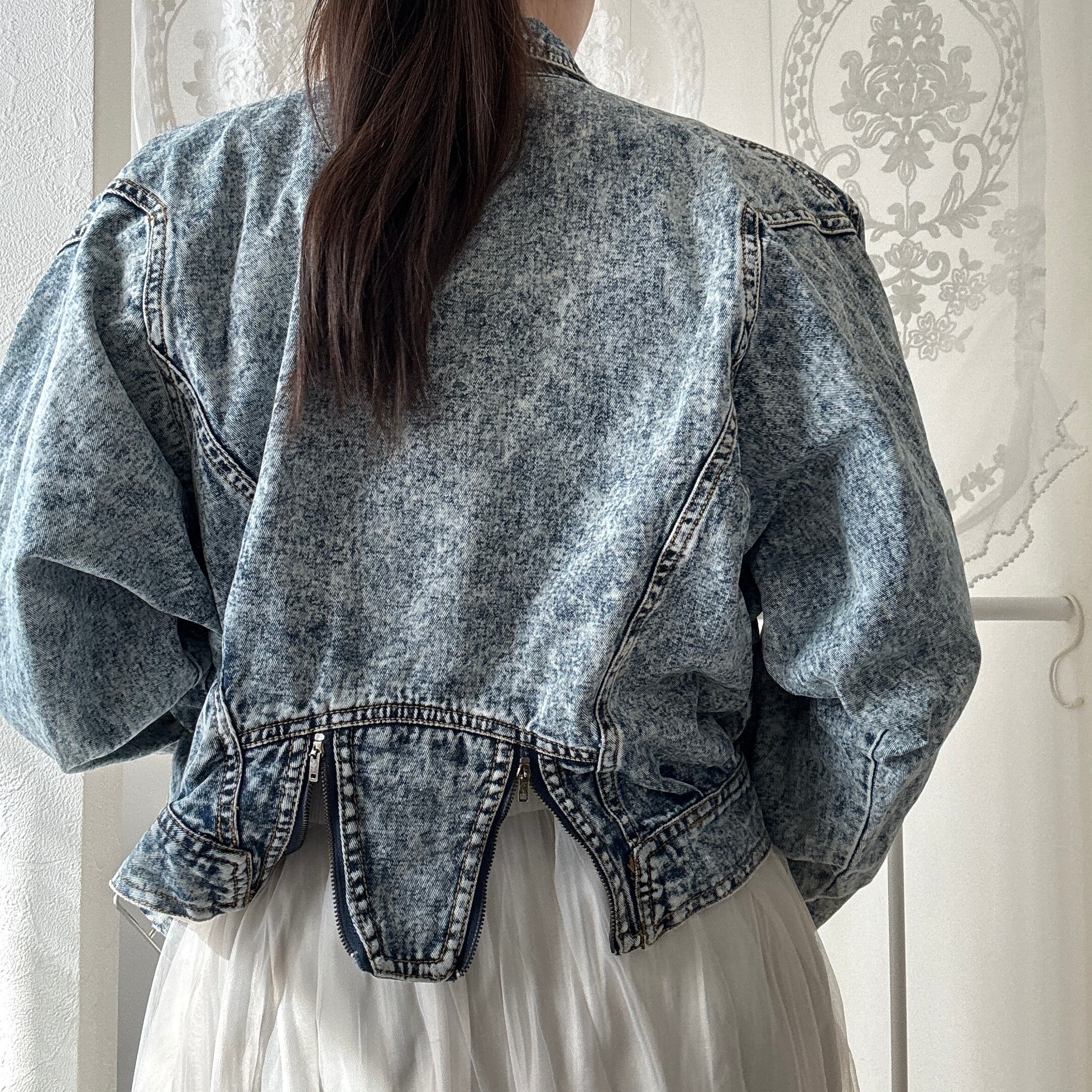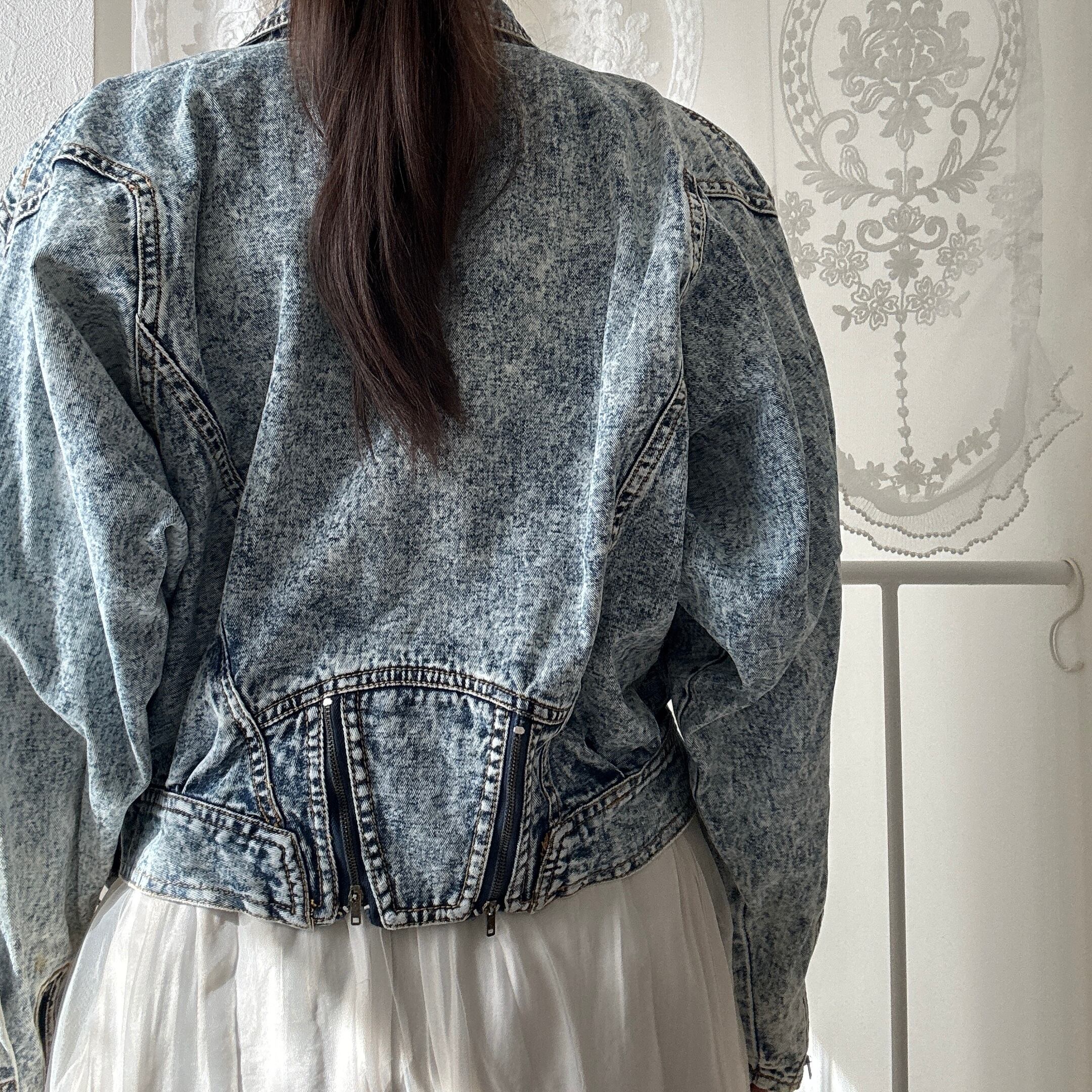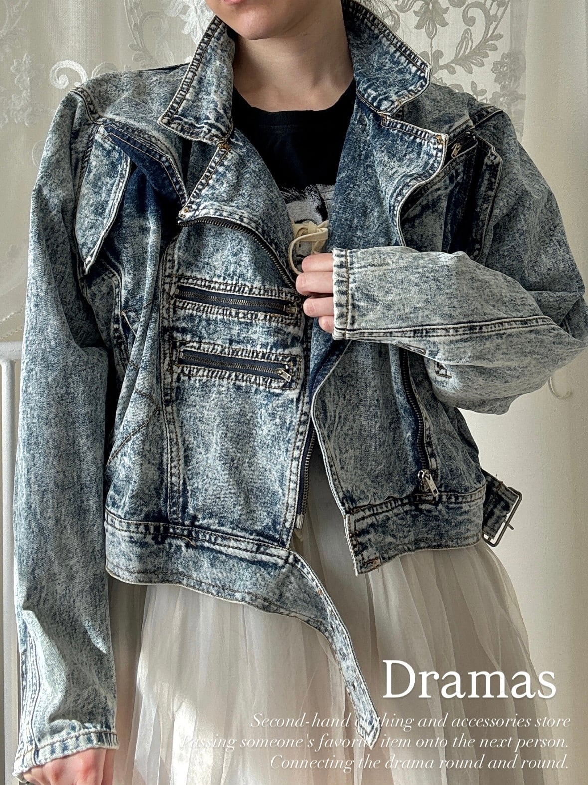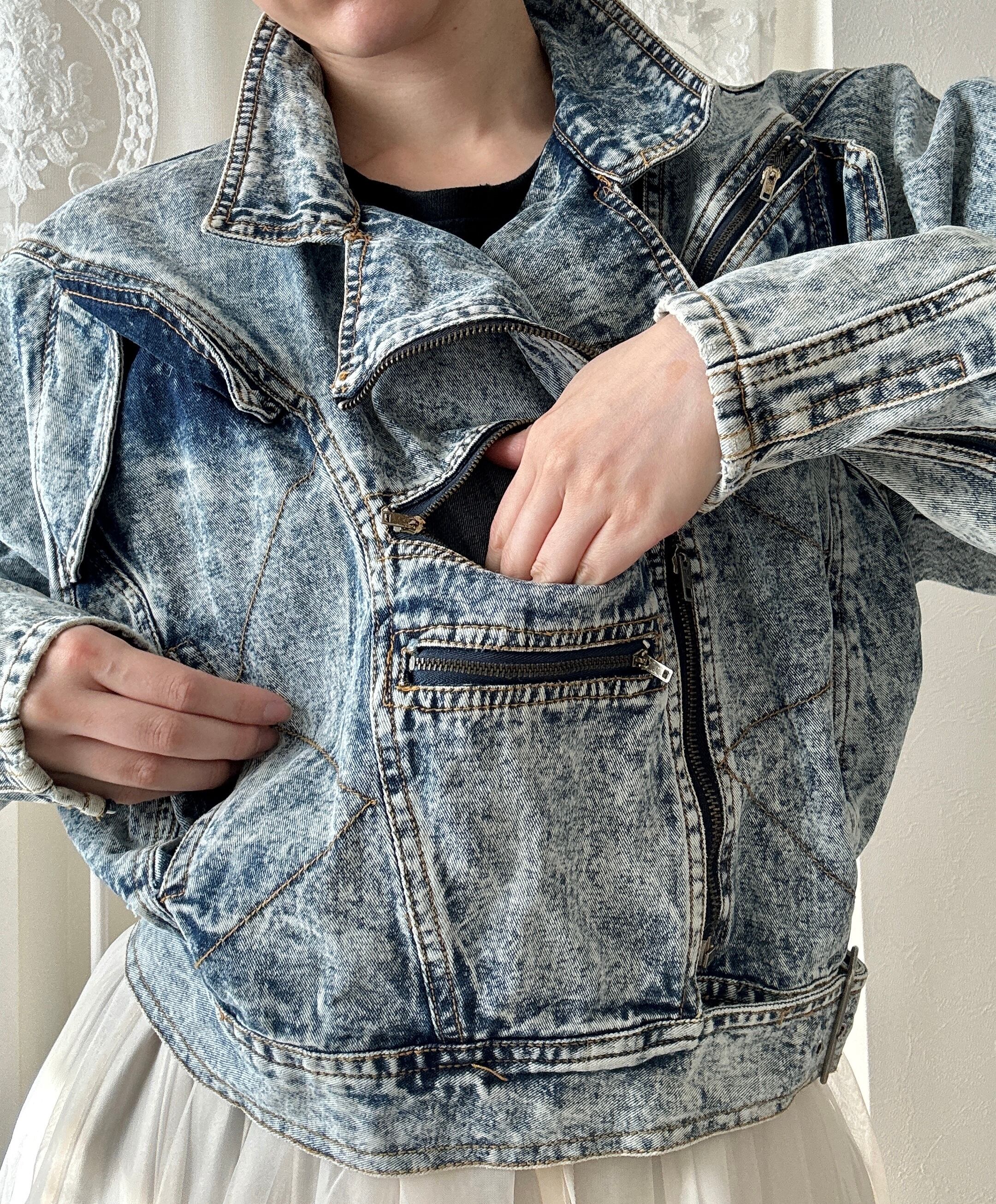 1505. ケミカルウォッシュ デニム ライダースジャケット|ショート丈 多ジップデザイン ロックファスナー ヴィンテージ