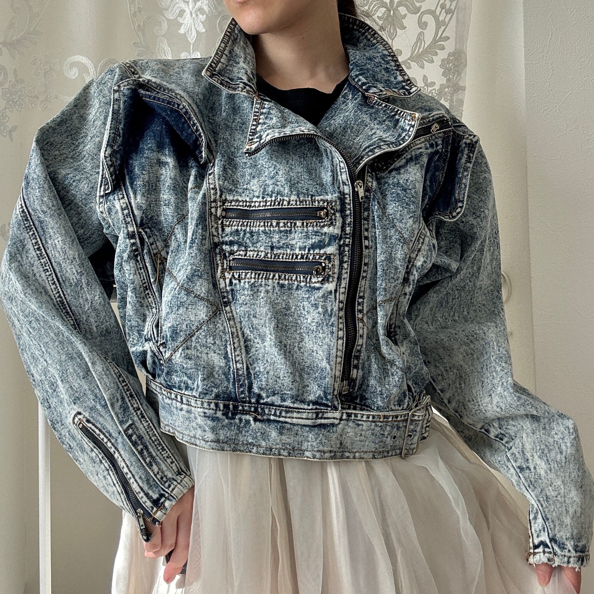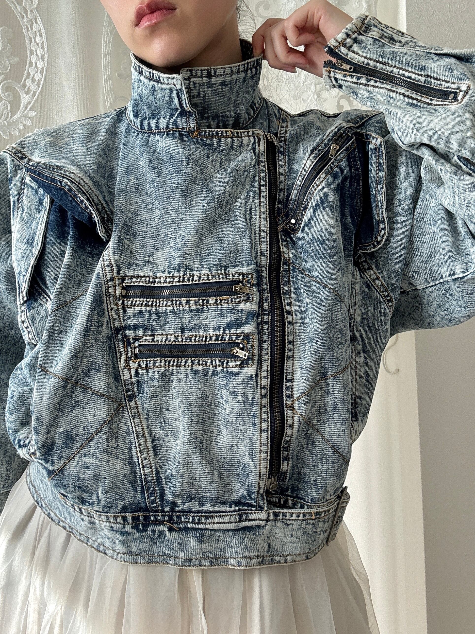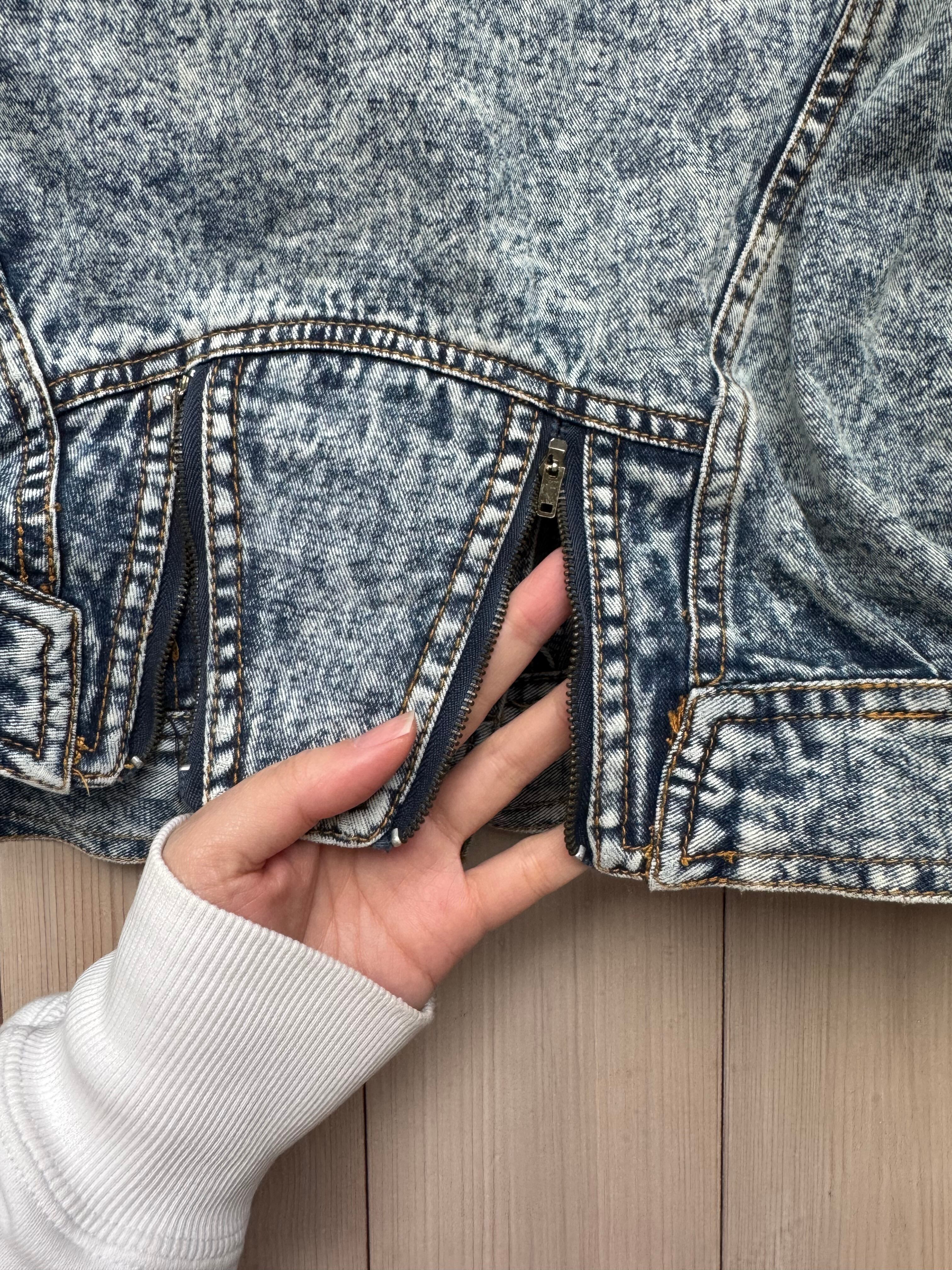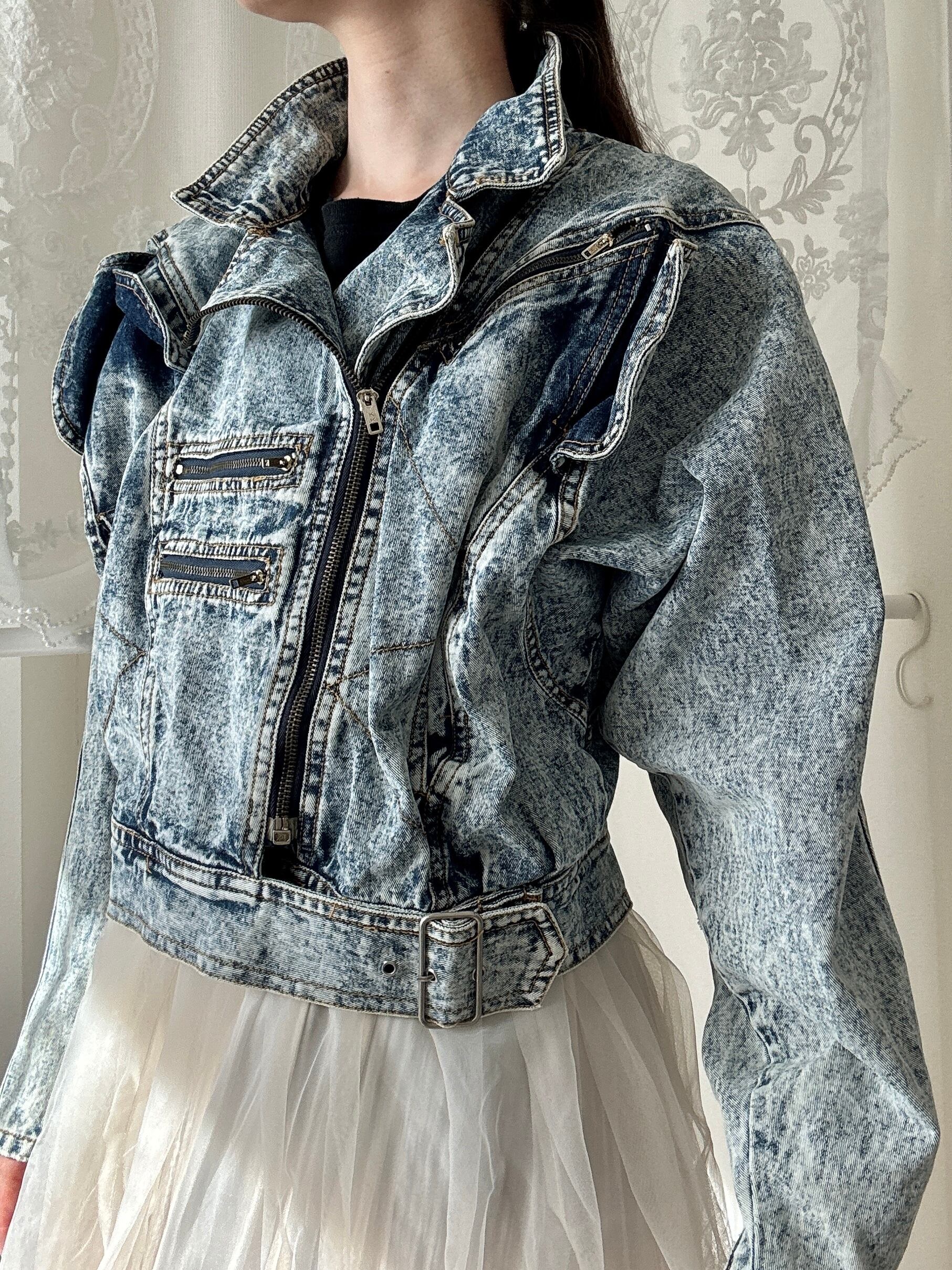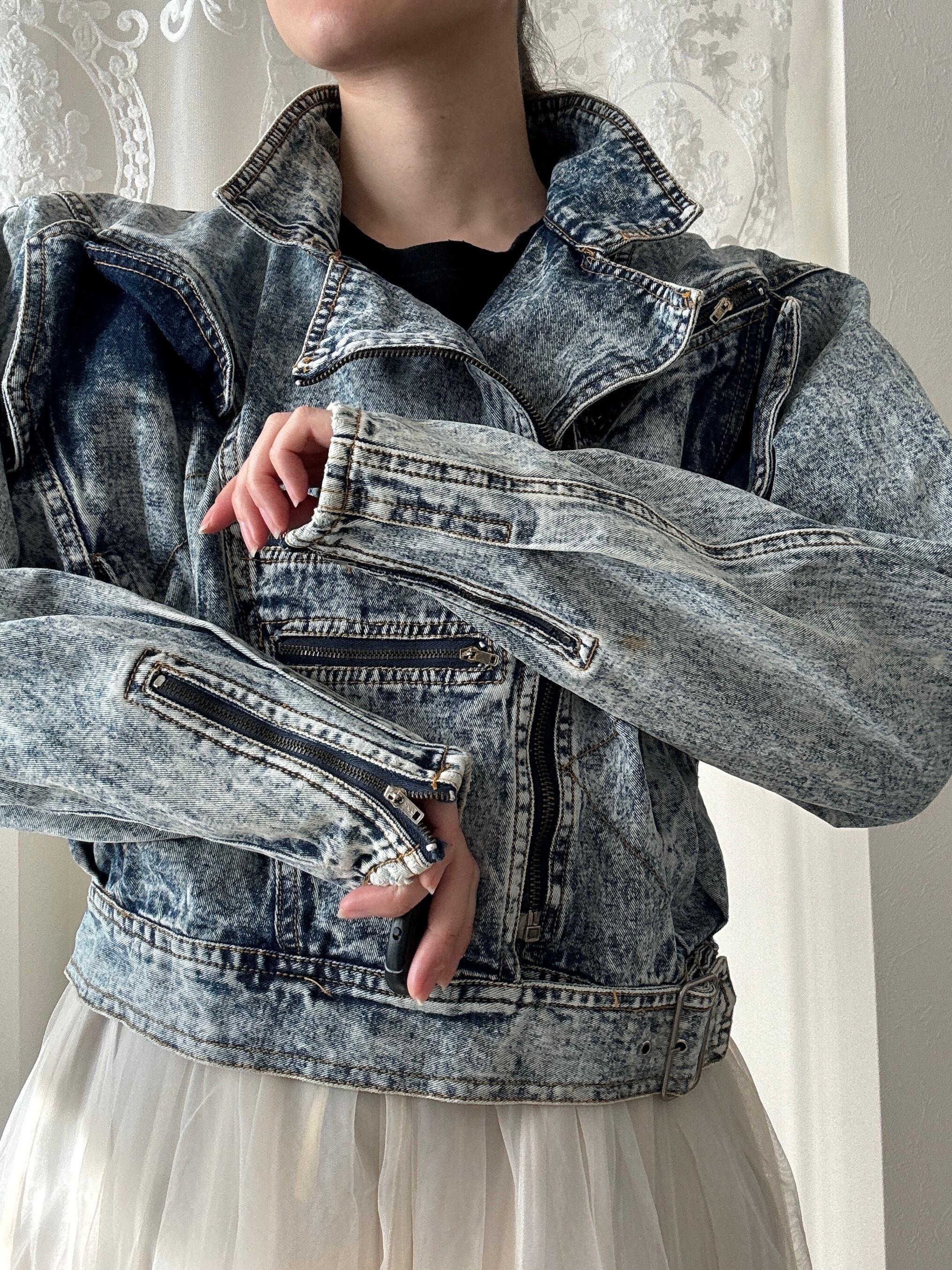 1505. ケミカルウォッシュ デニム ライダースジャケット|ショート丈 多ジップデザイン ロックファスナー ヴィンテージ