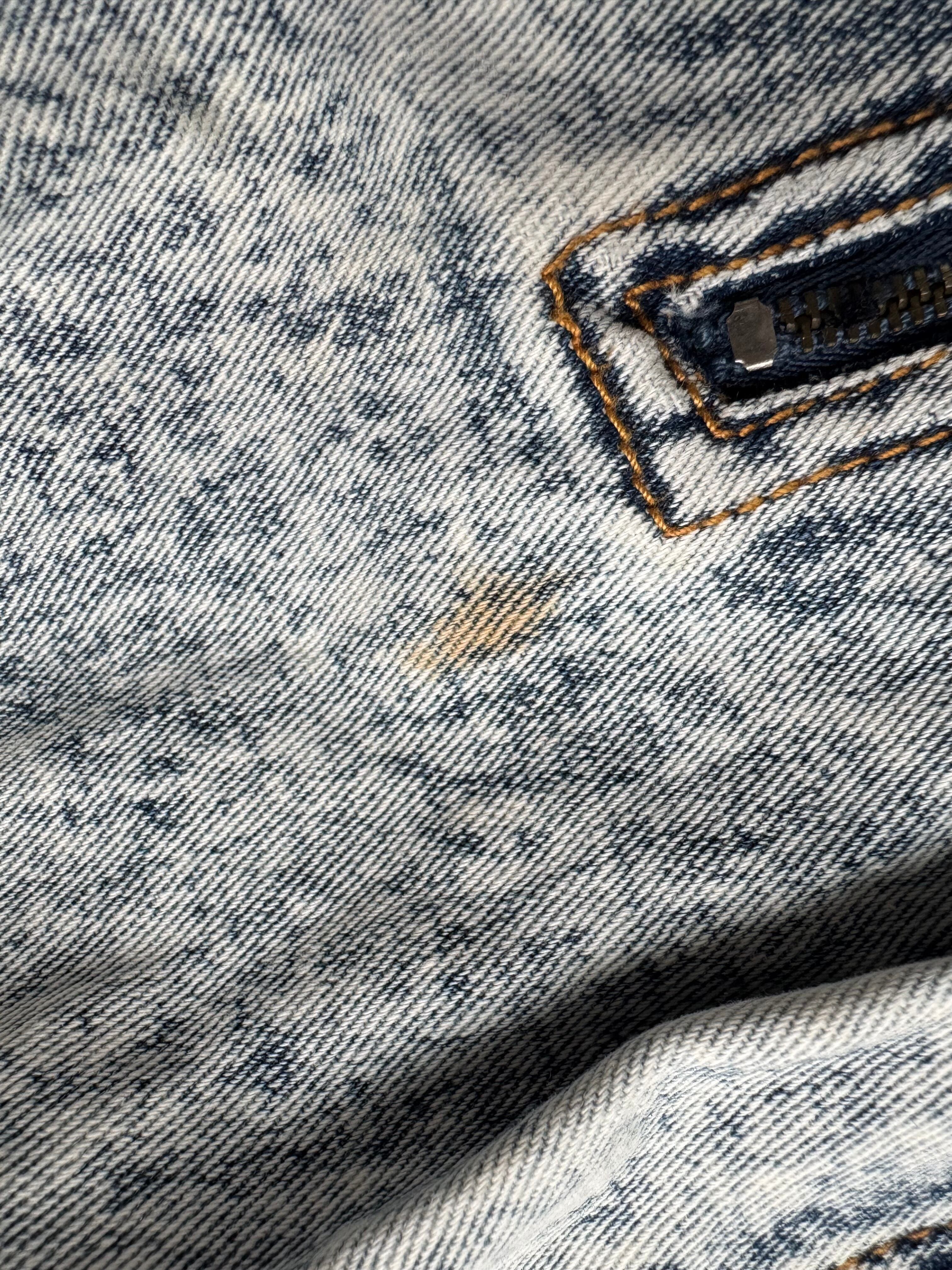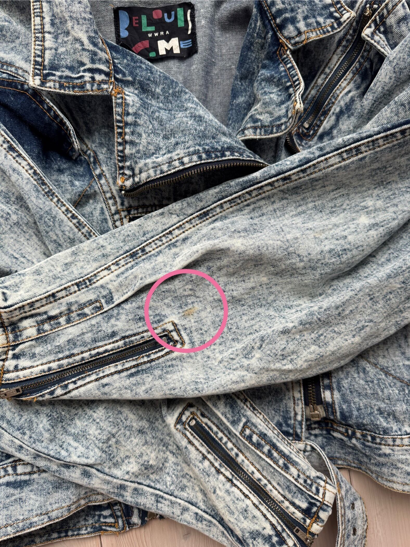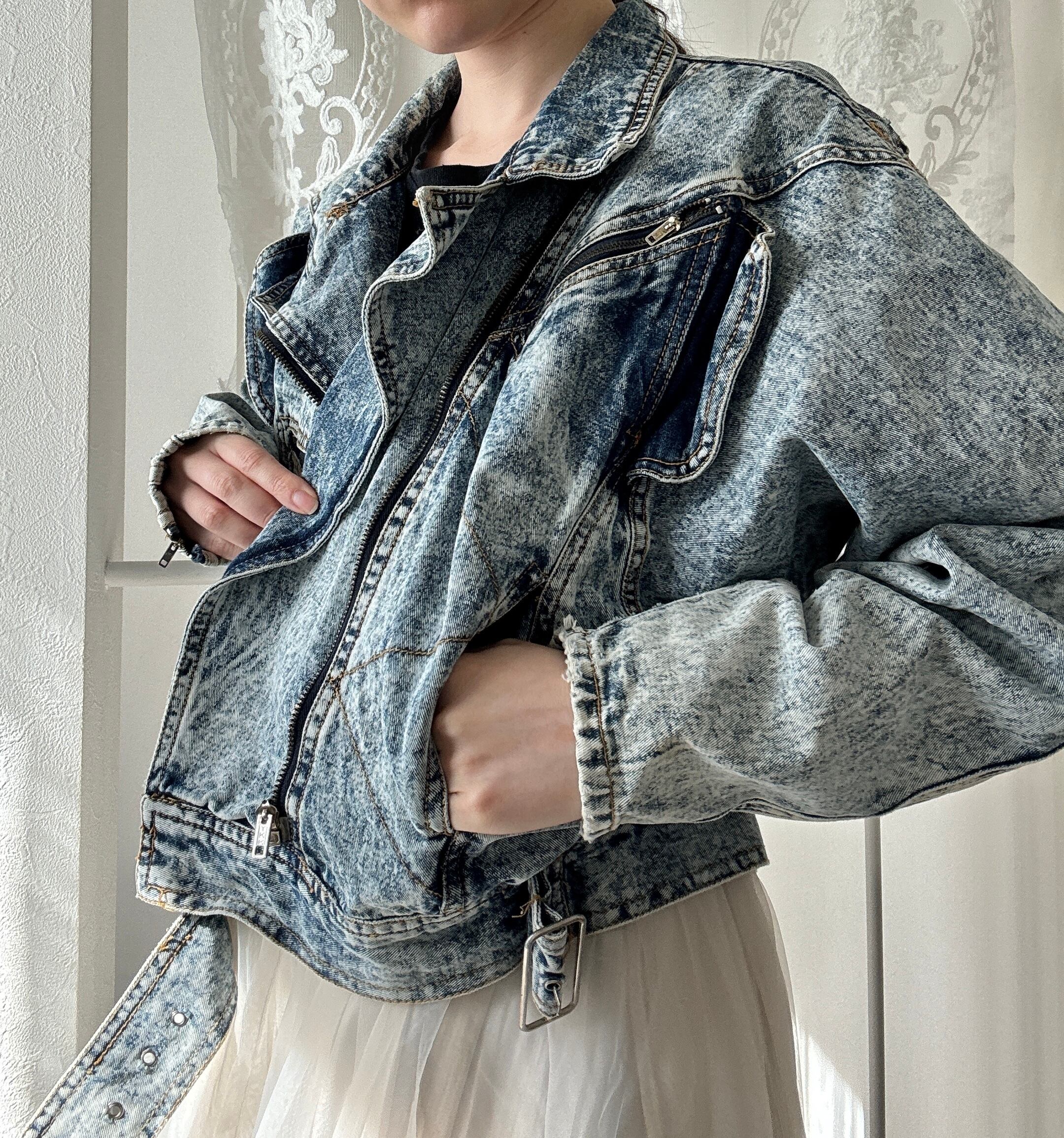 ケミカルウォッシュの色落ちが印象的な、デニムライダースジャケットです。