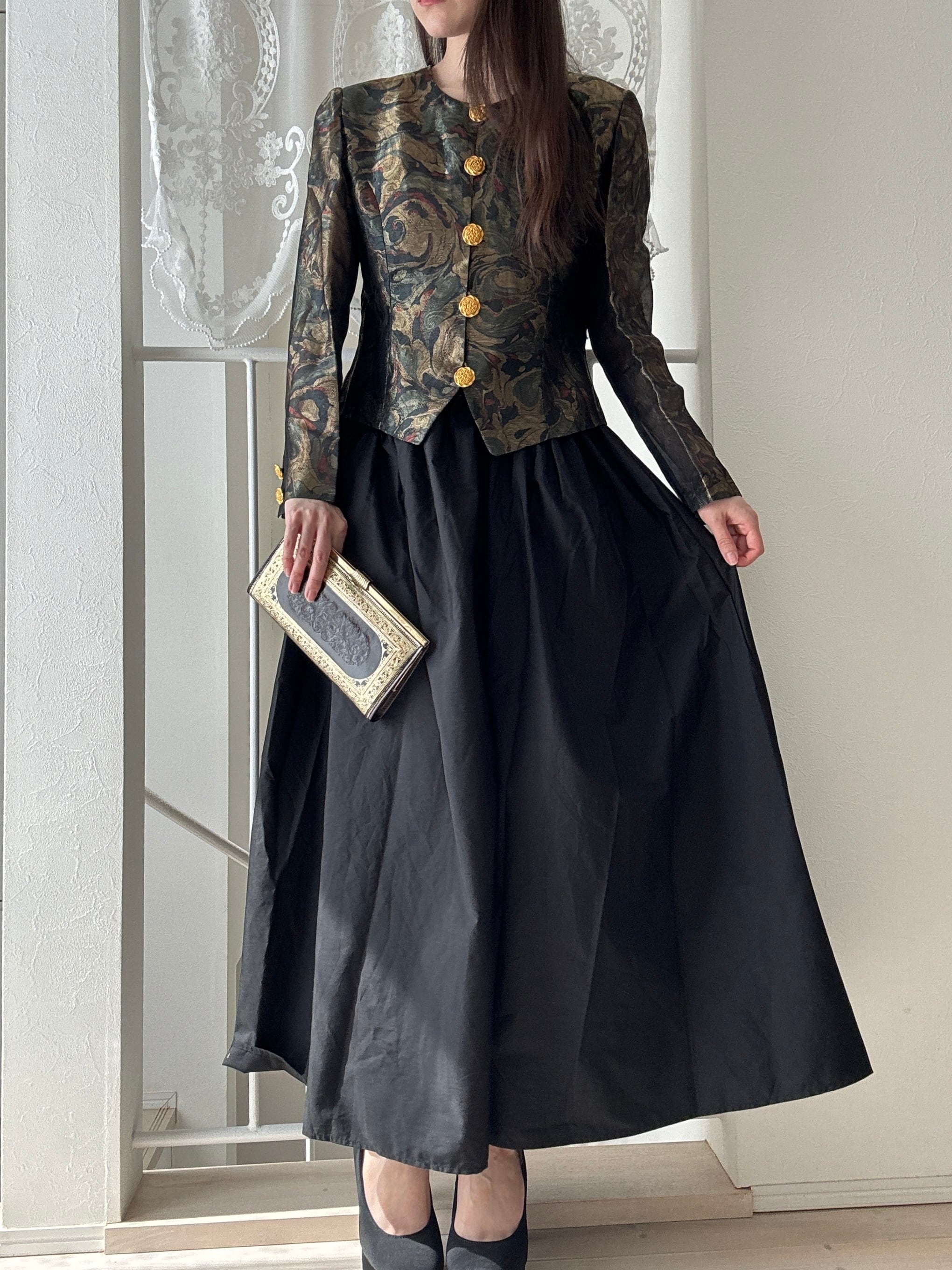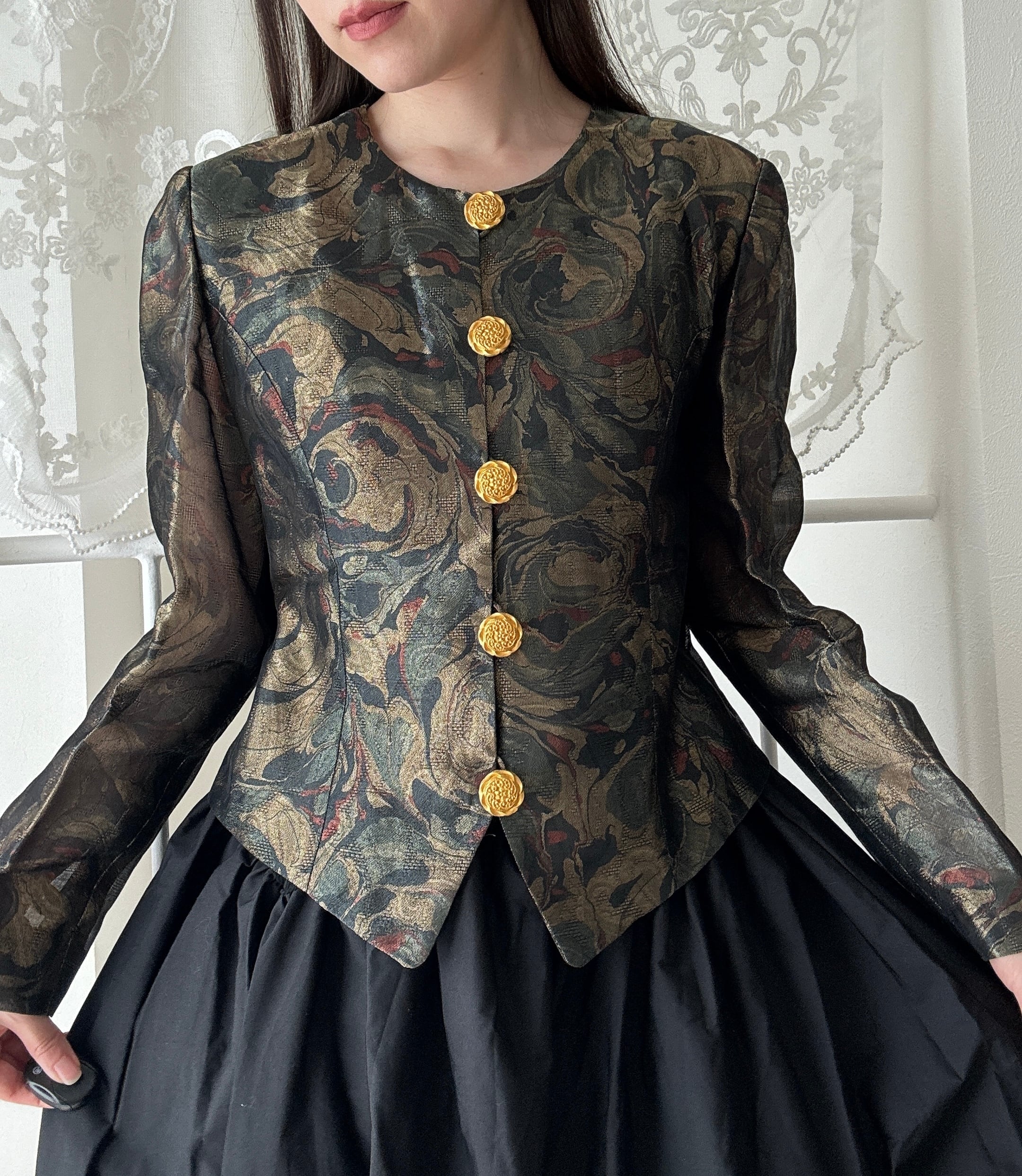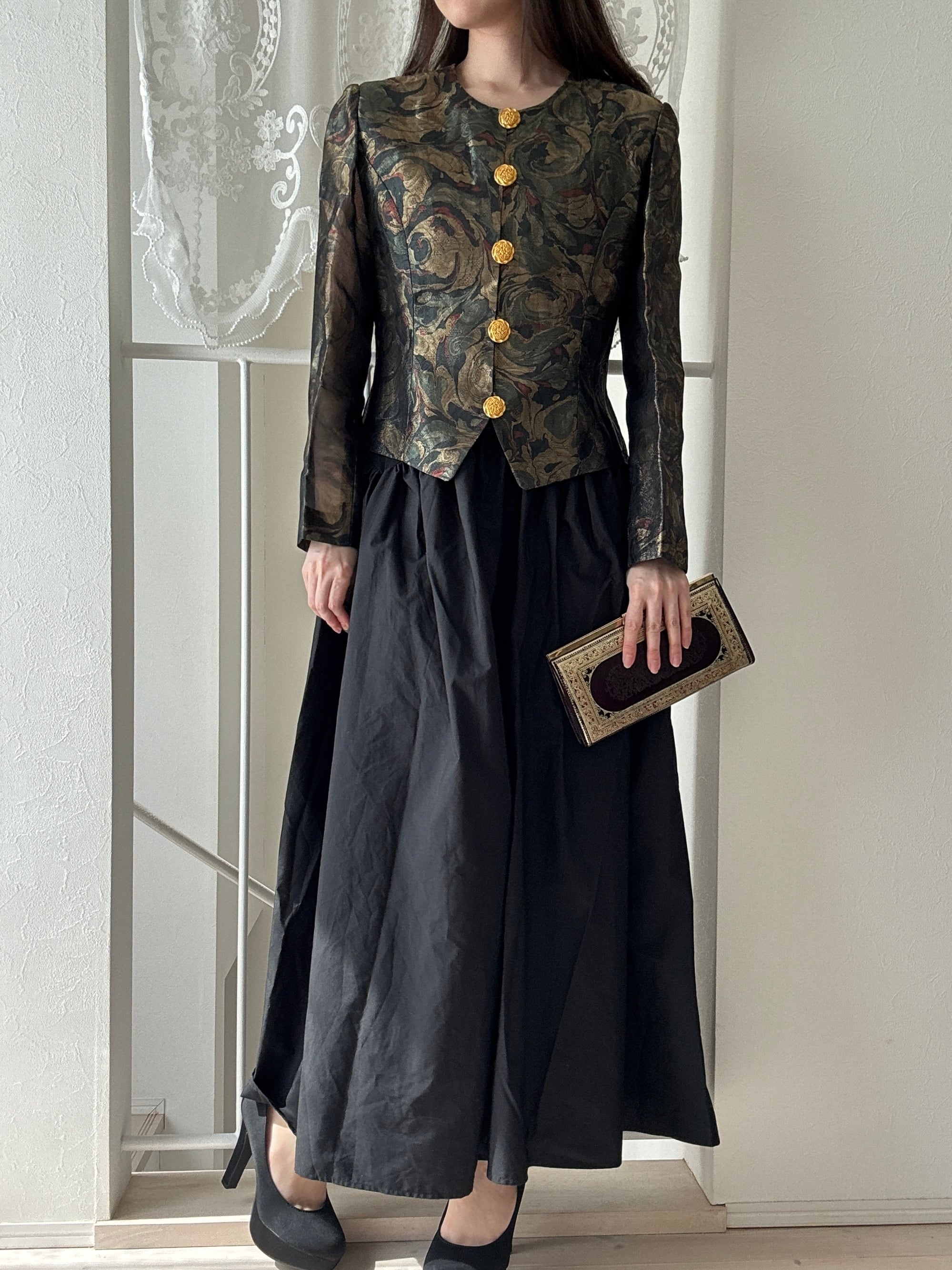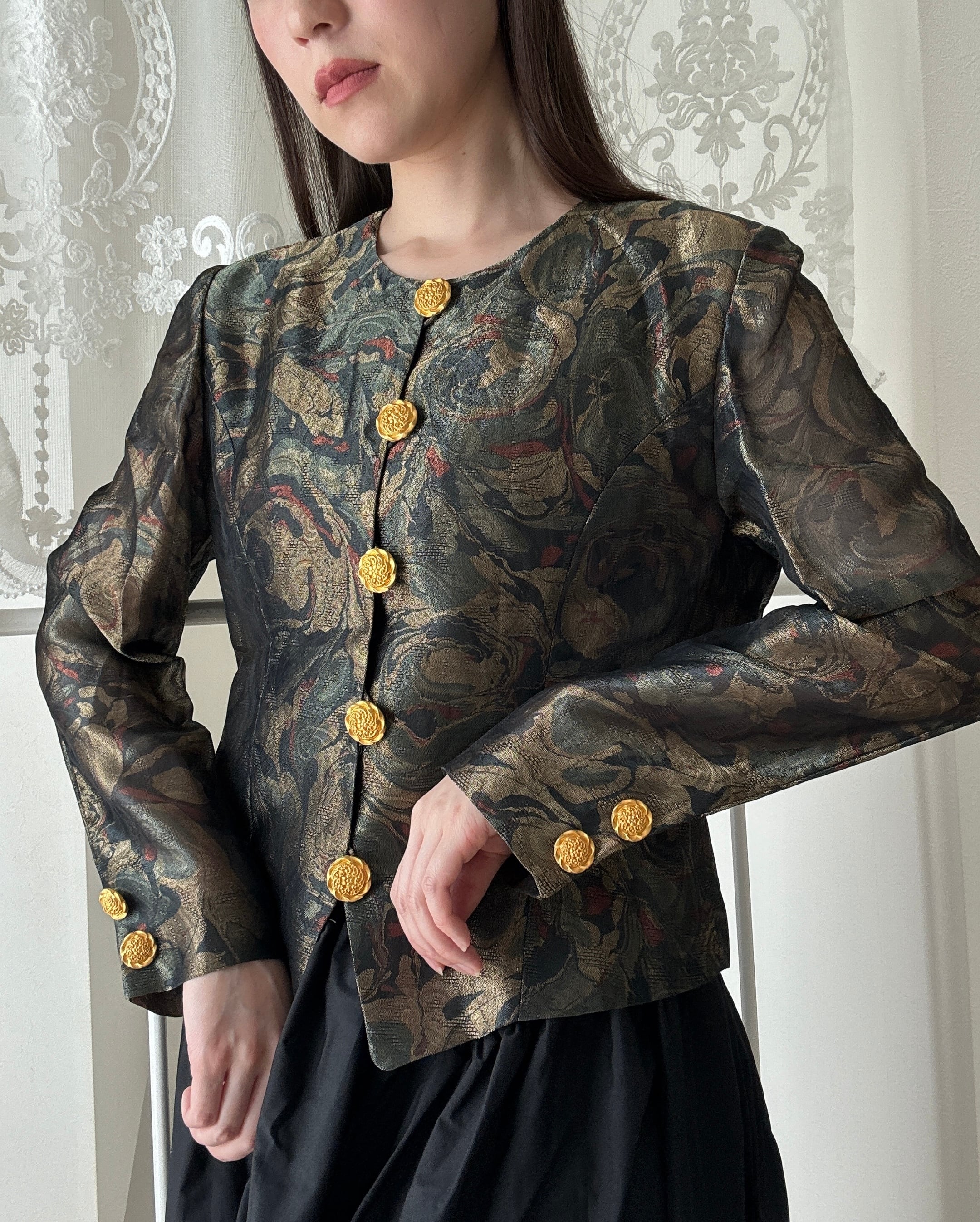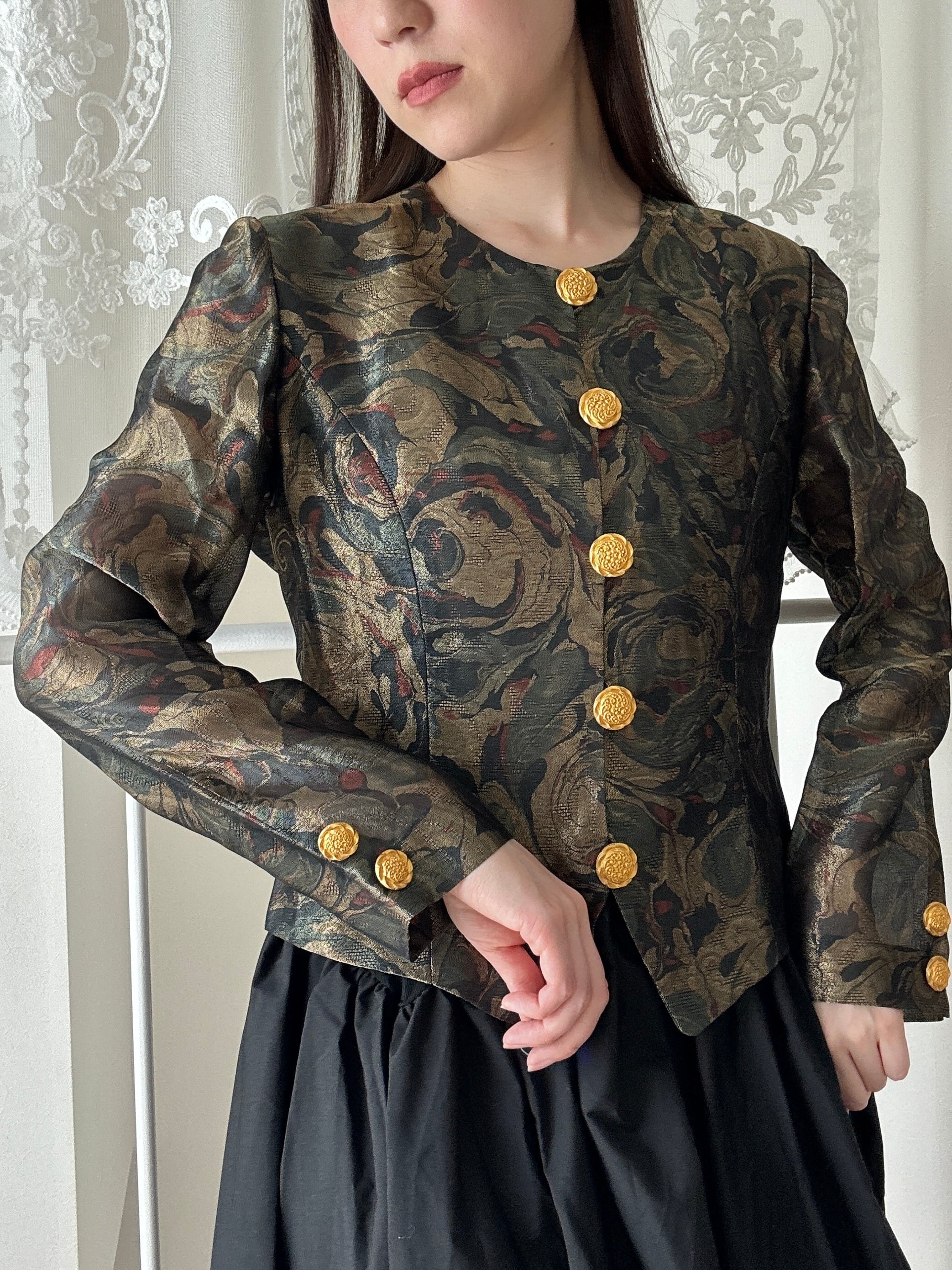 1507. フランス生地使用 ゴールド装飾ボタン ラメ織りクラシカルジャケット / モスグリーン 日本製 ヴィンテージ