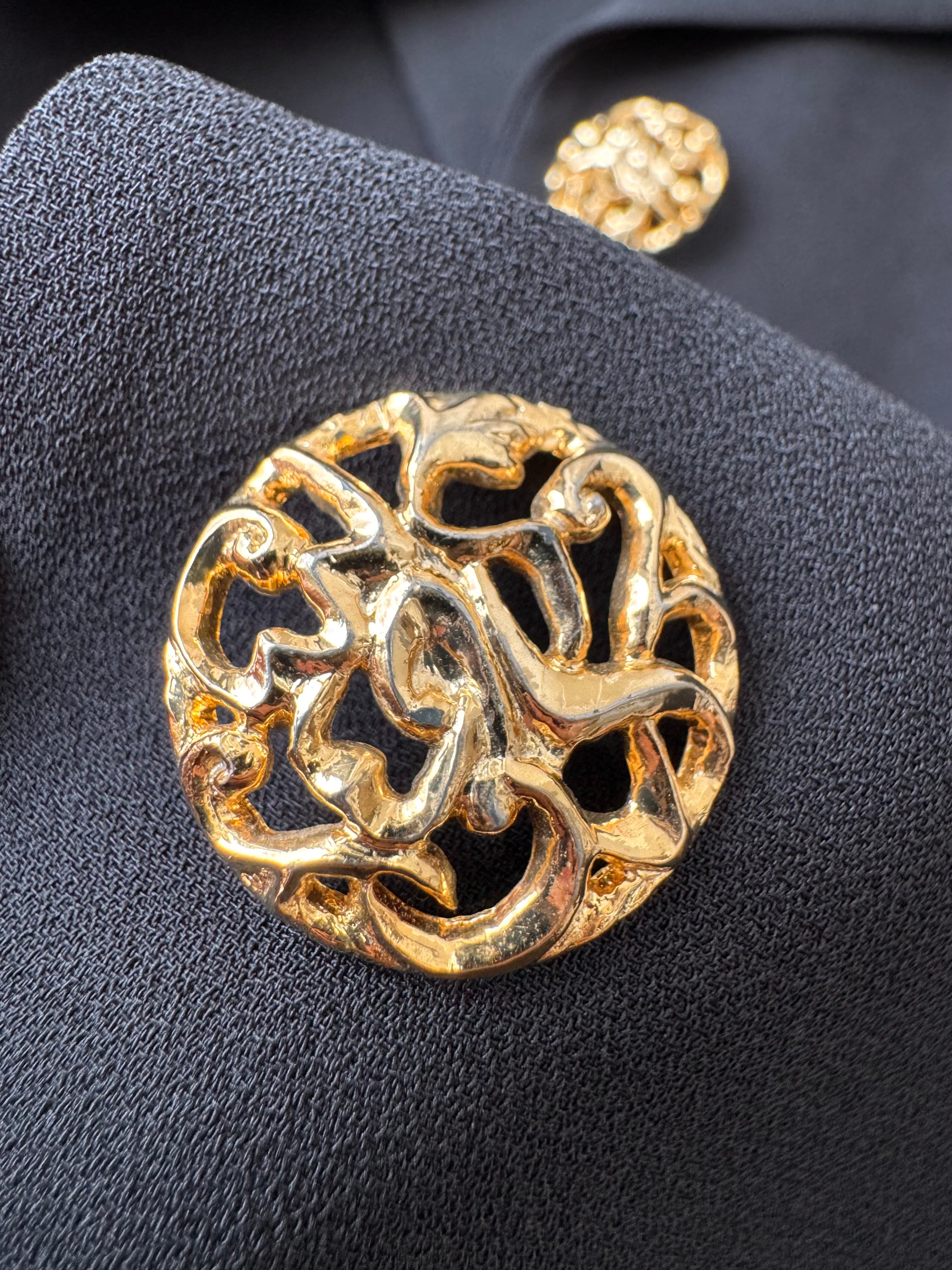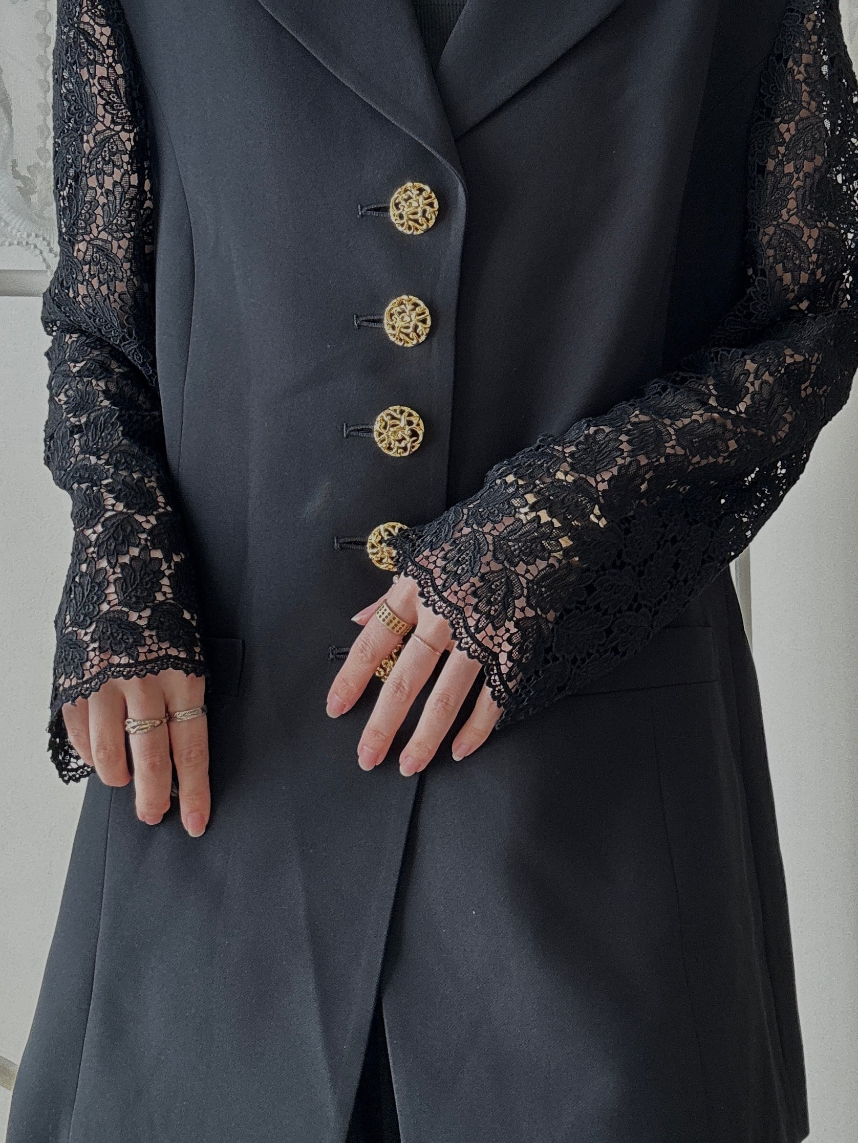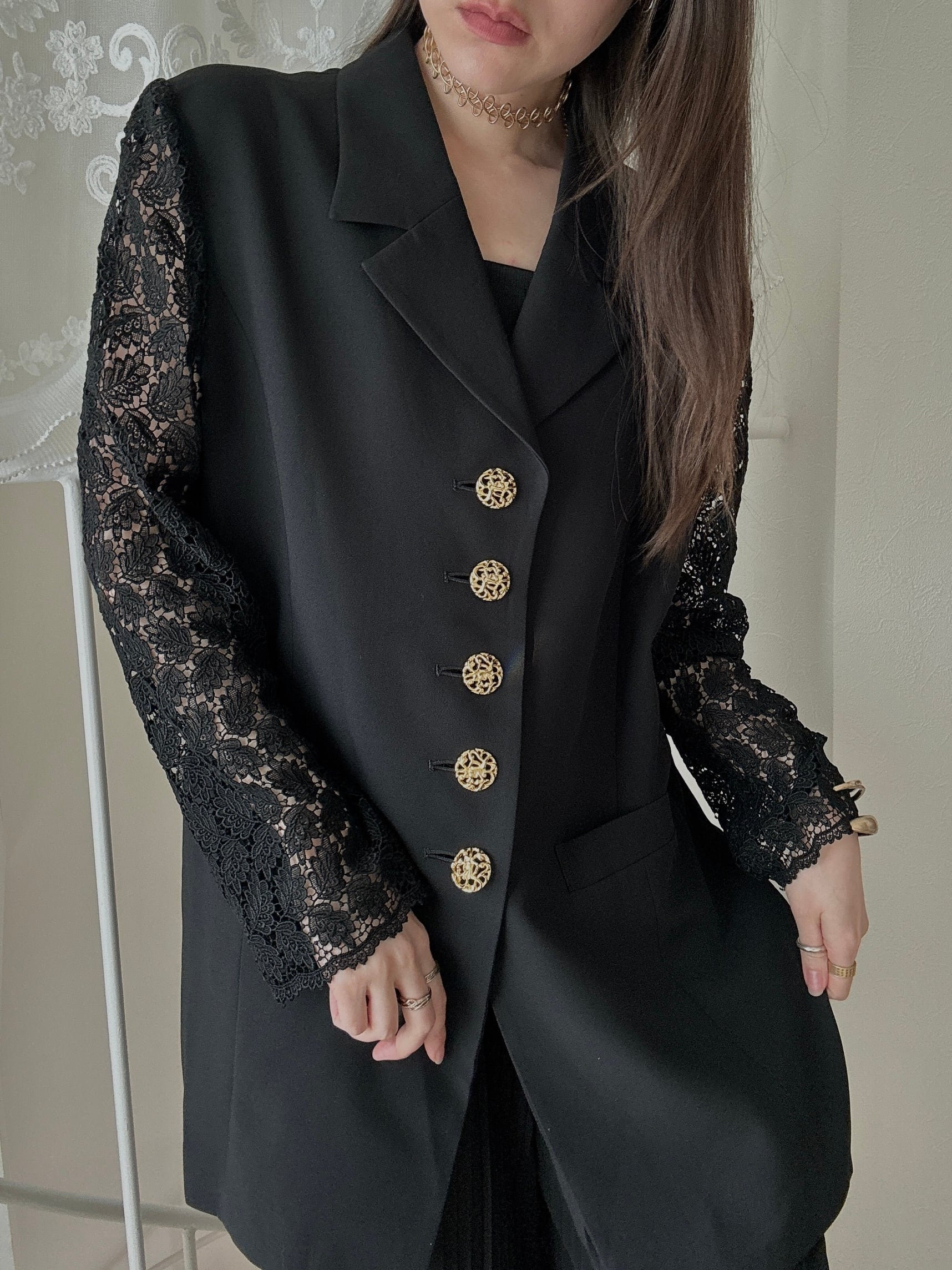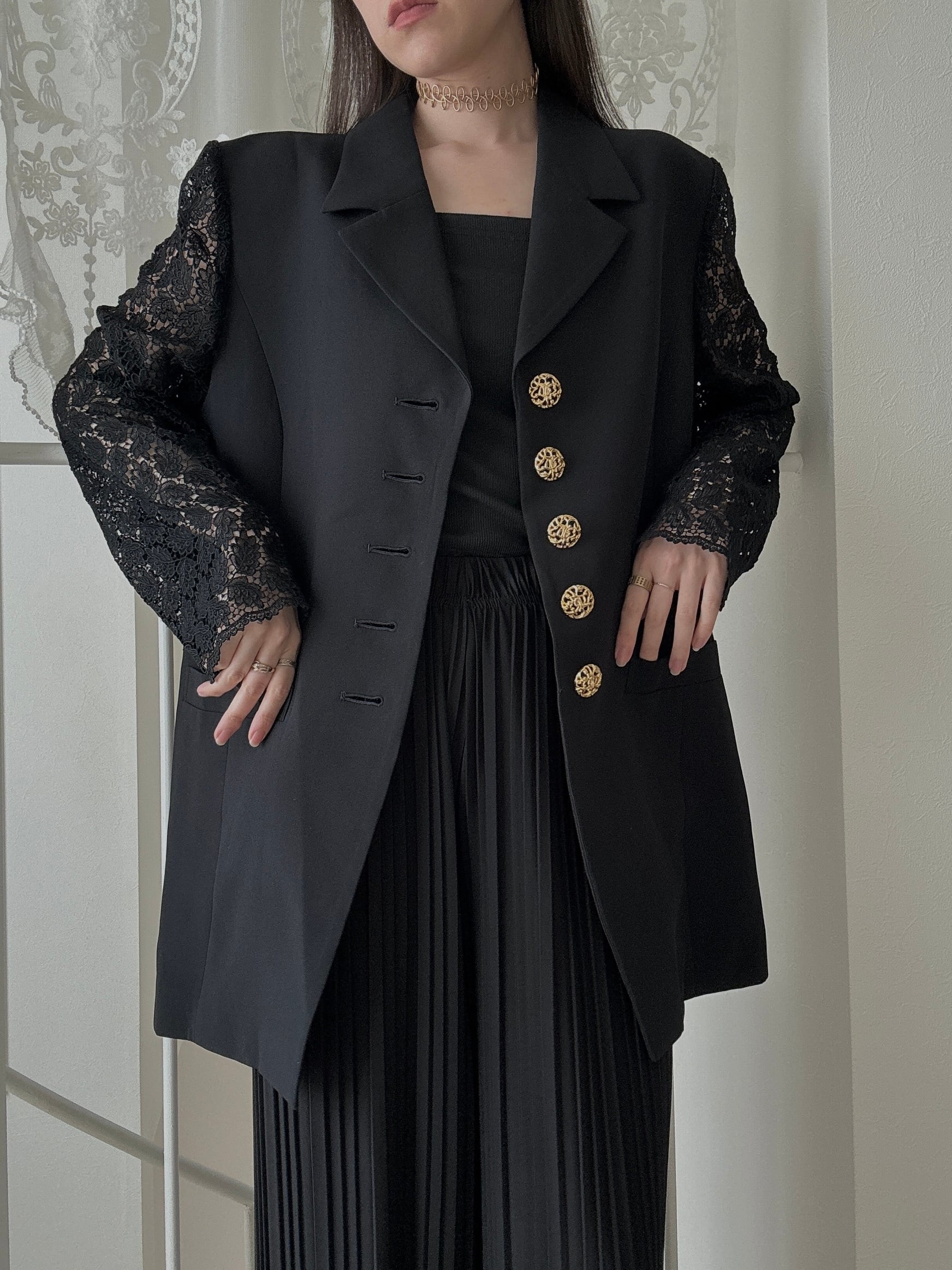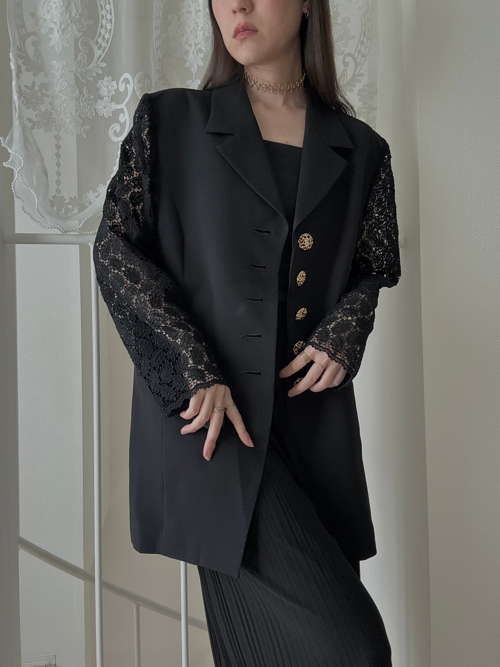 1508. 日本製 レーススリーブ ゴールド装飾ボタン クラシカルロングジャケット / ブラック ヴィンテージ