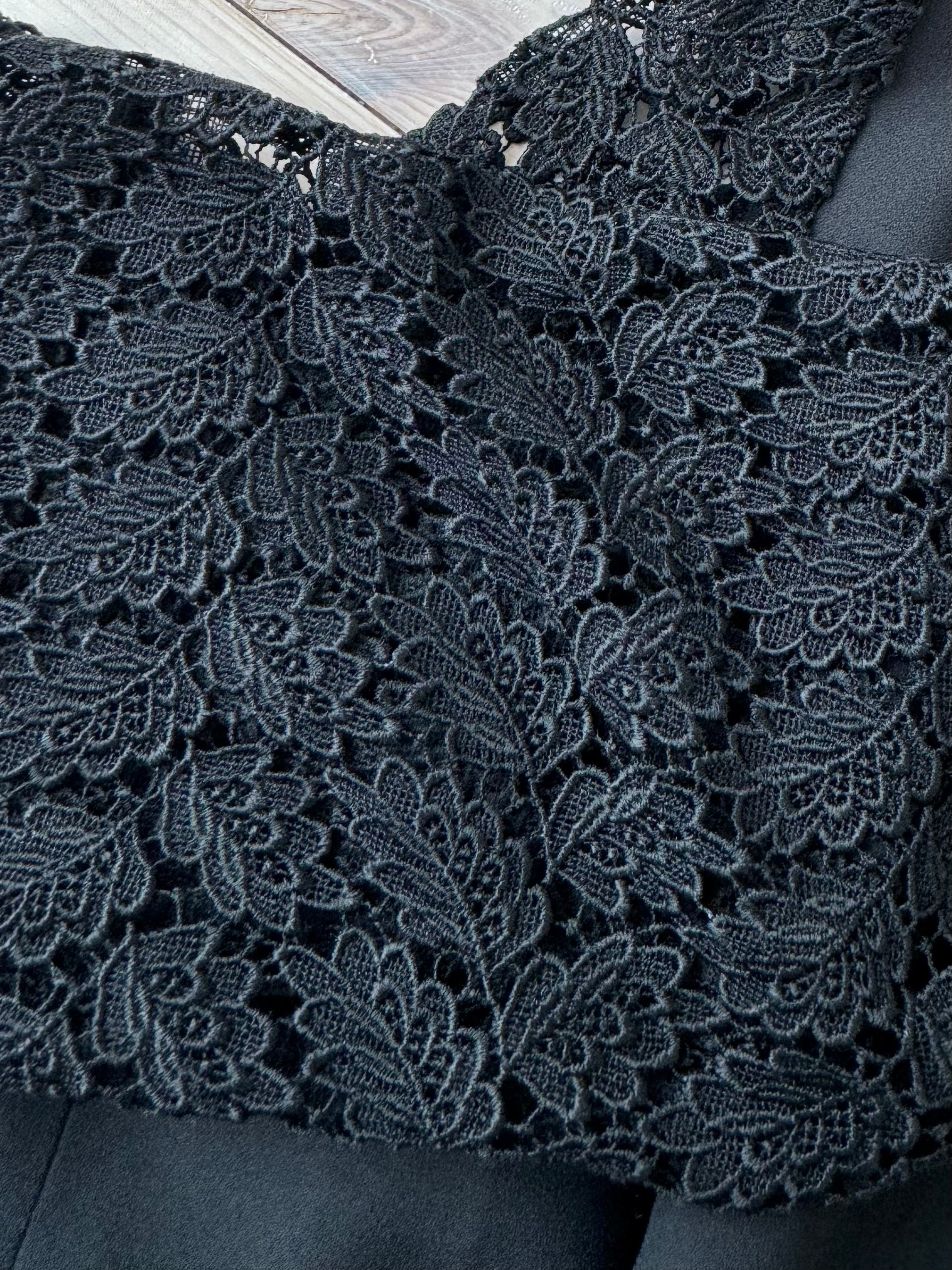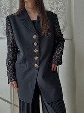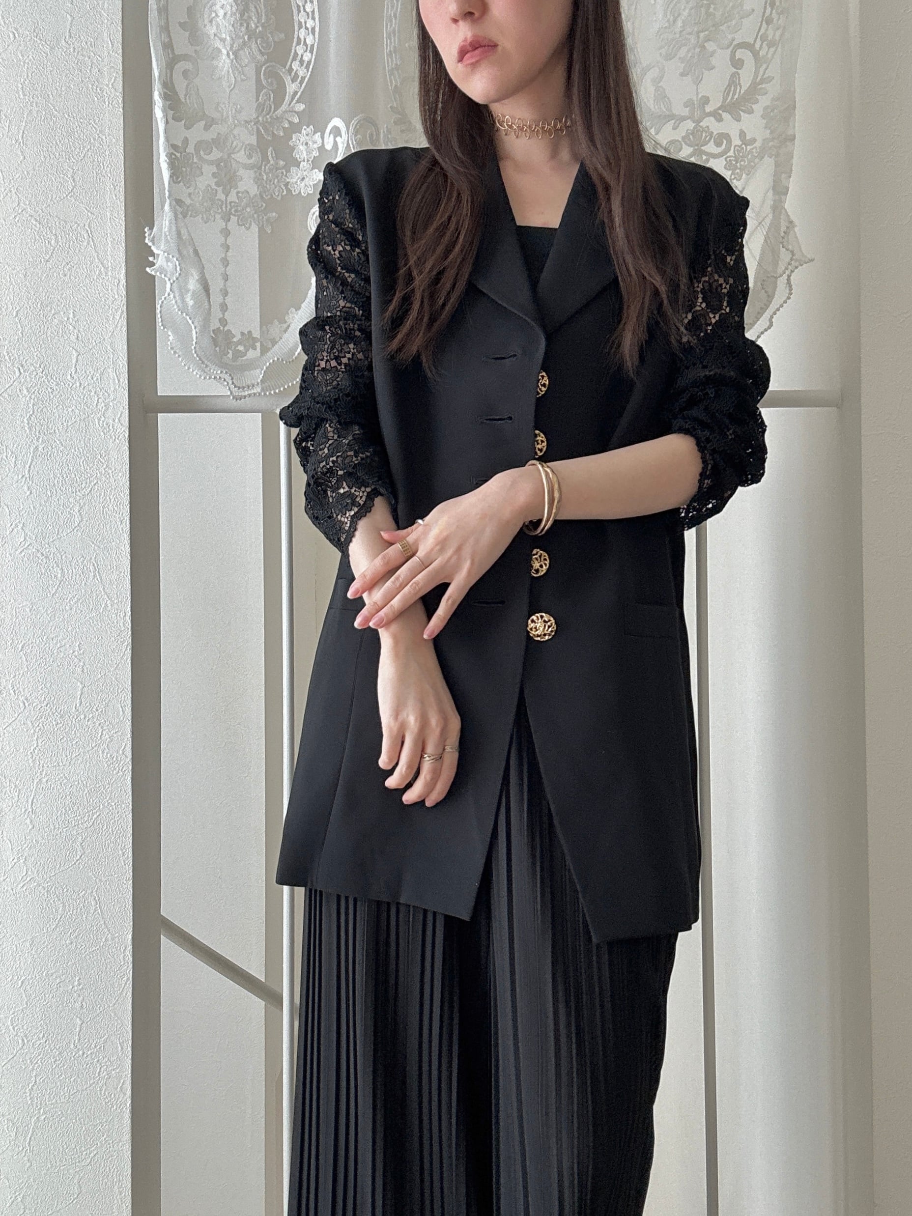 上品なブラック生地に、透け感のあるレーススリーブを組み合わせた日本製ジャケット。