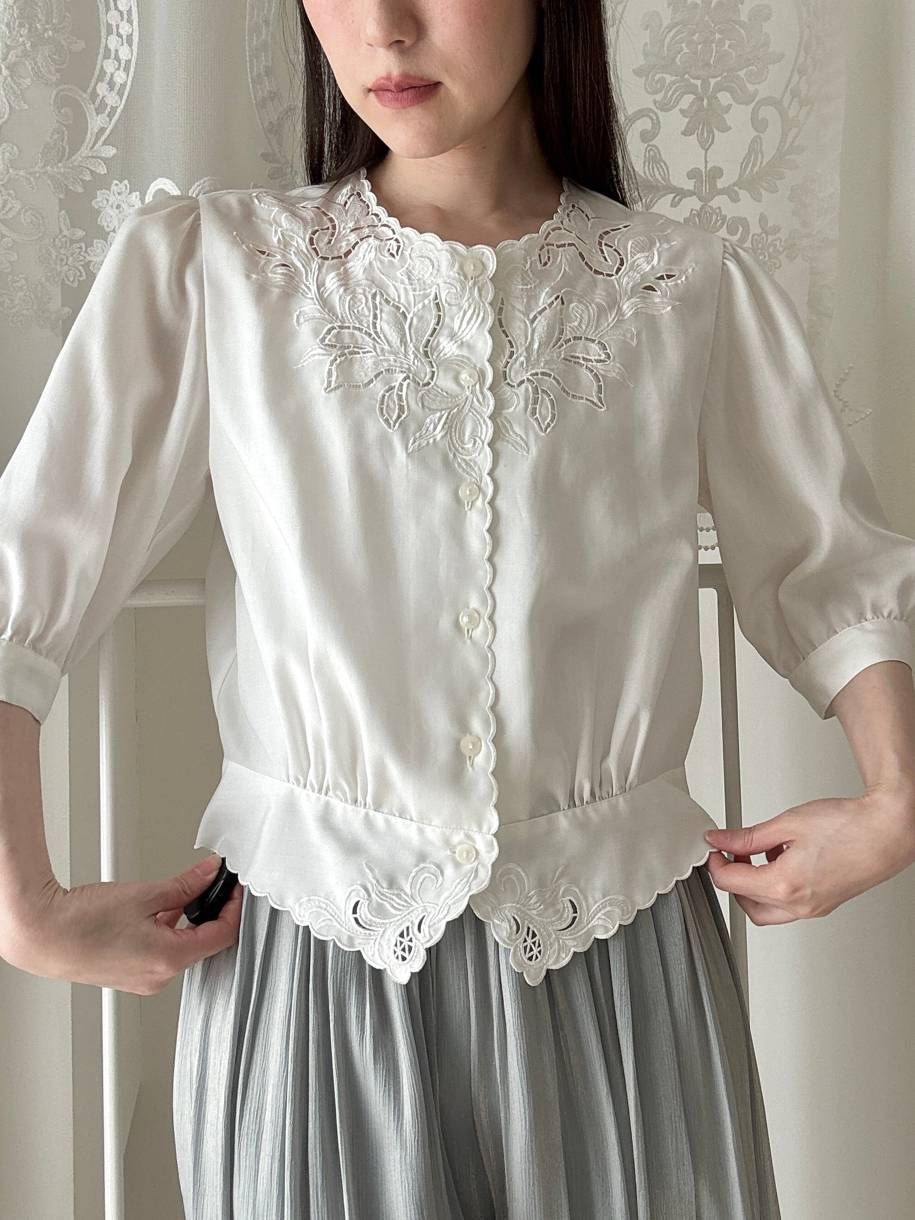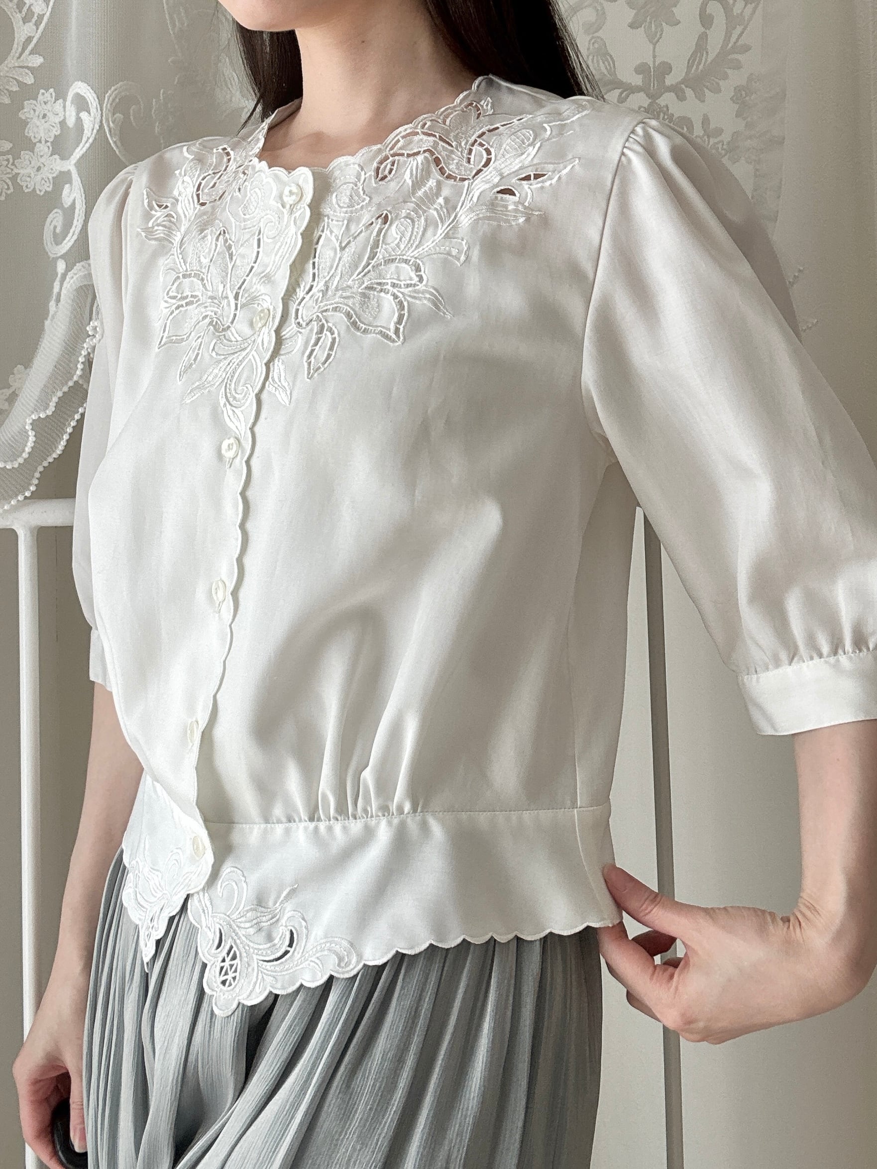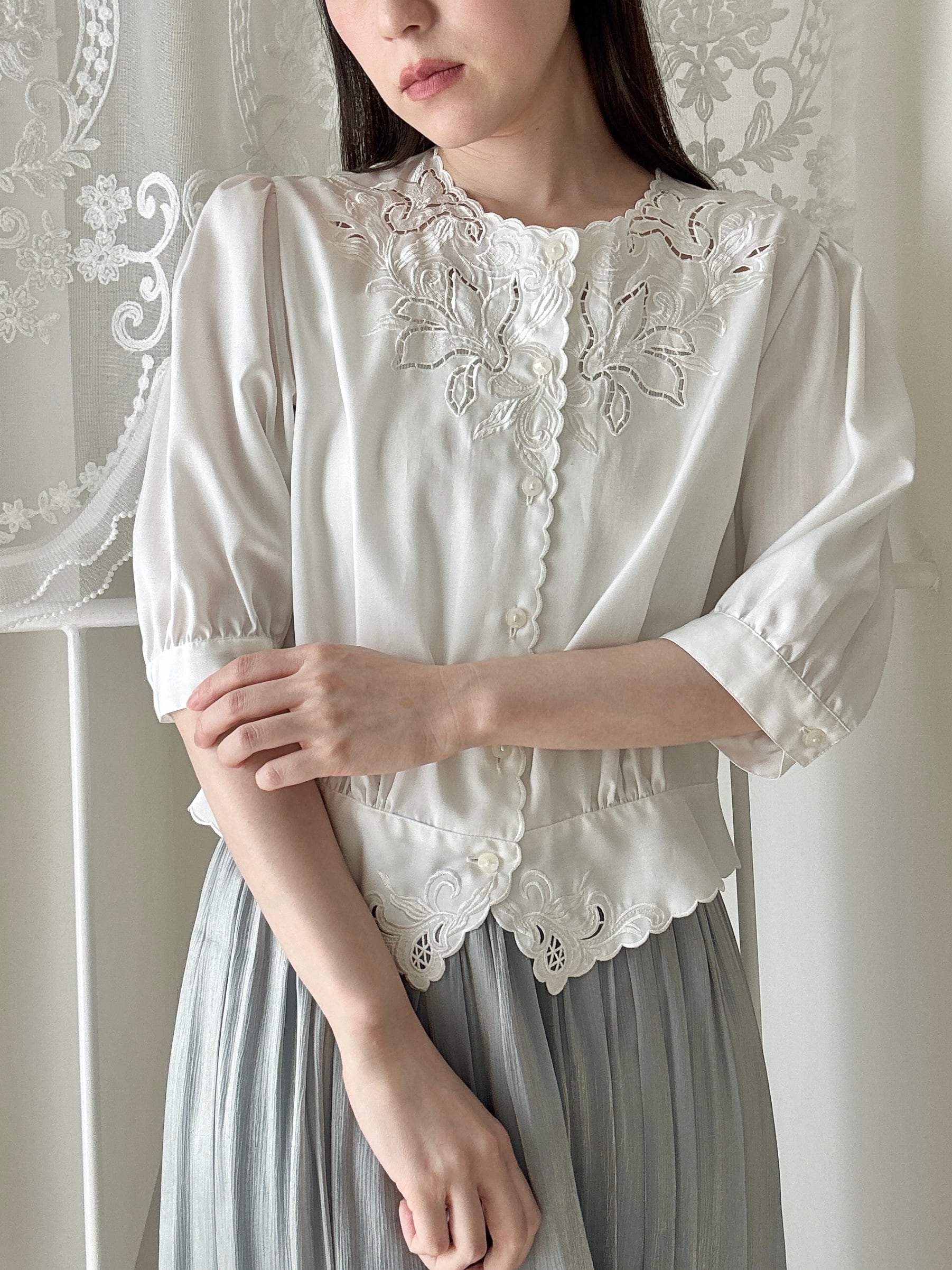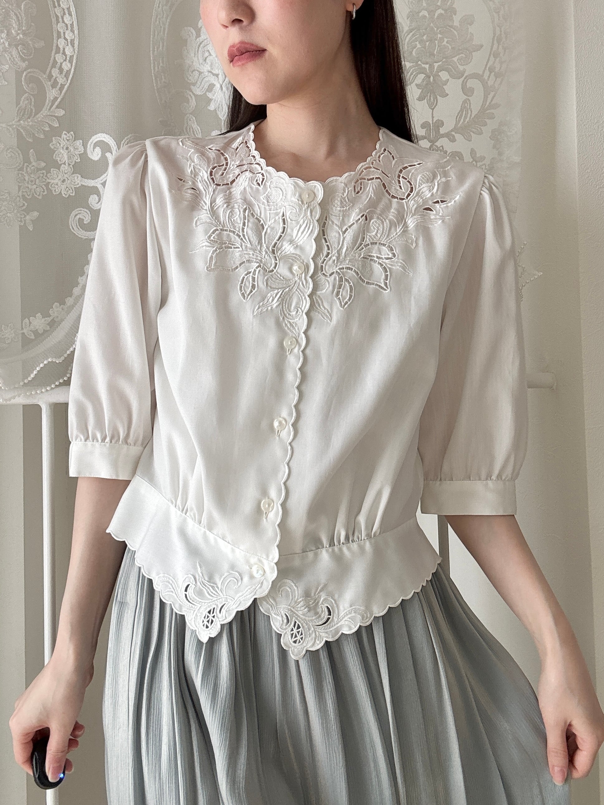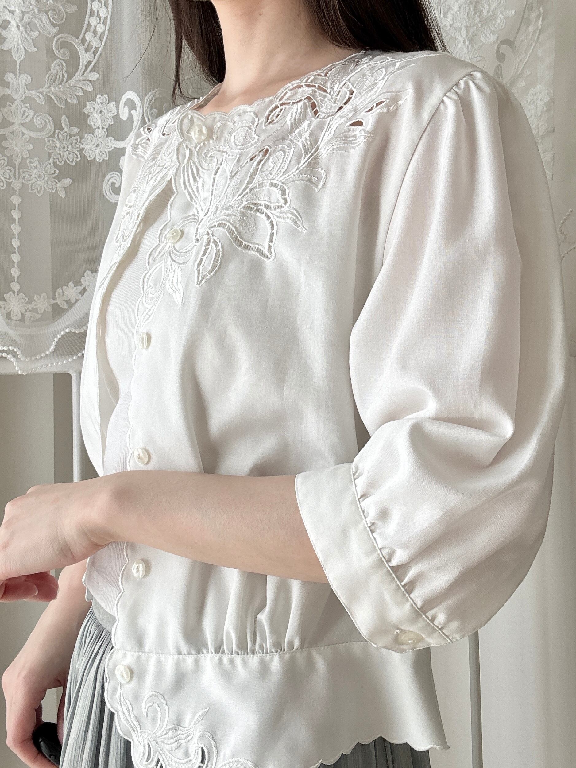 1509. 日本製 東京ブラウス 刺繍レース スカラップブラウス / ヴィンテージ ホワイト