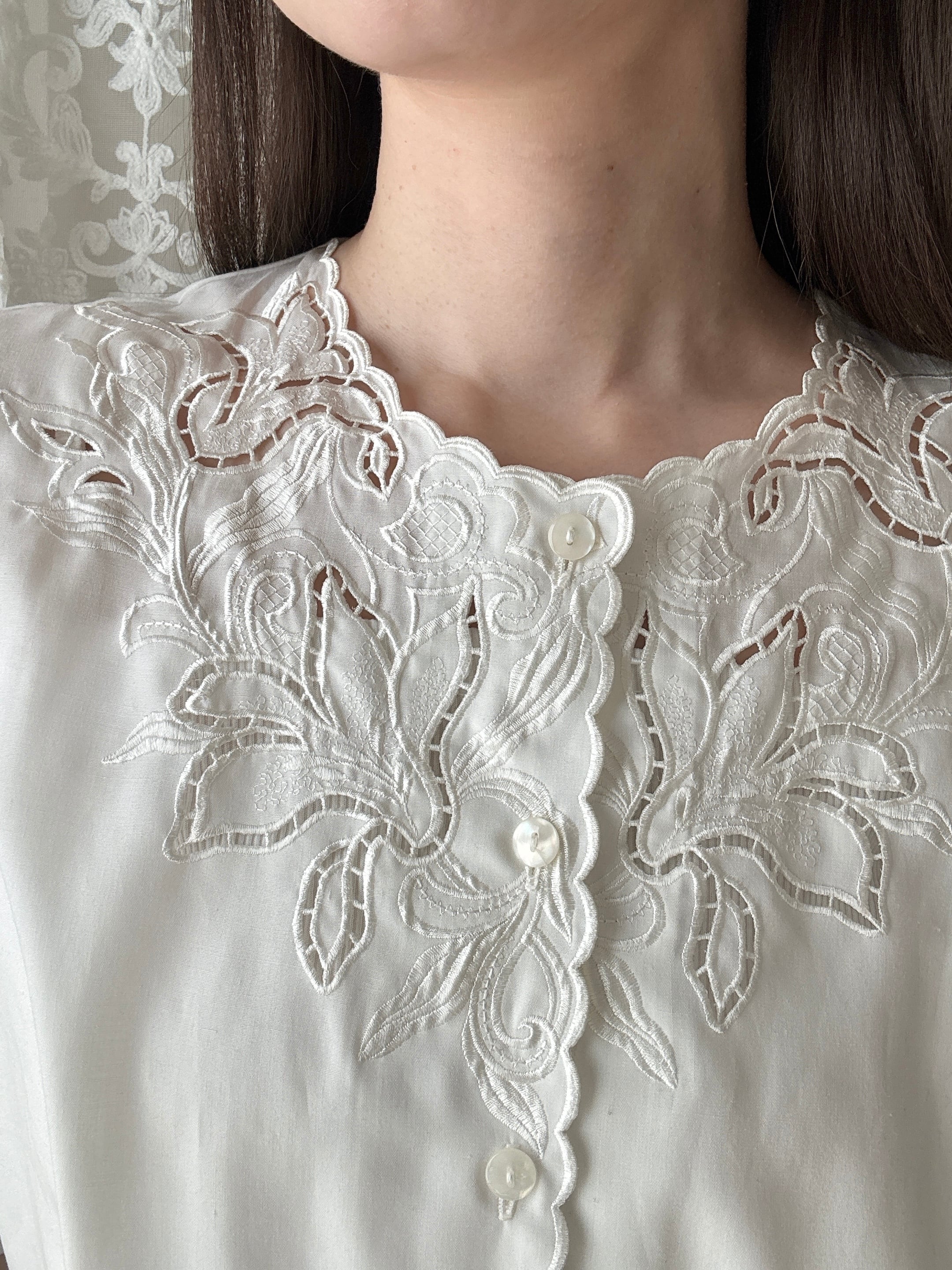 襟元から胸元にかけて施された立体的な刺繍とカットワークレースが印象的で、クラシカルで上品な雰囲気を演出します。