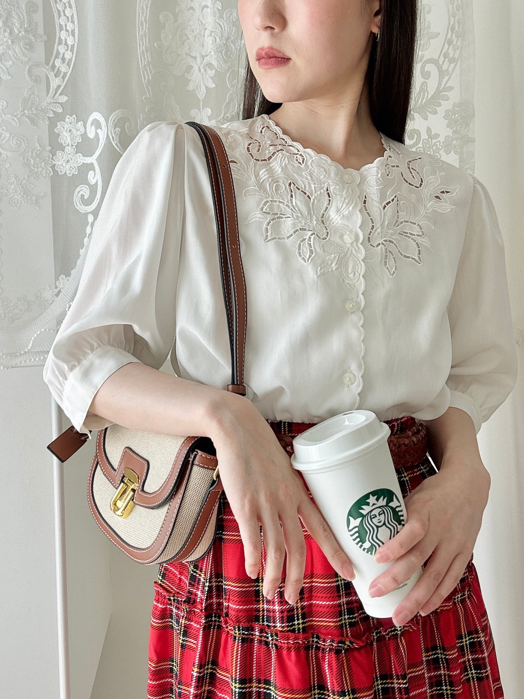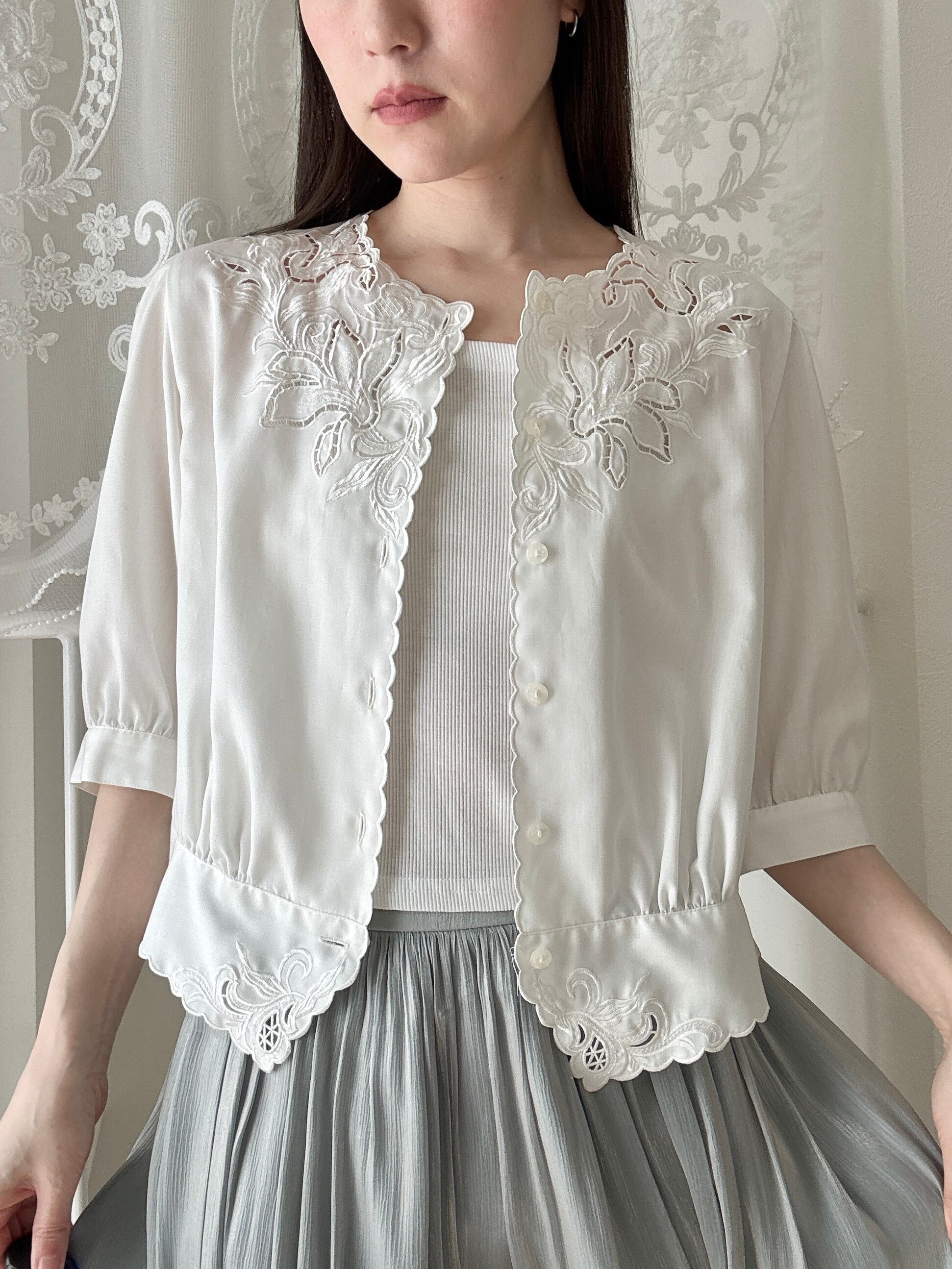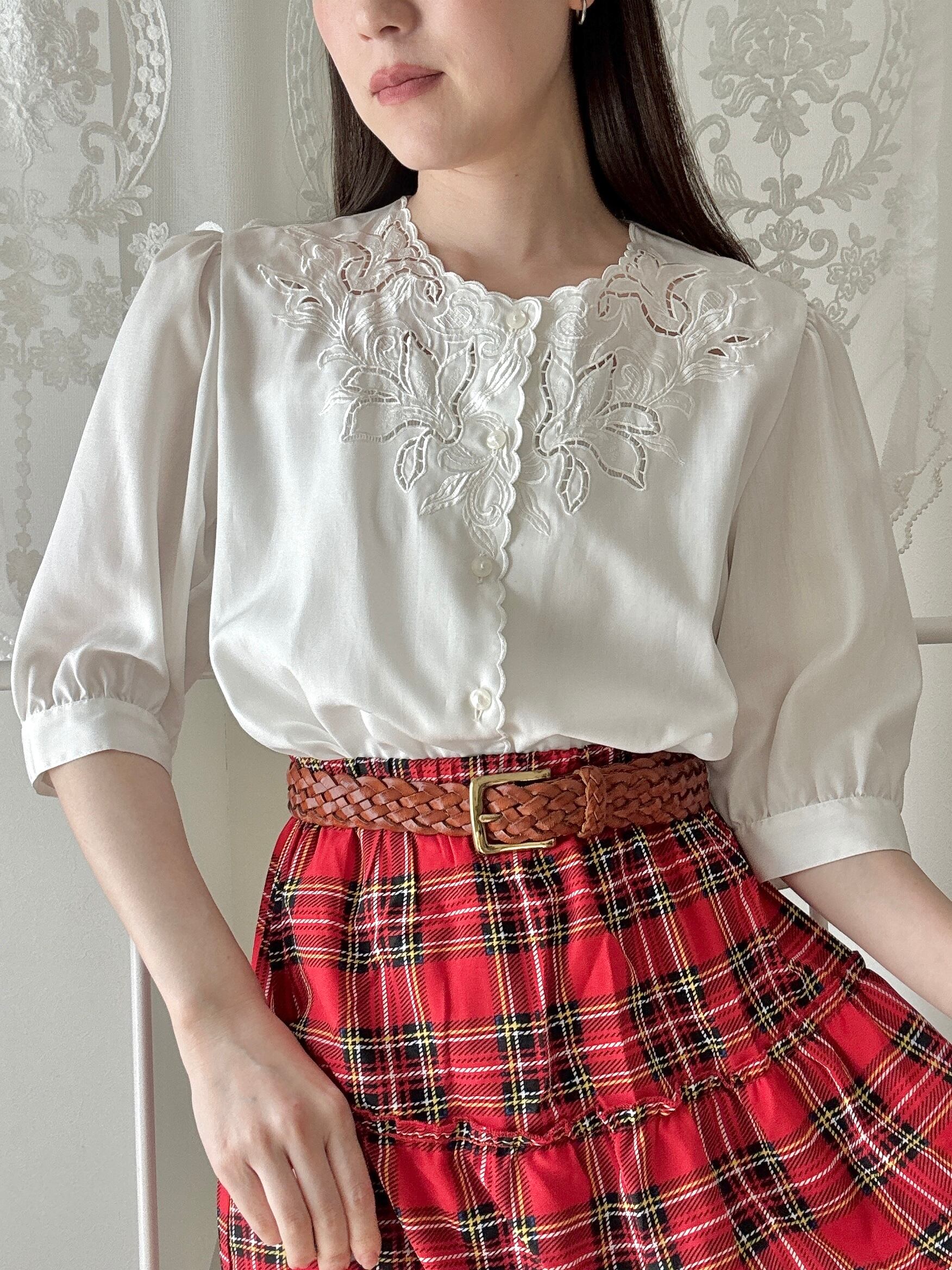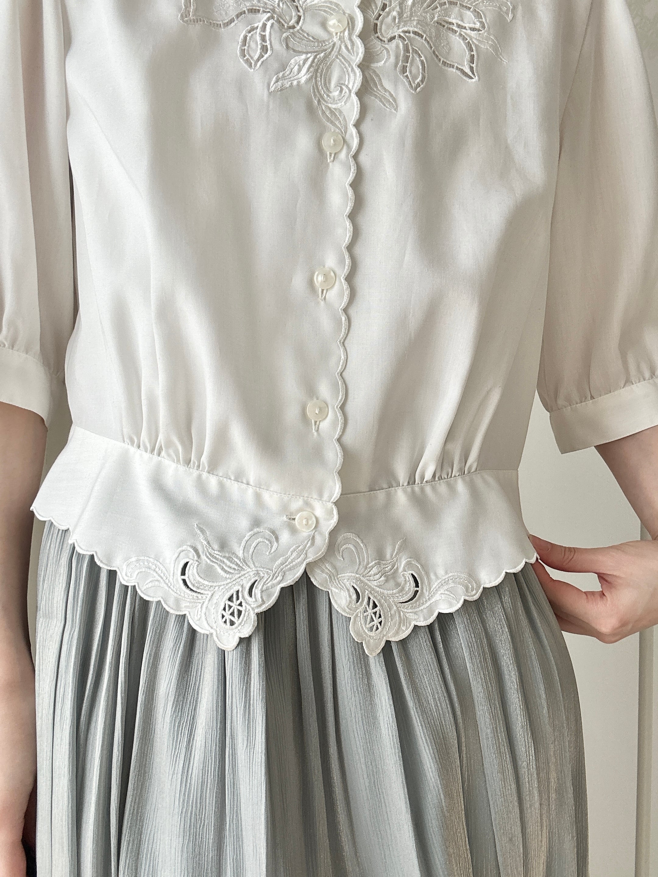 繊細な刺繍とスカラップデザインが美しい、日本製「東京ブラウス」のヴィンテージブラウス。