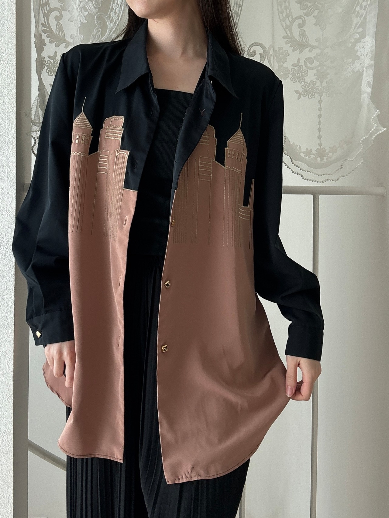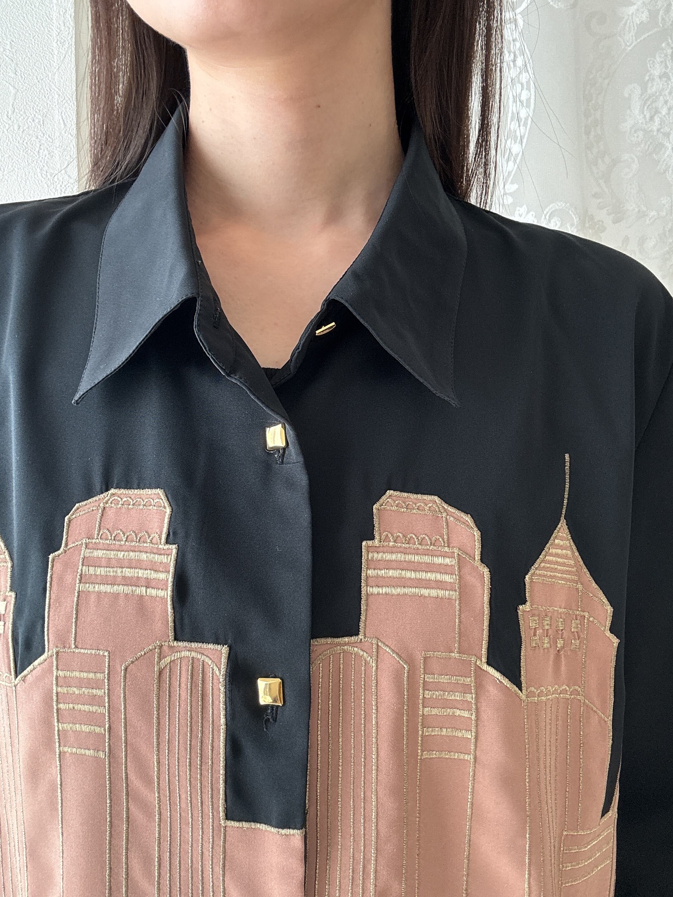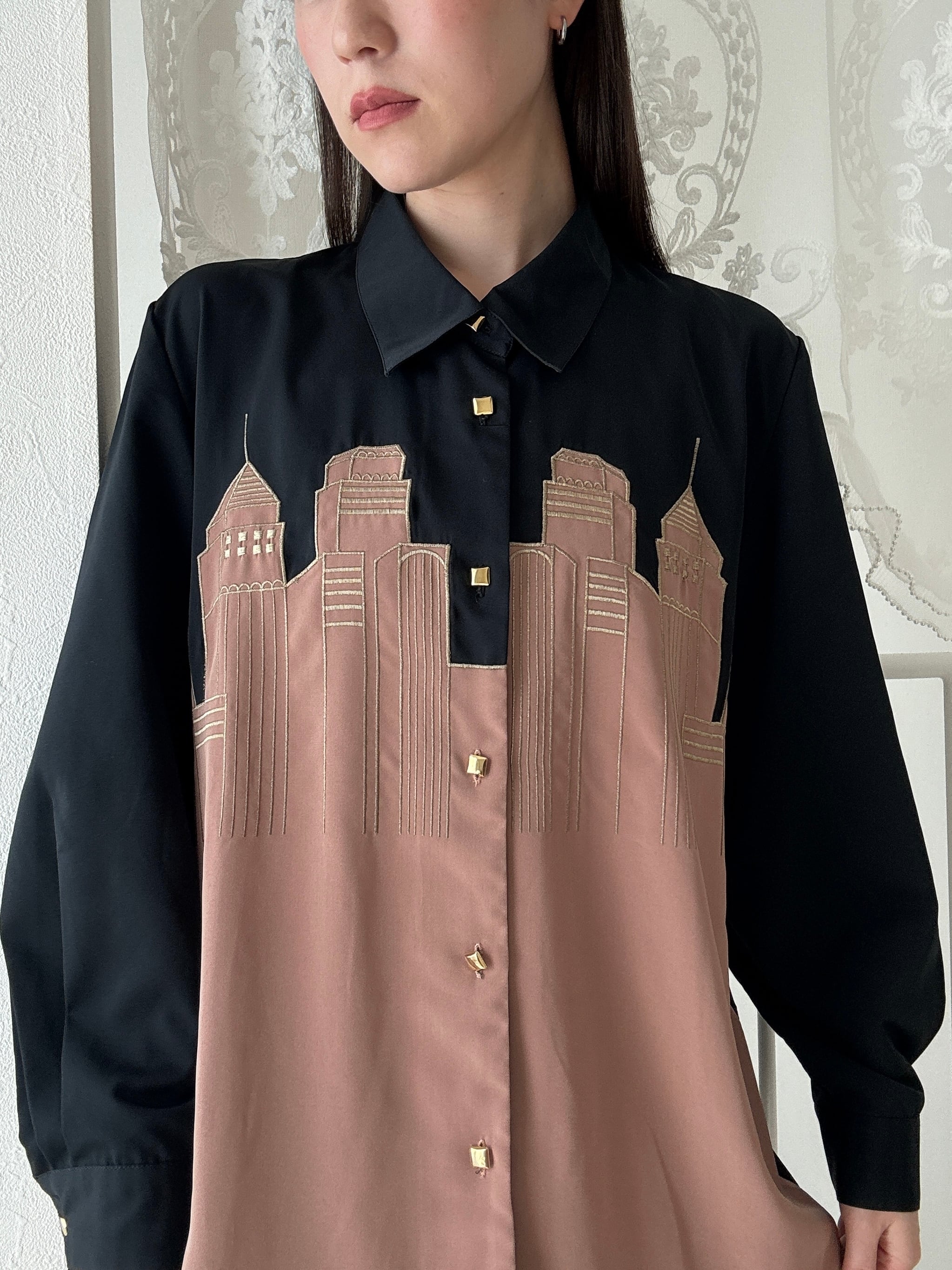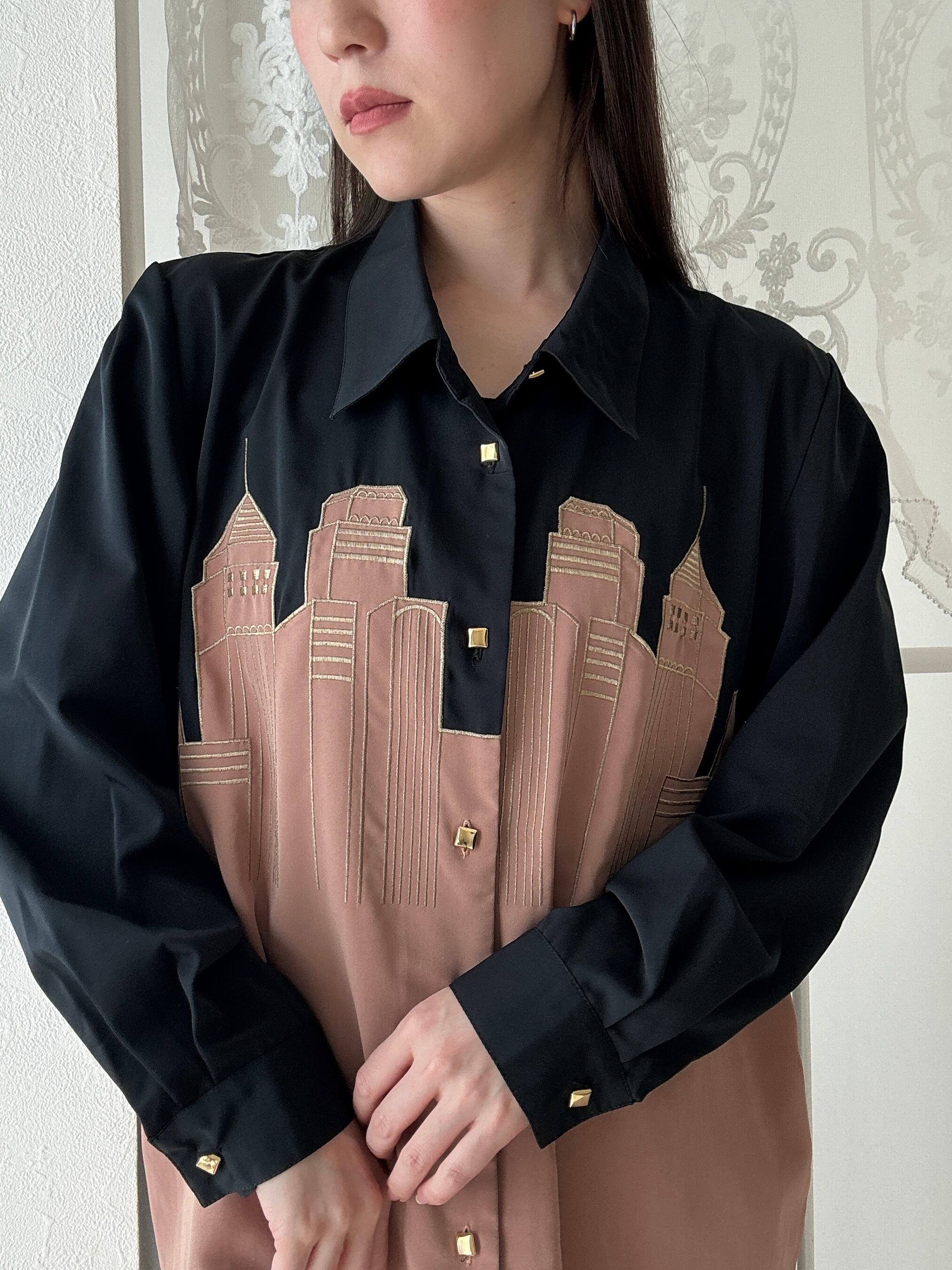 1510. 都市モチーフ刺繍デザイン バイカラーヴィンテージブラウス ブラック×モーブ|日本製風レトロシャツ・個性派デザイン・一点物