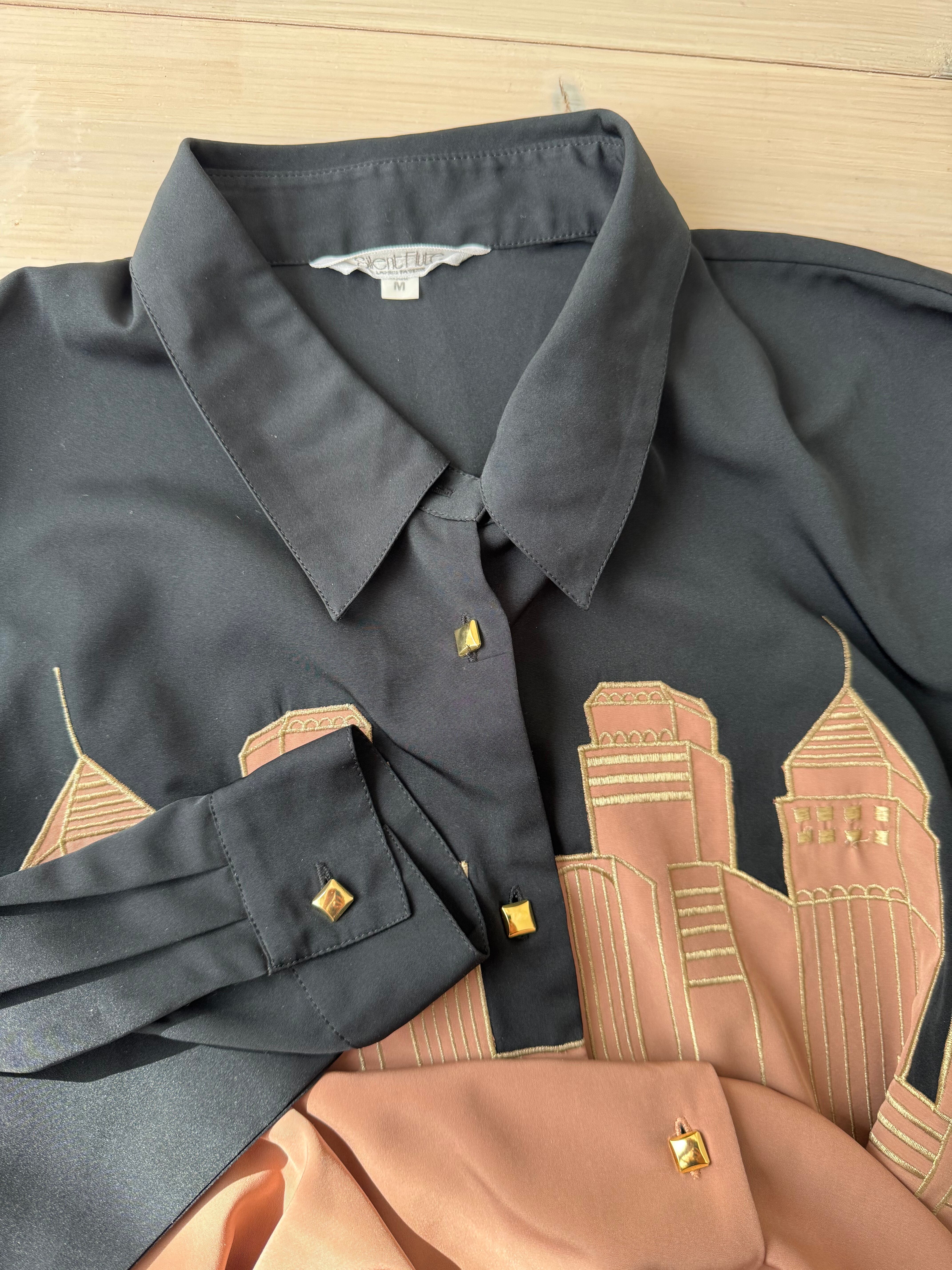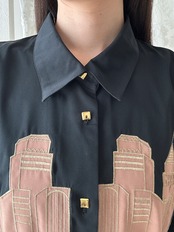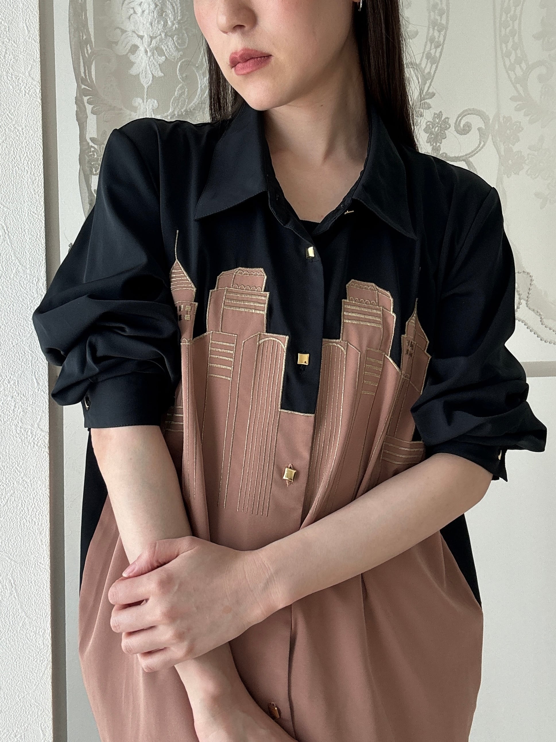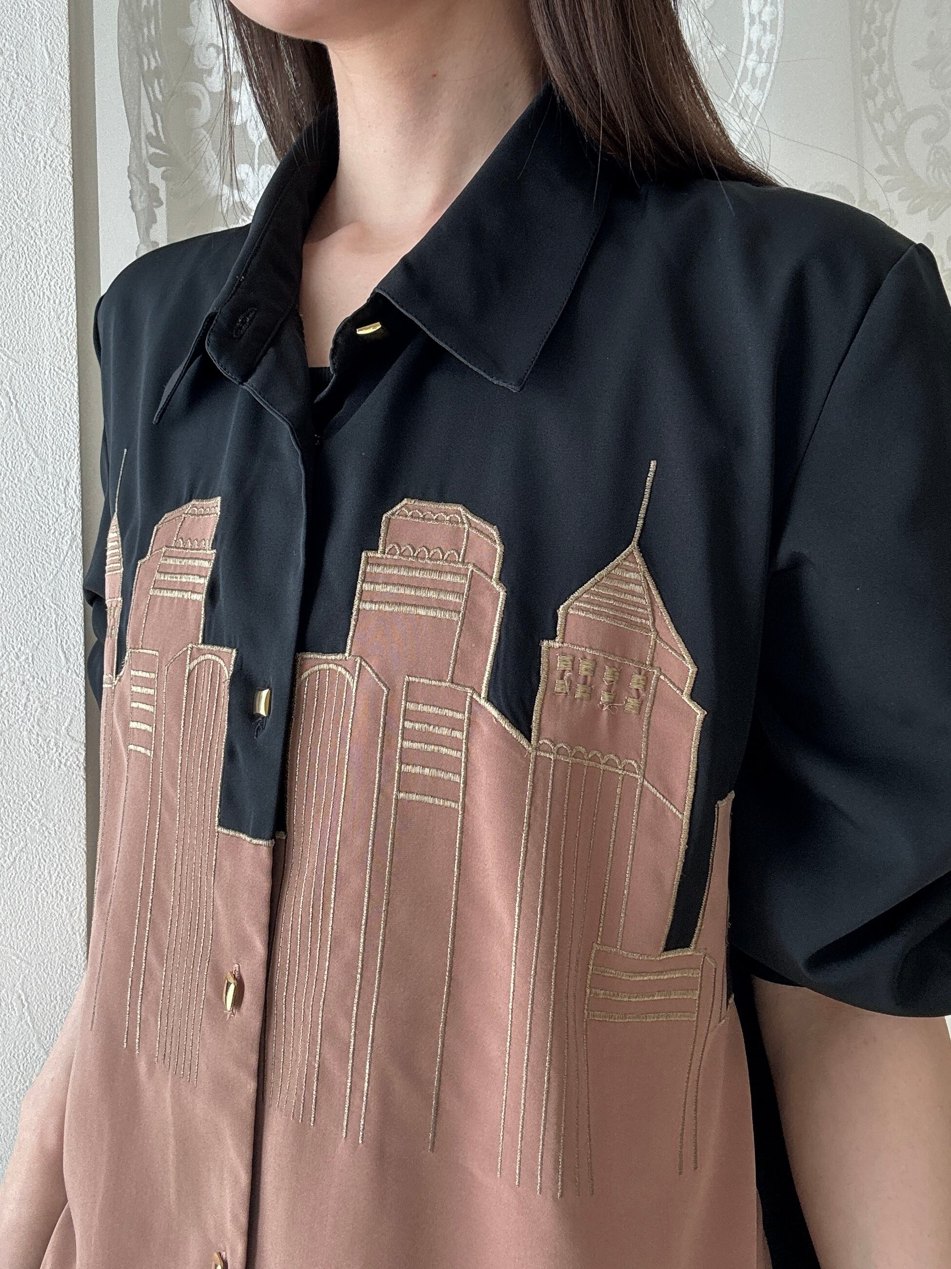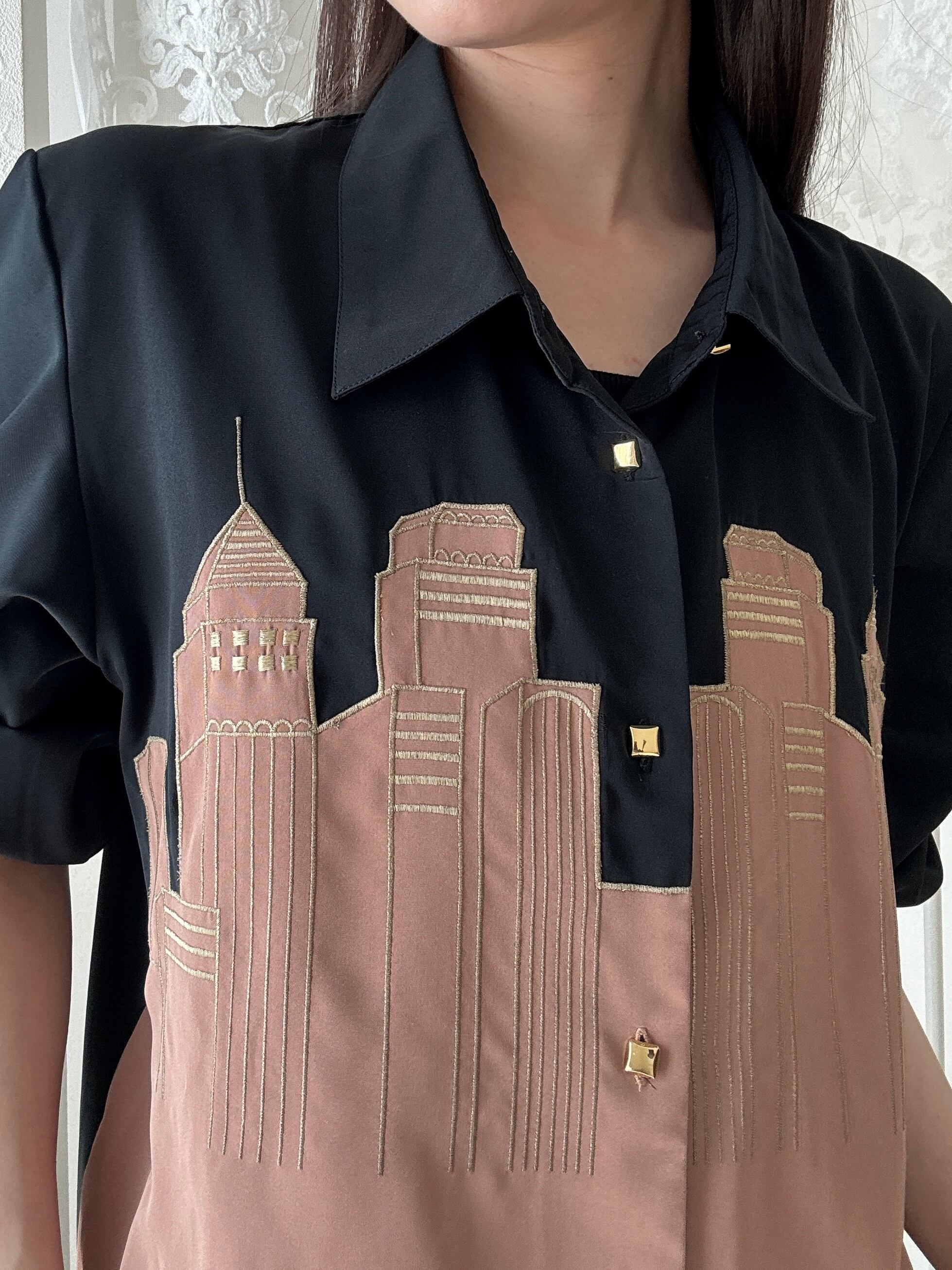 1510. 都市モチーフ刺繍デザイン バイカラーヴィンテージブラウス ブラック×モーブ|日本製風レトロシャツ・個性派デザイン・一点物