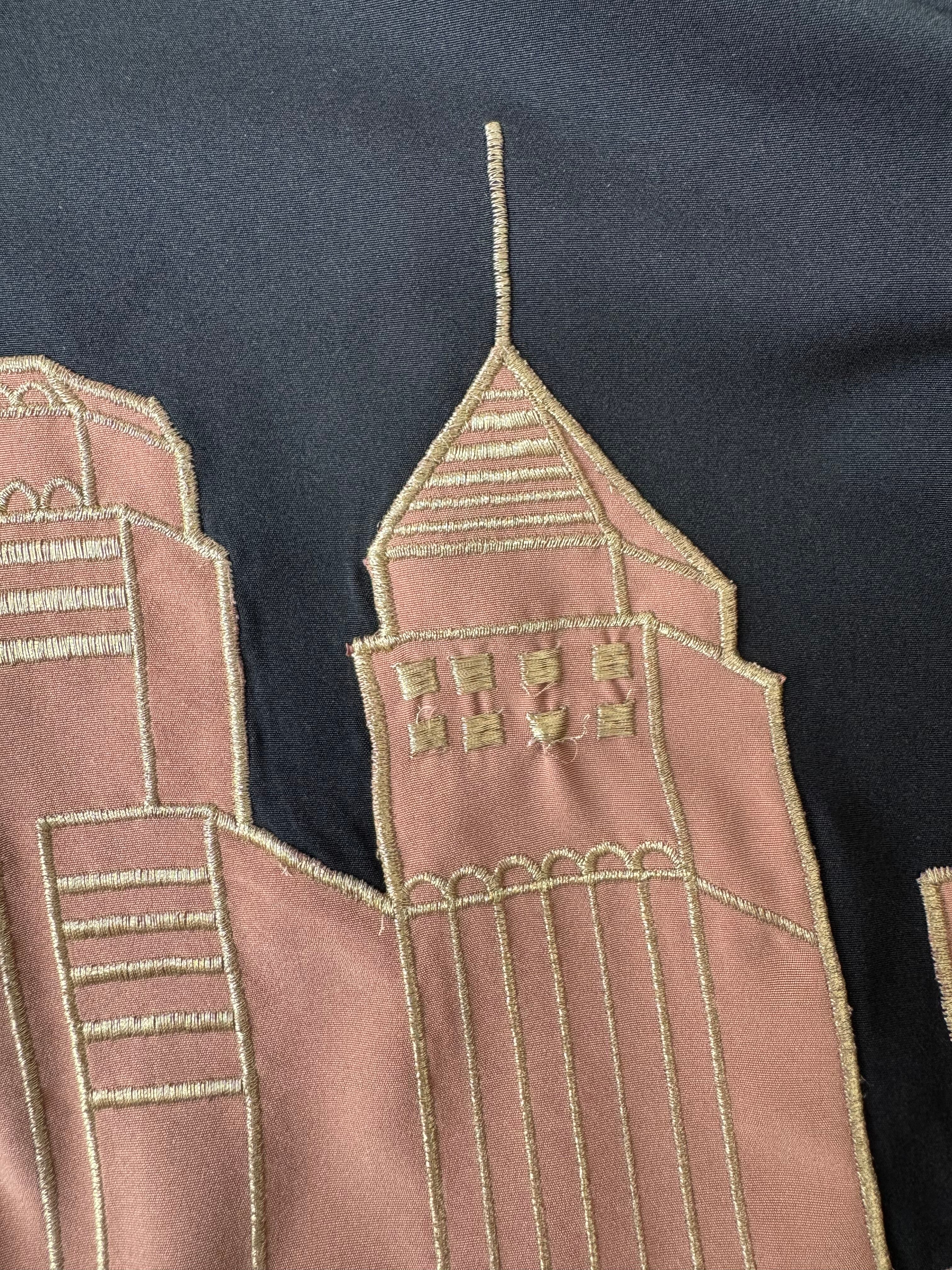 ブラックベースに、モーブ系カラーで描かれた都市モチーフの刺繍デザイン。