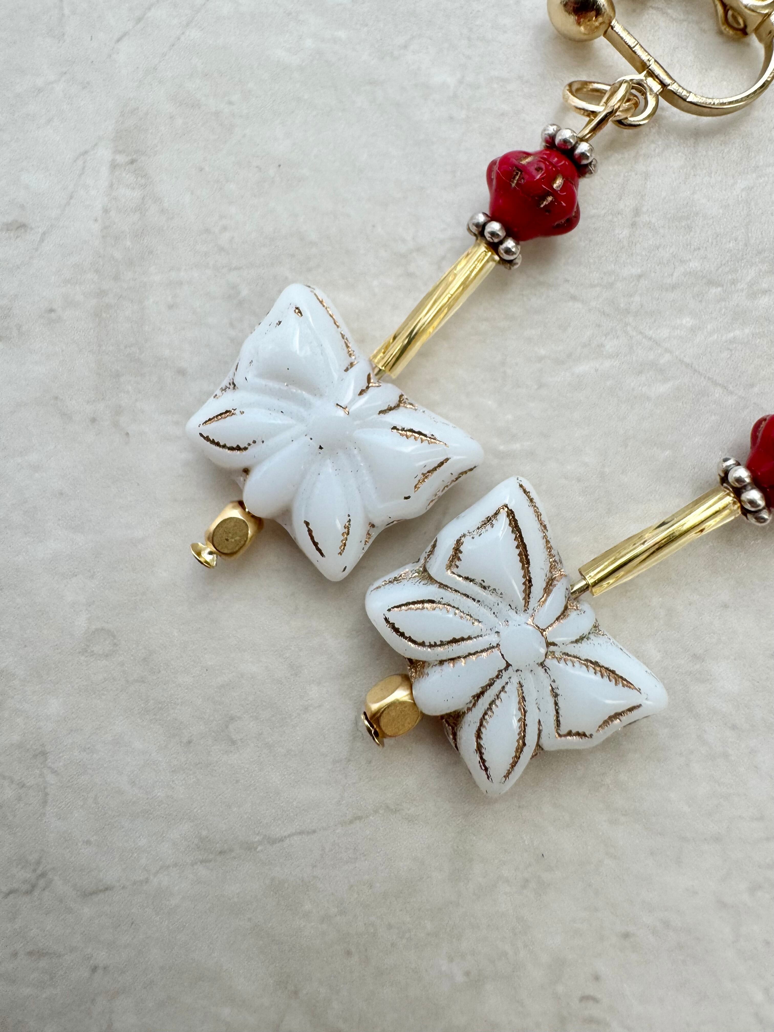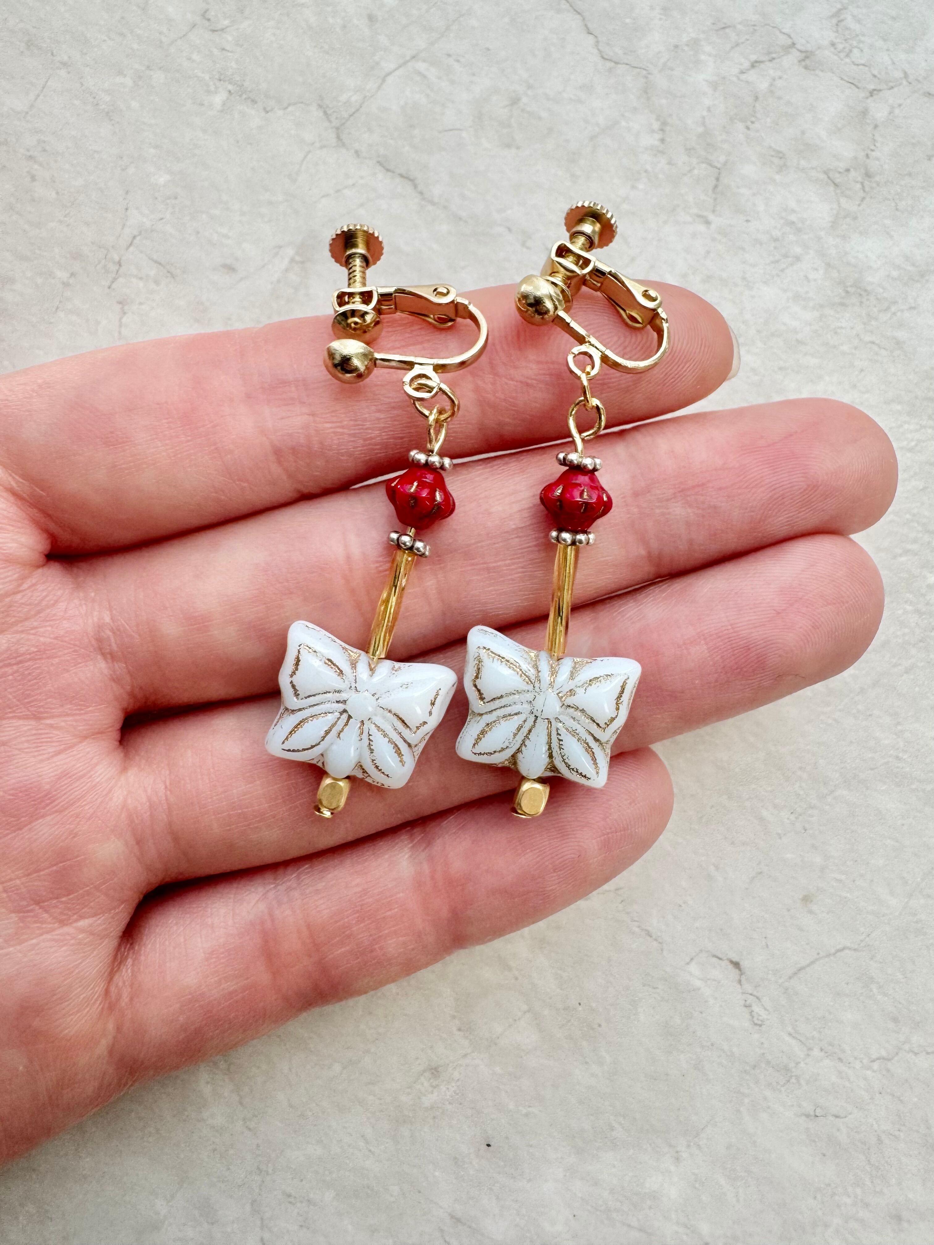 1511. 白蝶リボン×深紅ビーズ 揺れるヴィンテージ調イヤリング|クラシカル・レトロ・上品アクセサリー