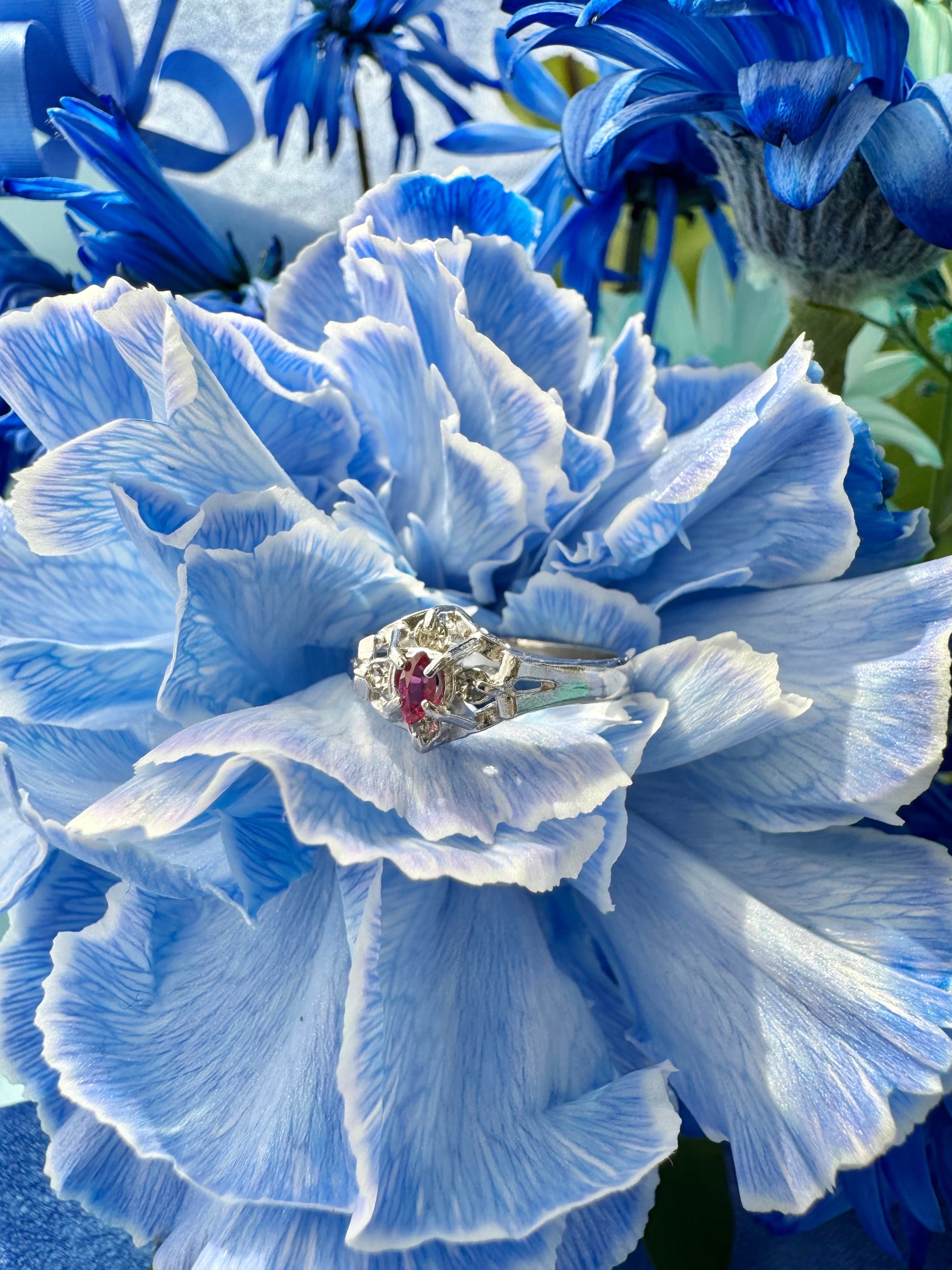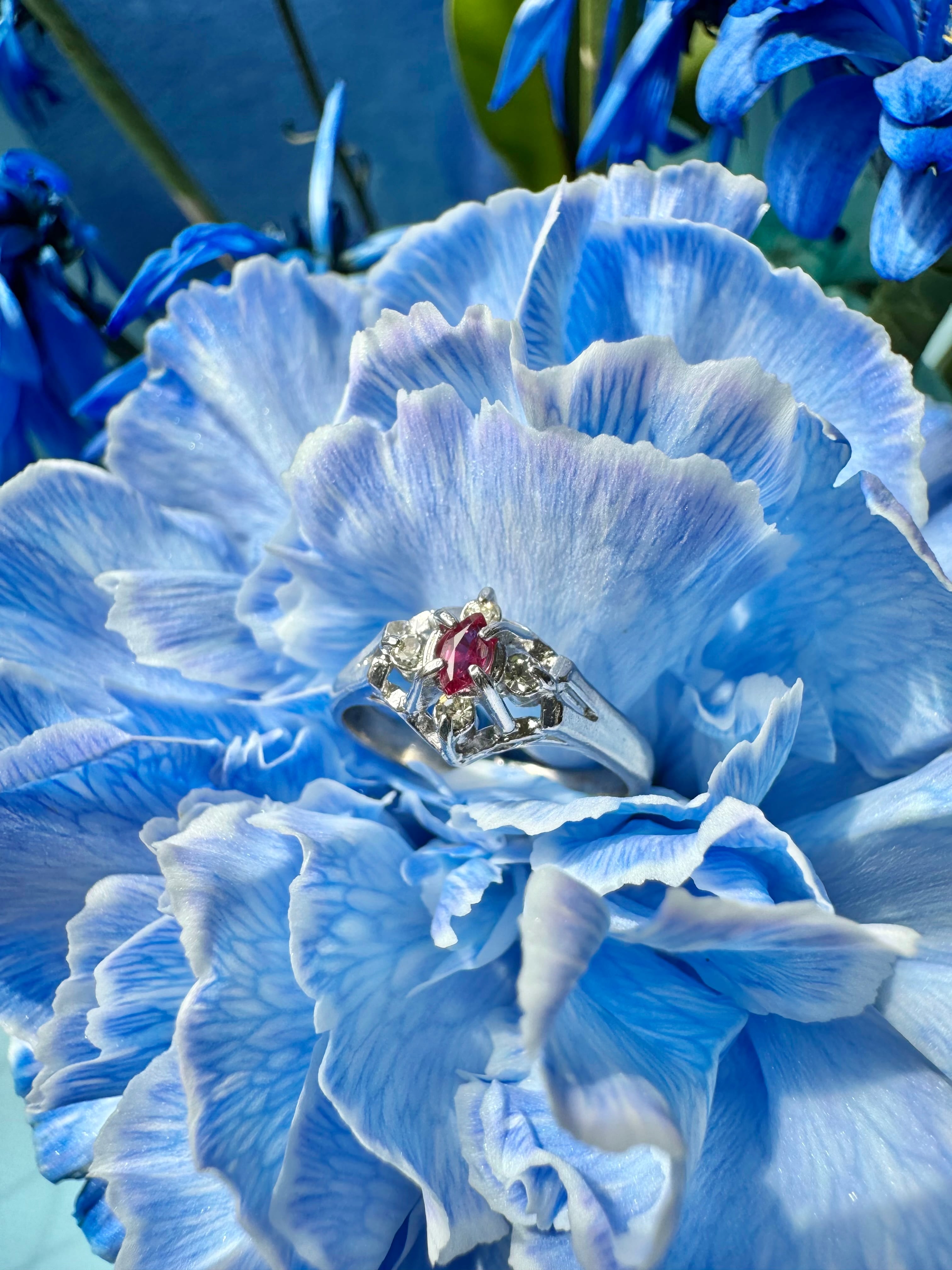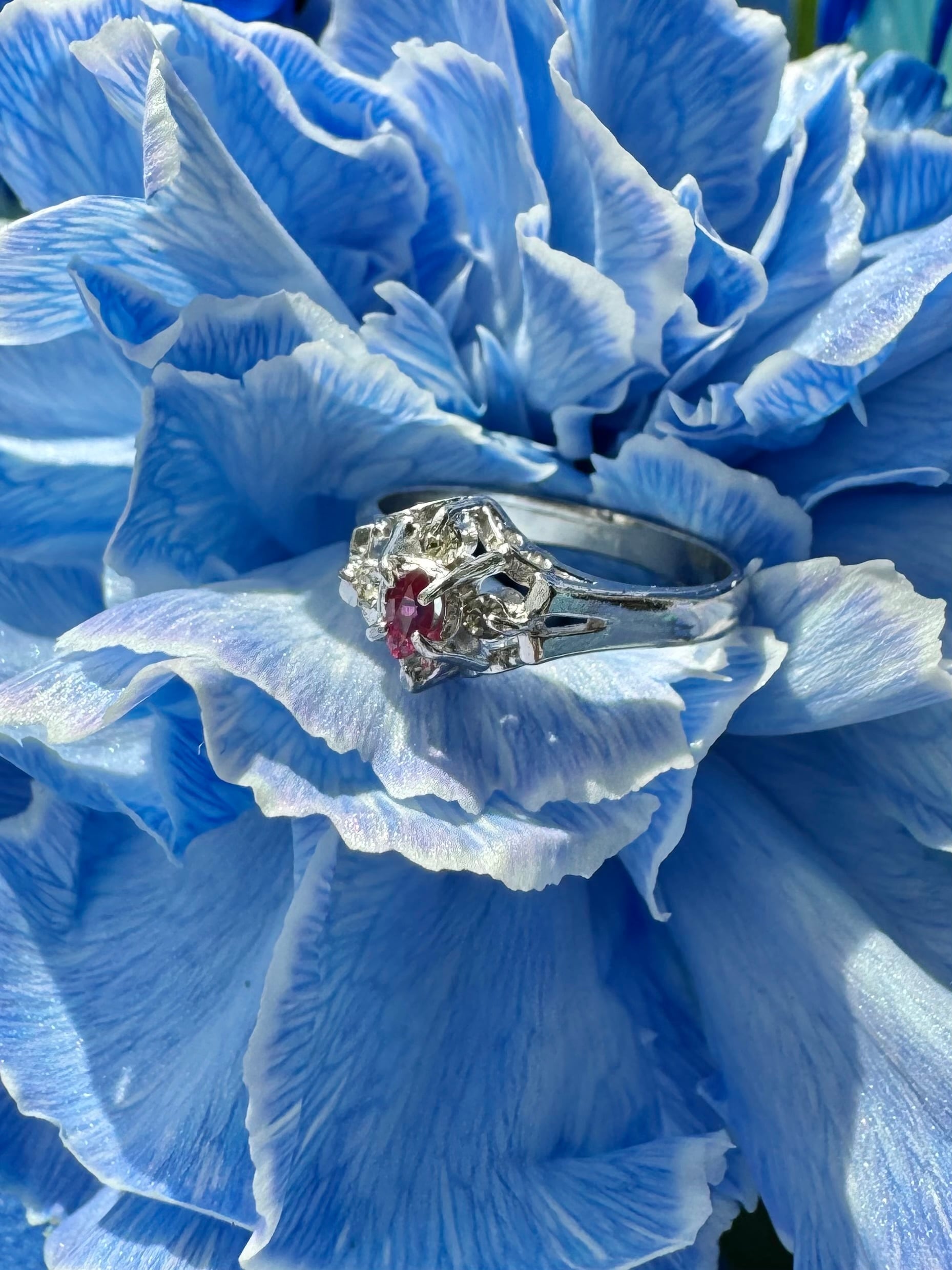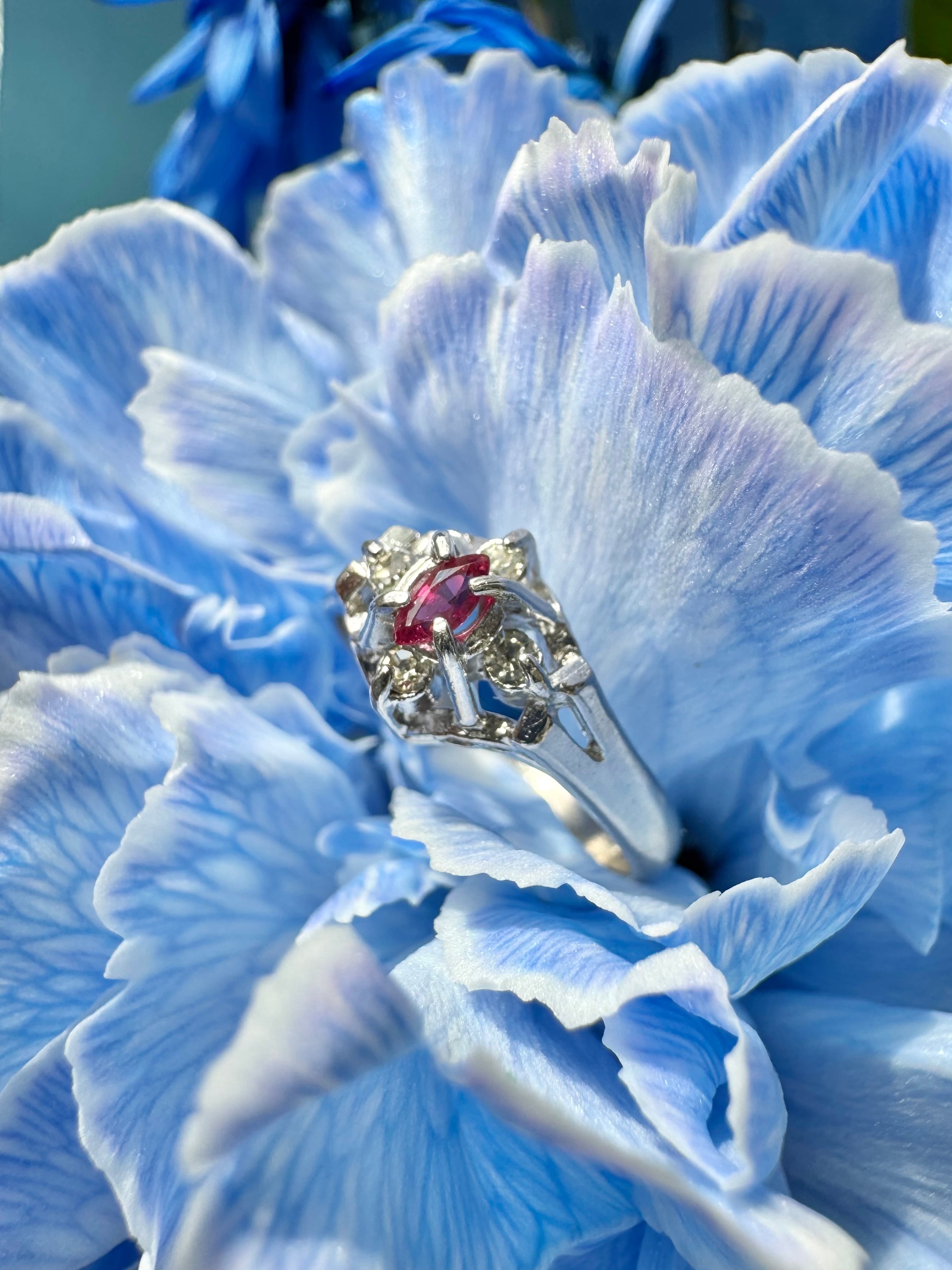カットの入り方や輝きから、ガラスではなく合成ルビー、もしくは天然ルビーの可能性が感じられる質感です。