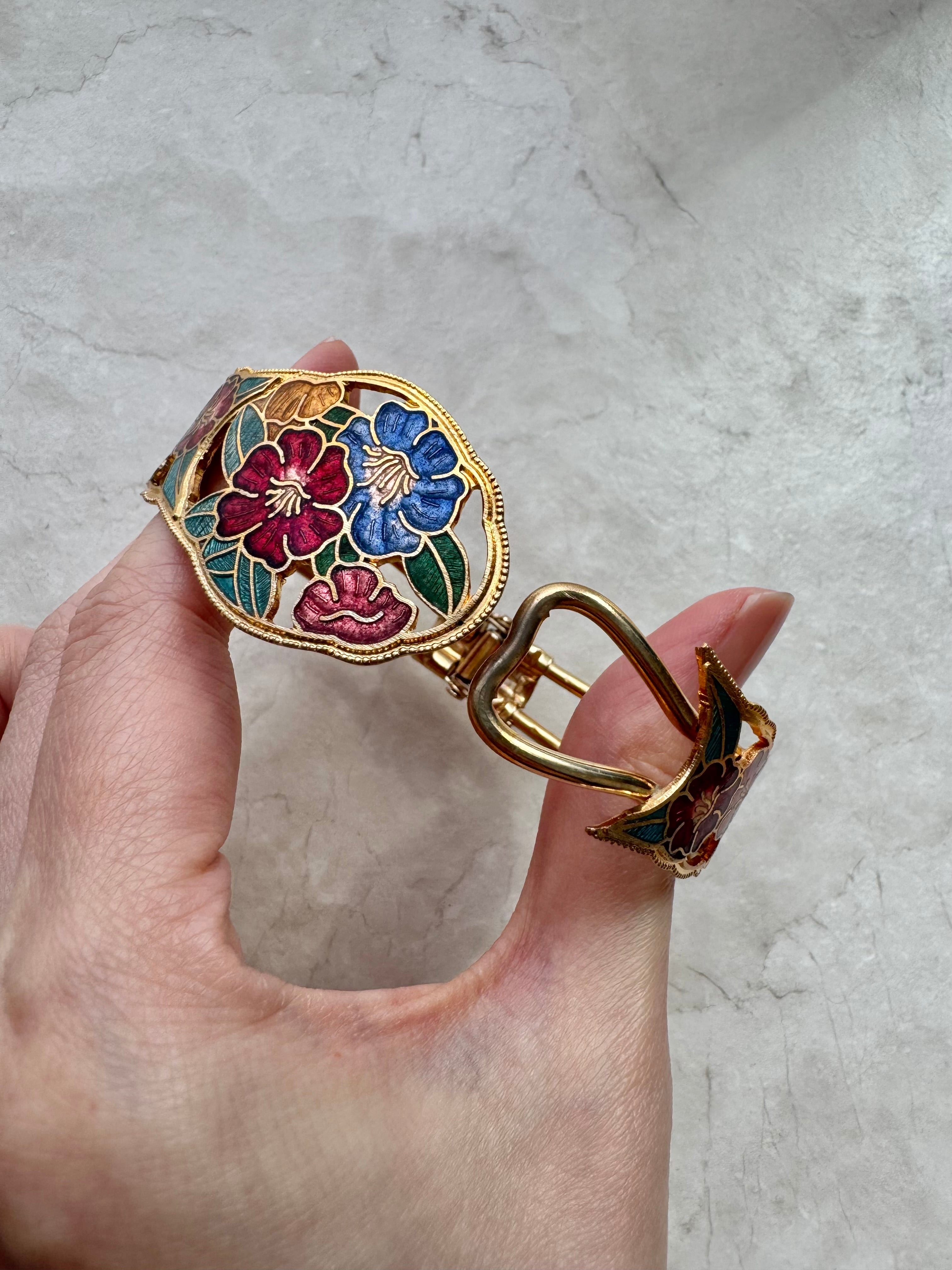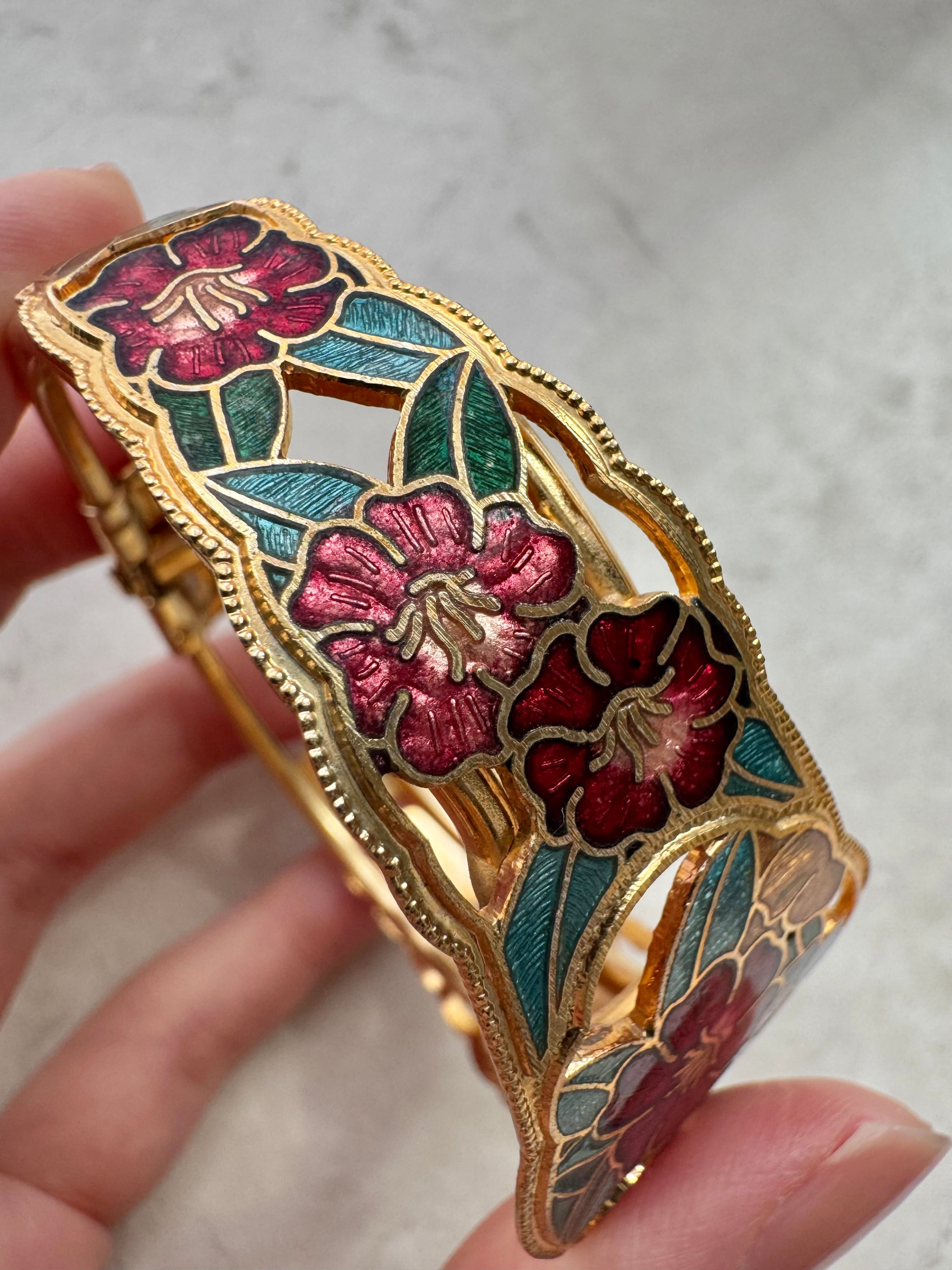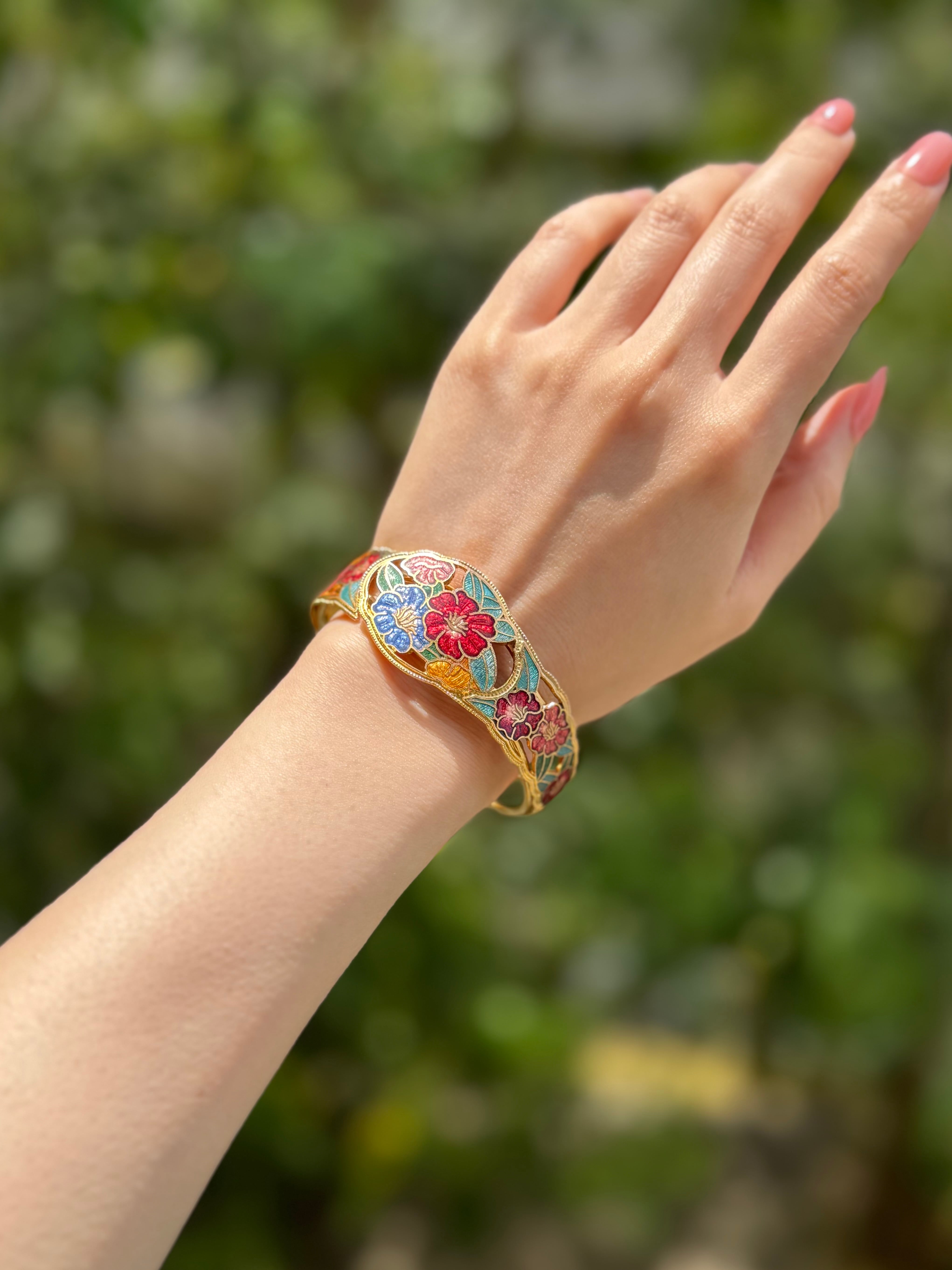 色鮮やかな花々が手元を彩る、七宝焼きのヴィンテージバングル。