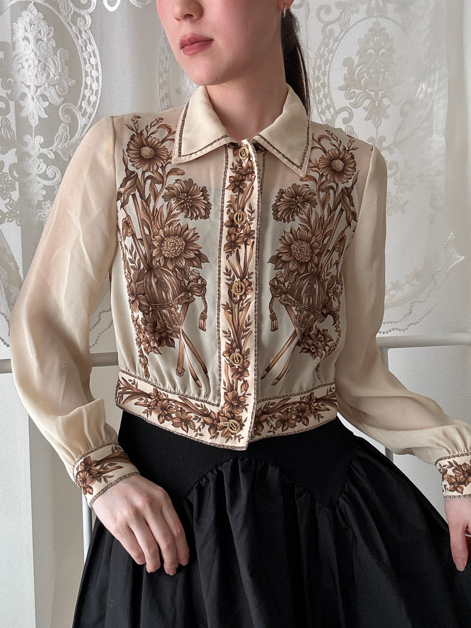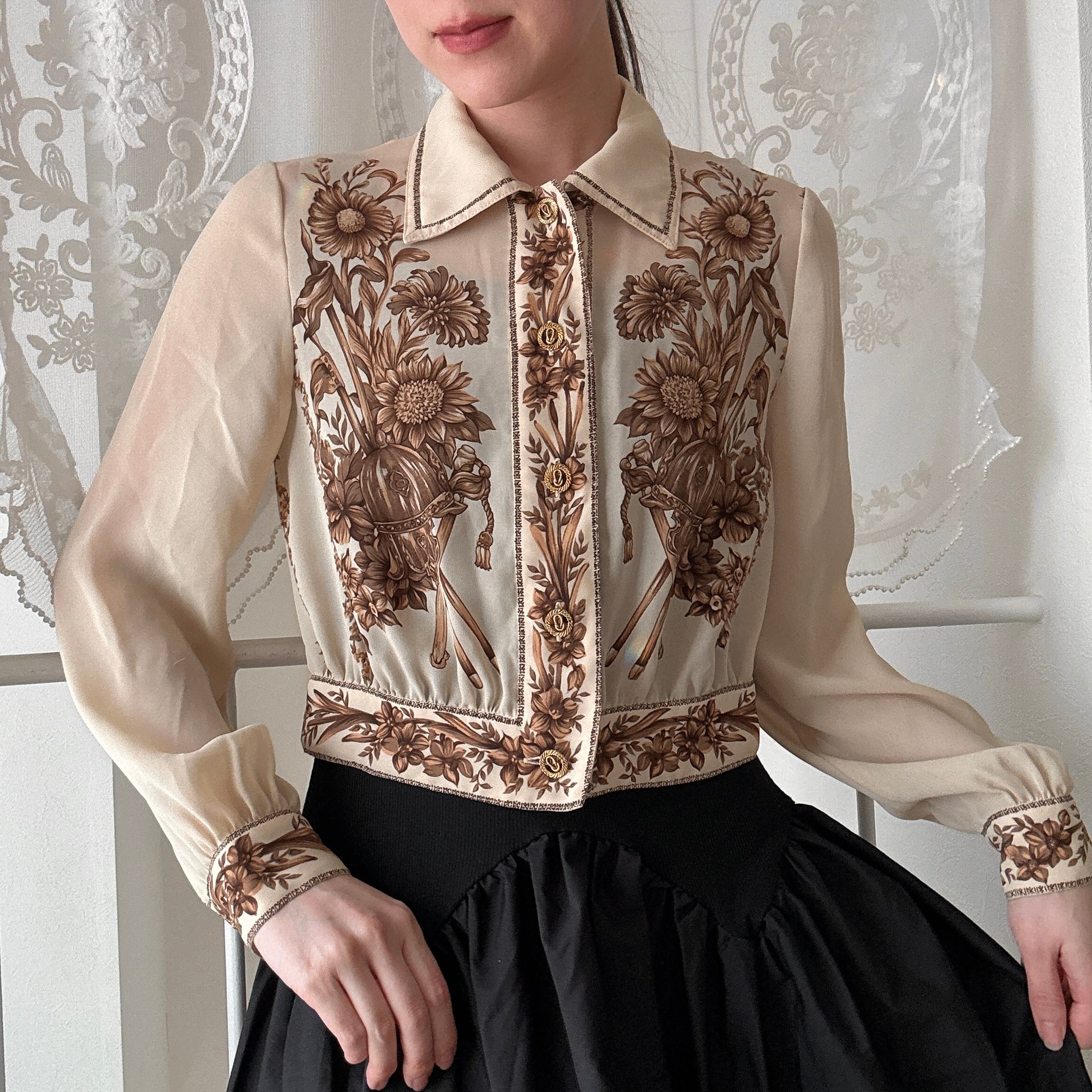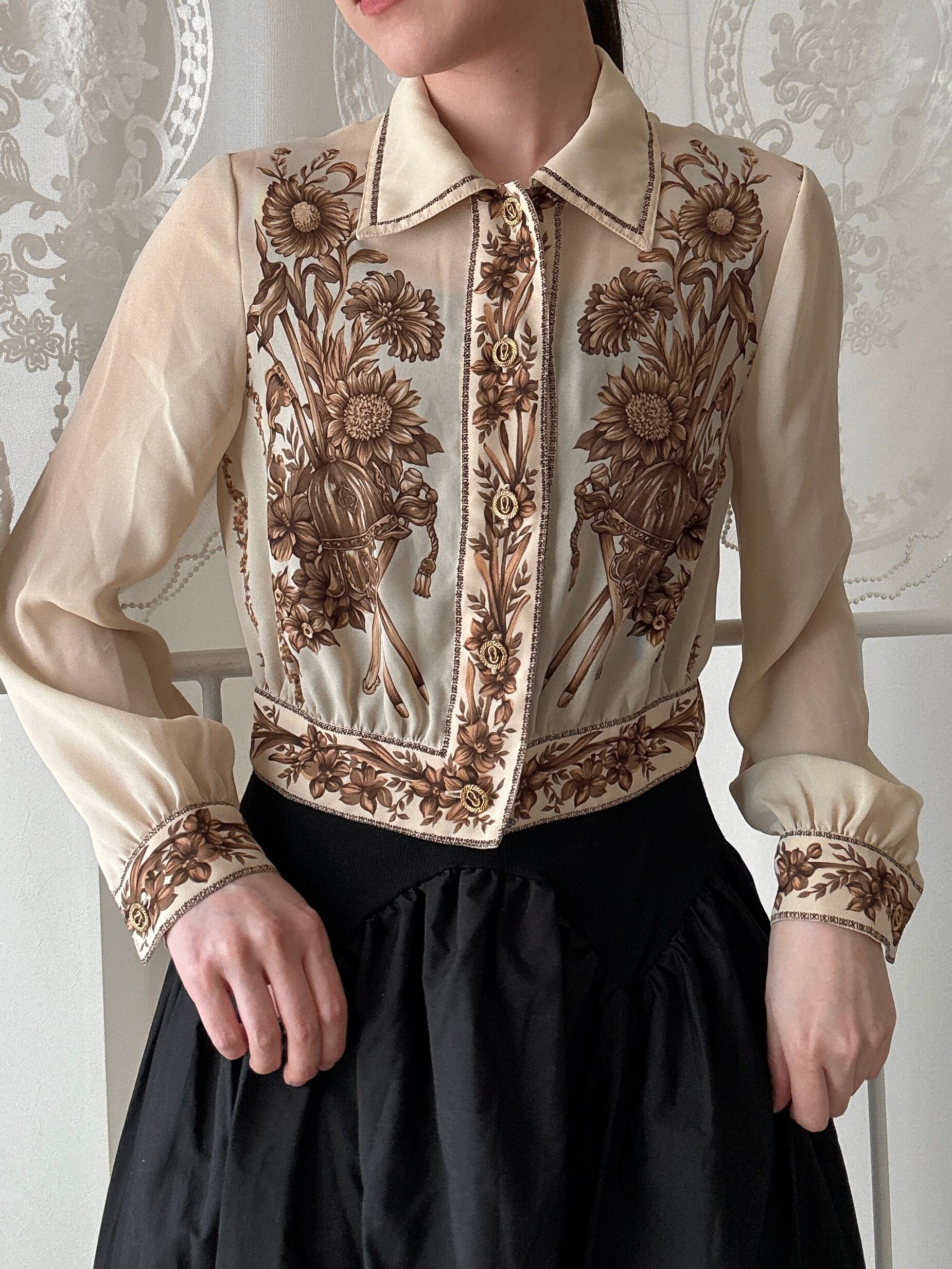 1521. 日本製 レトロフラワープリントブラウス|シアー素材×装飾ボタン|クラシカルヴィンテージトップス