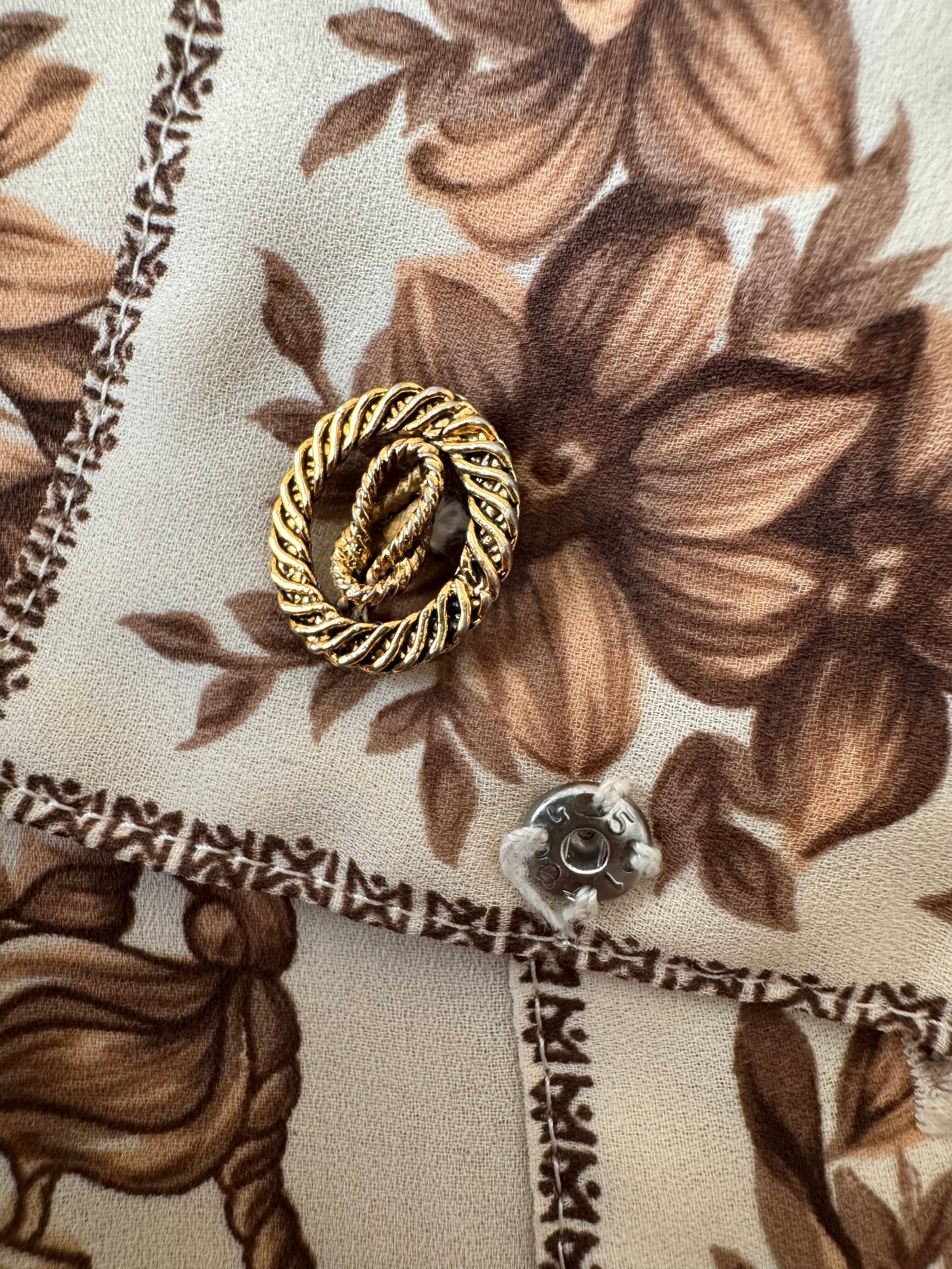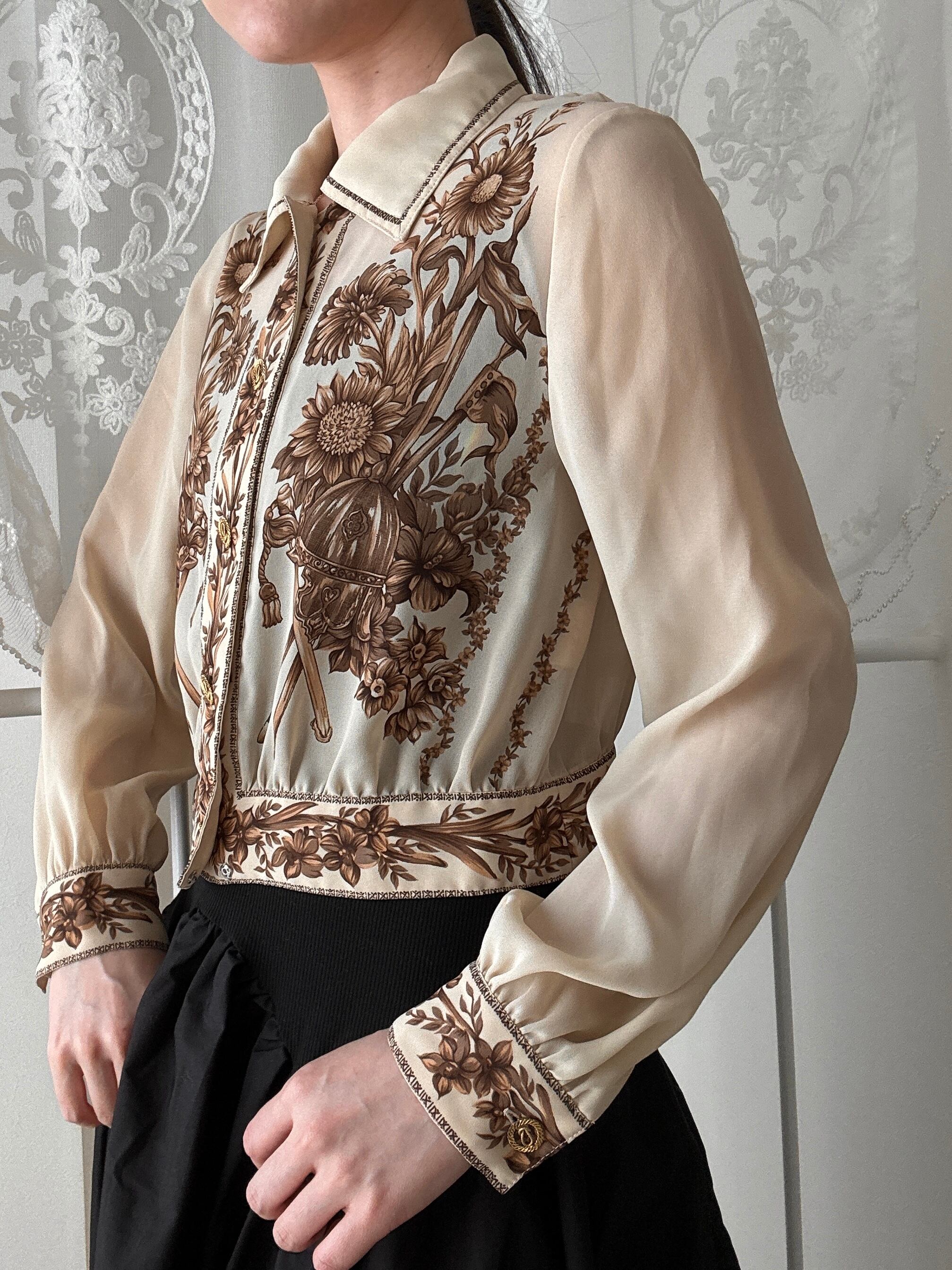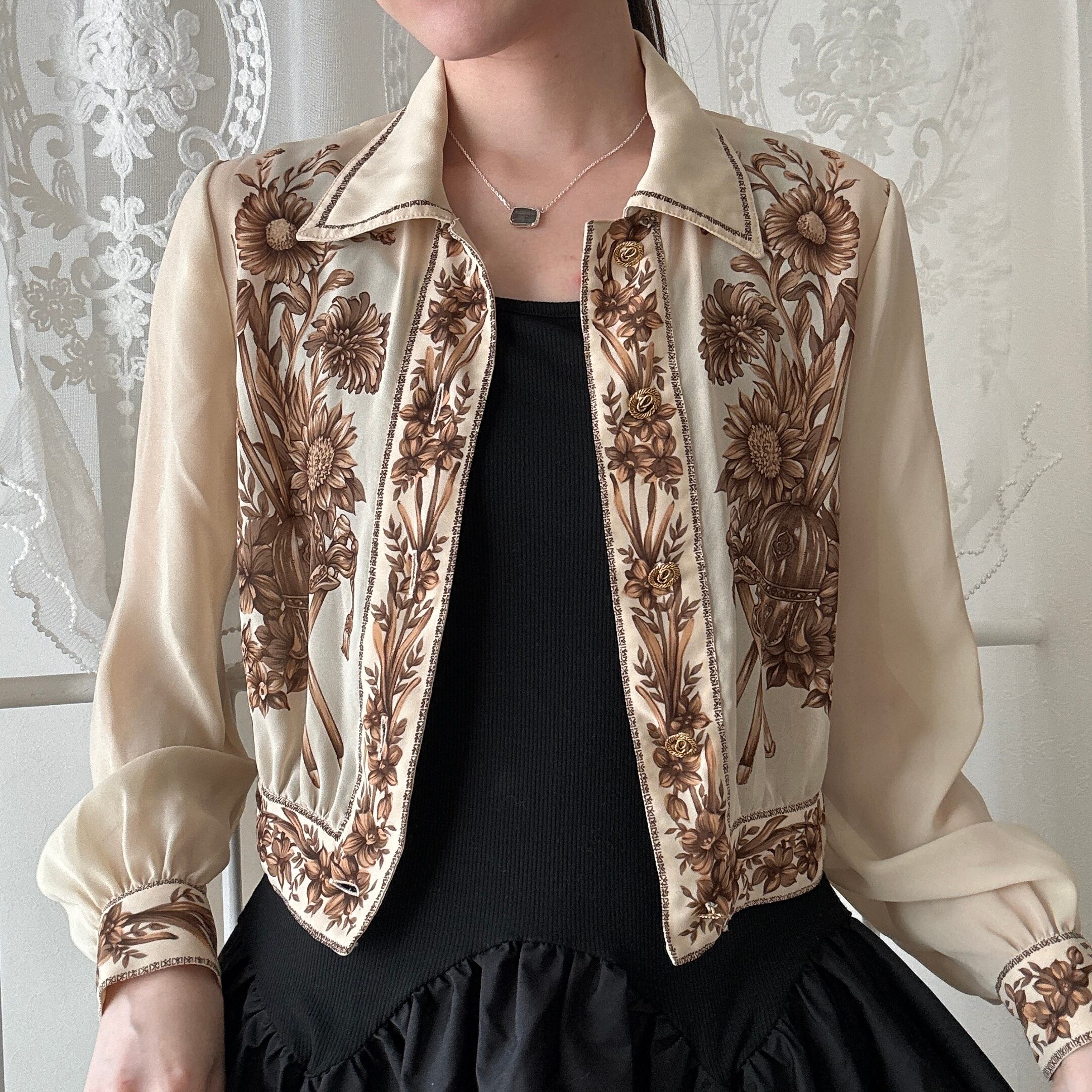 1521. 日本製 レトロフラワープリントブラウス|シアー素材×装飾ボタン|クラシカルヴィンテージトップス