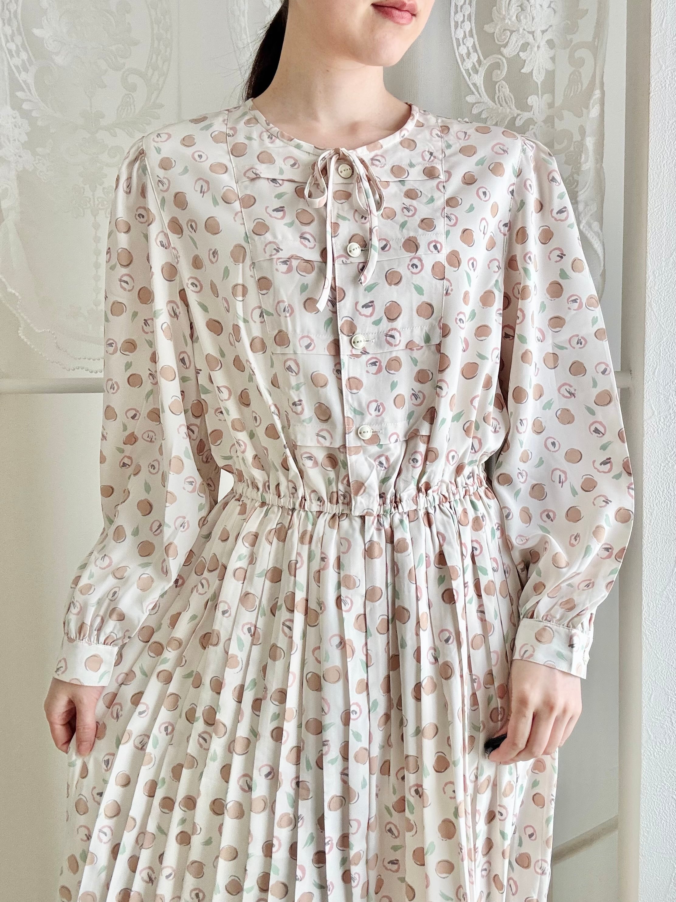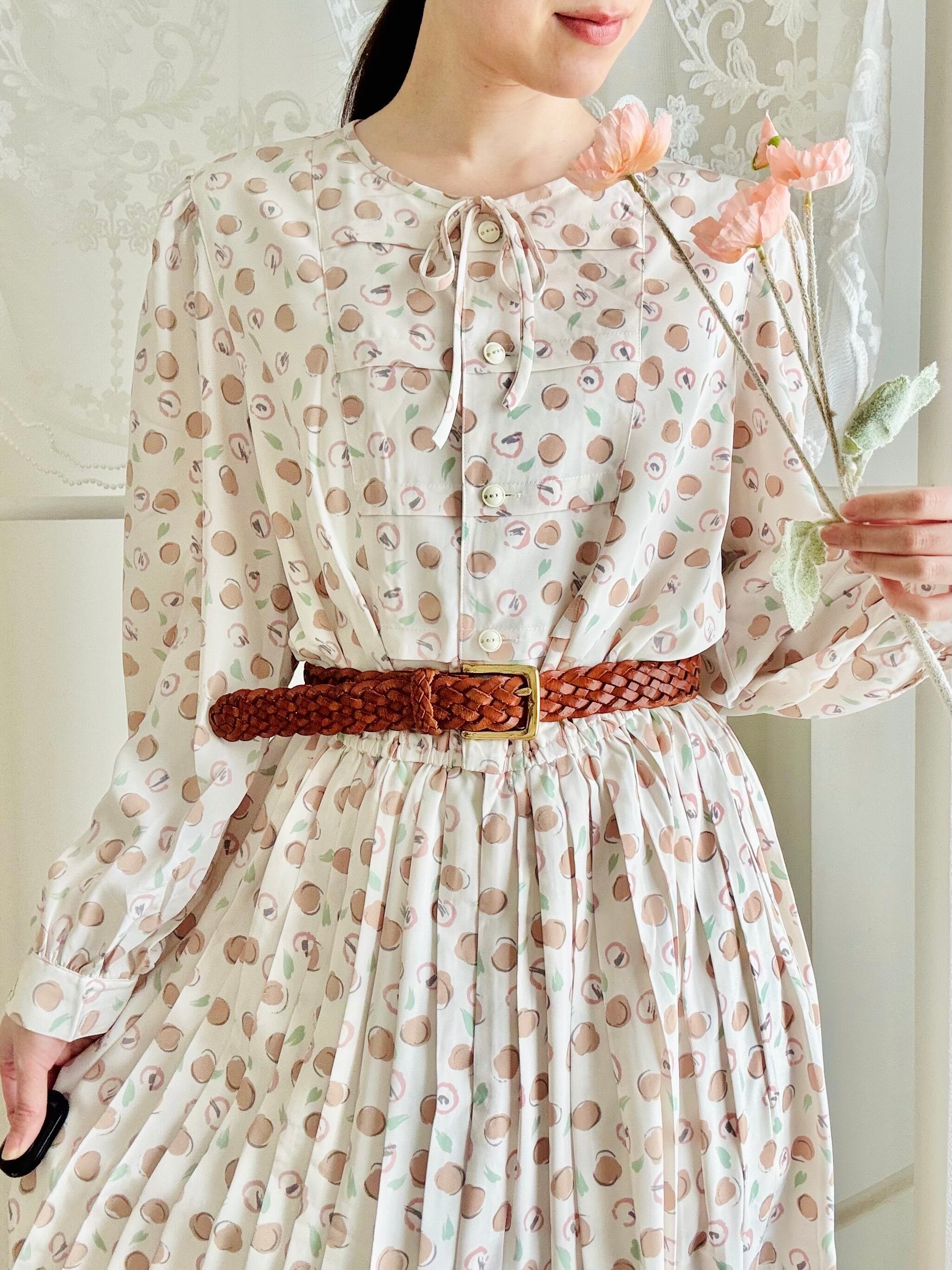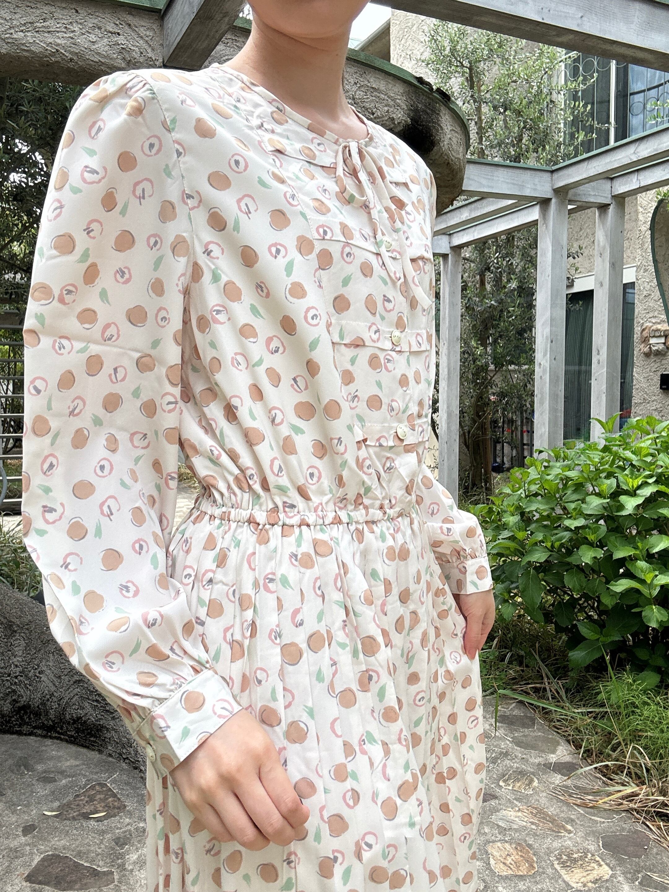 1525. 高島屋レトロ総柄ワンピース|ドット×リボンネック|ウエストギャザー 上品フェミニンワンピース