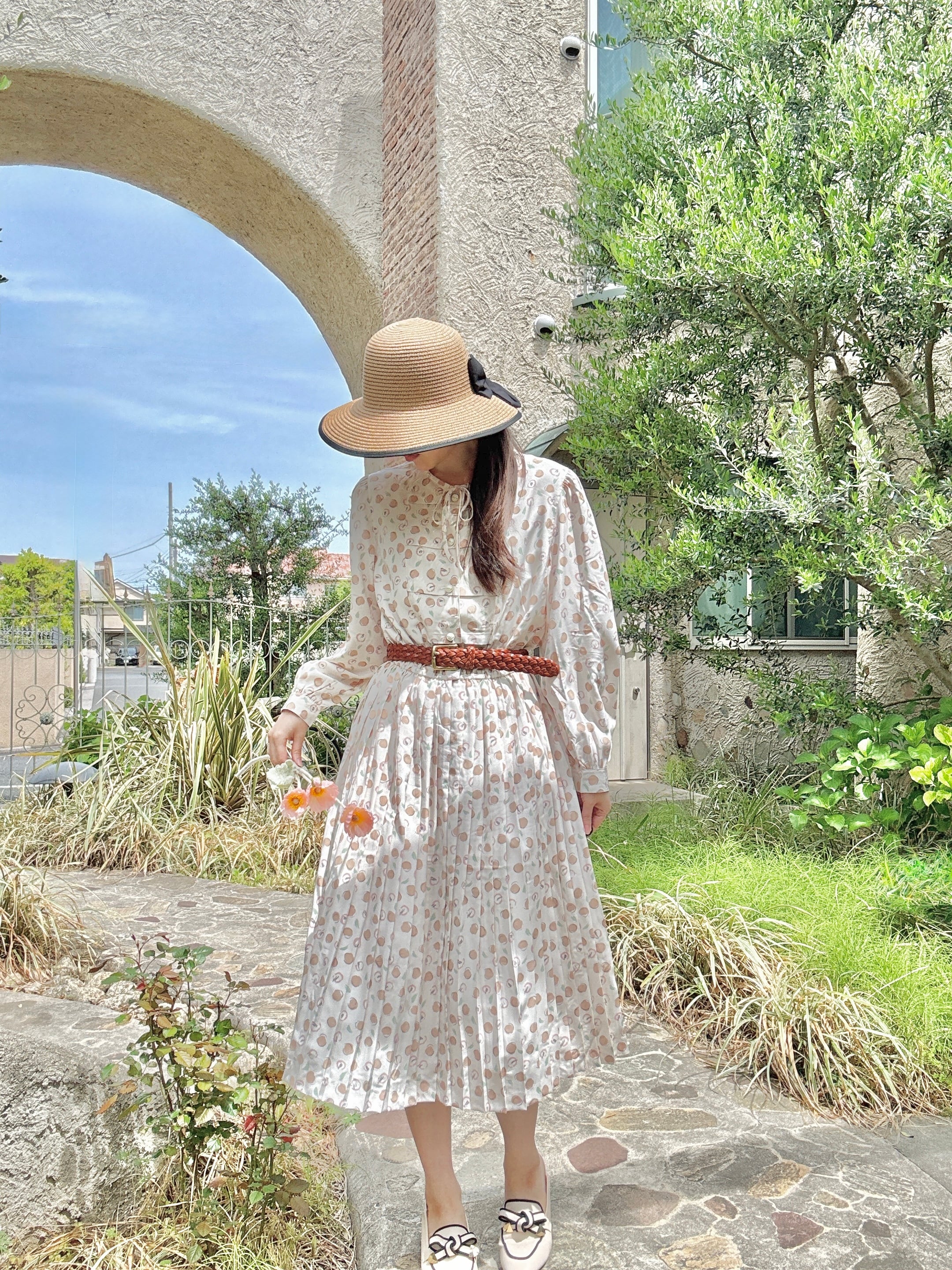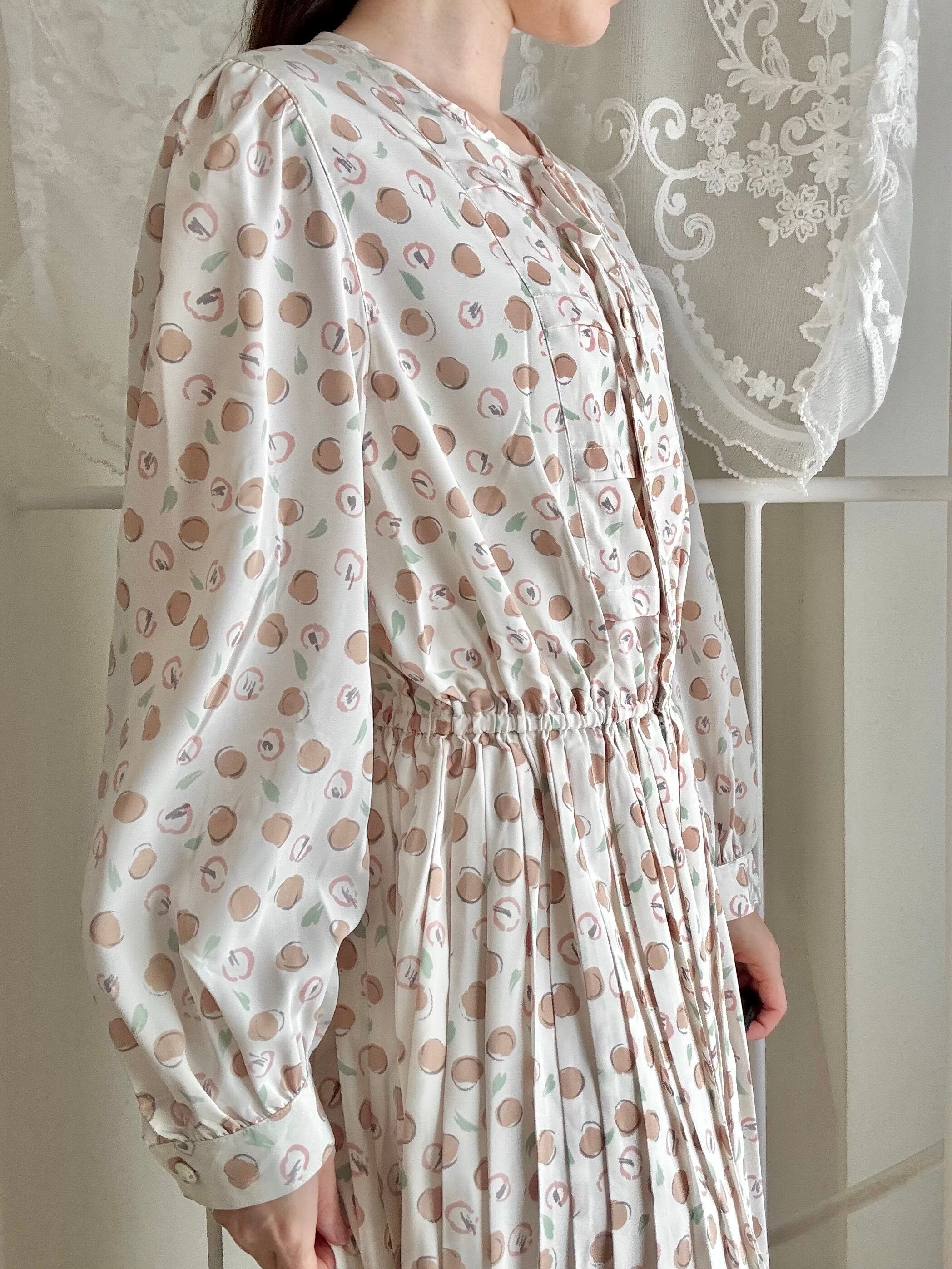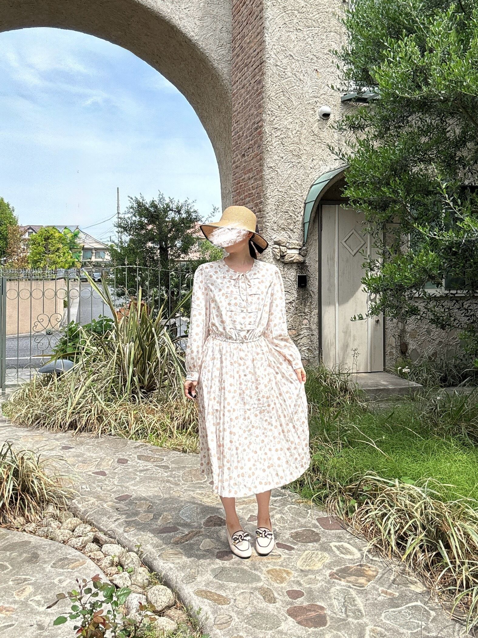 ドットのようにも見える優しい柄に、さりげないニュアンスカラーが重なり、甘さの中に落ち着きを感じる一着です。
