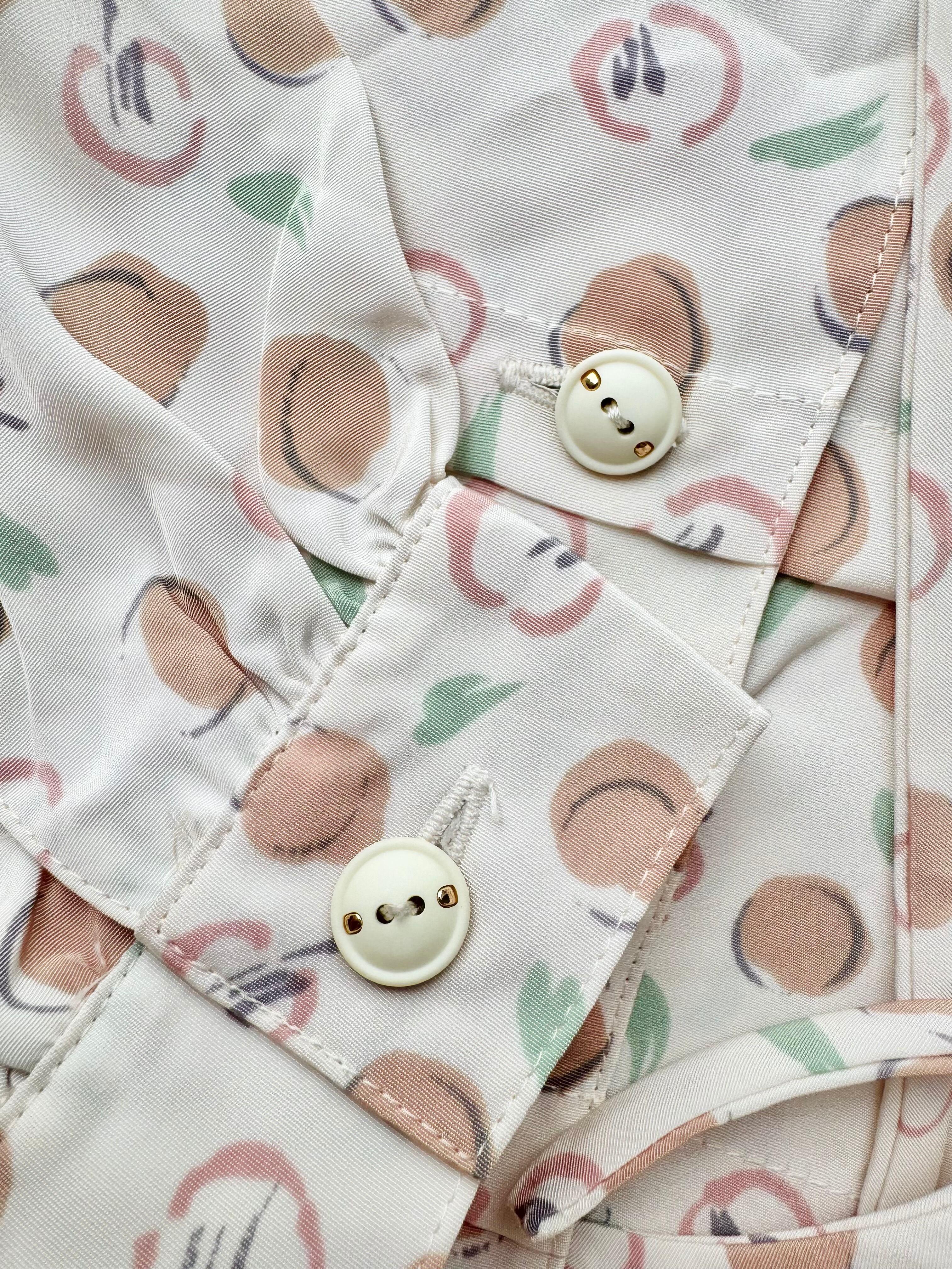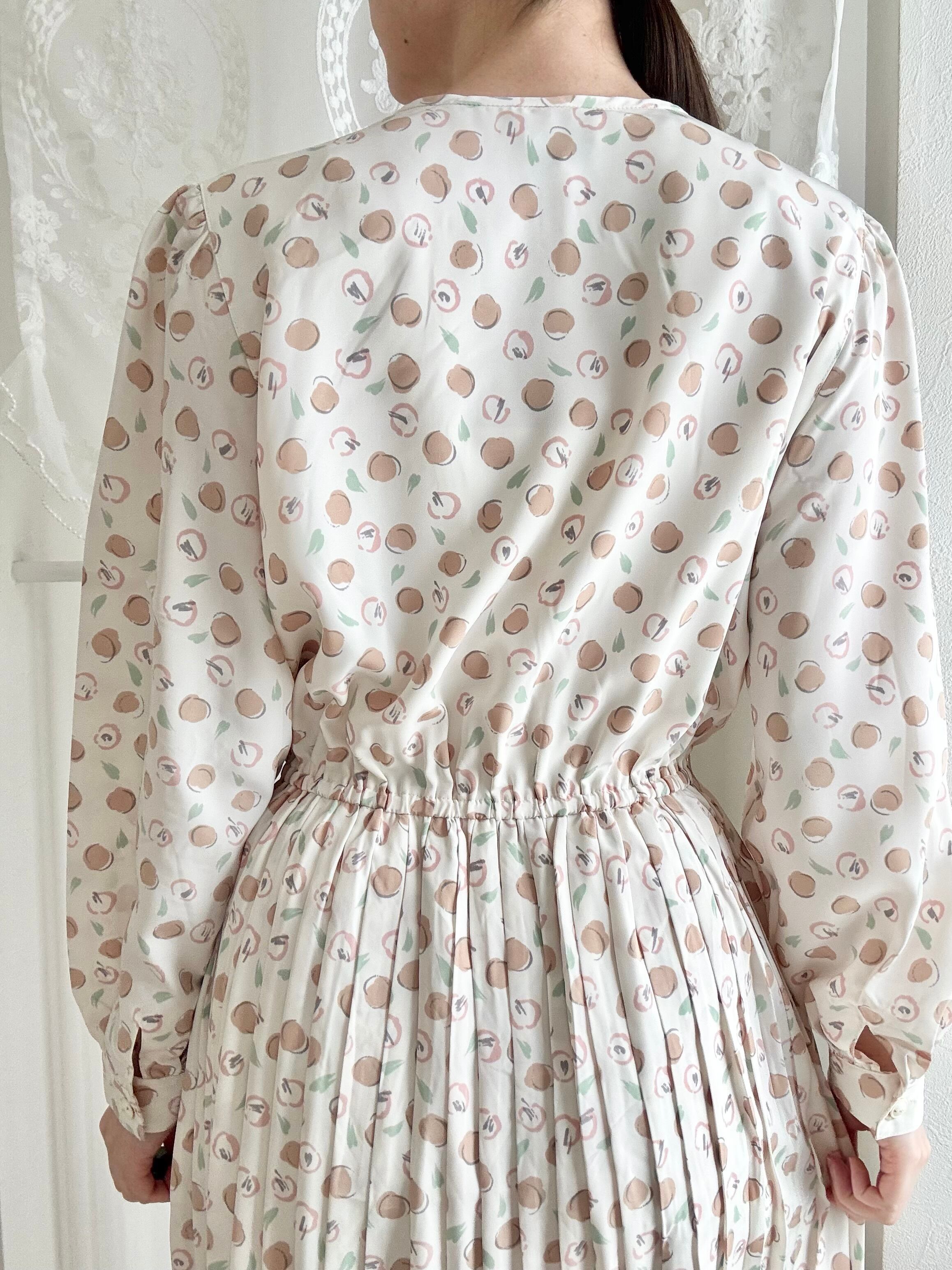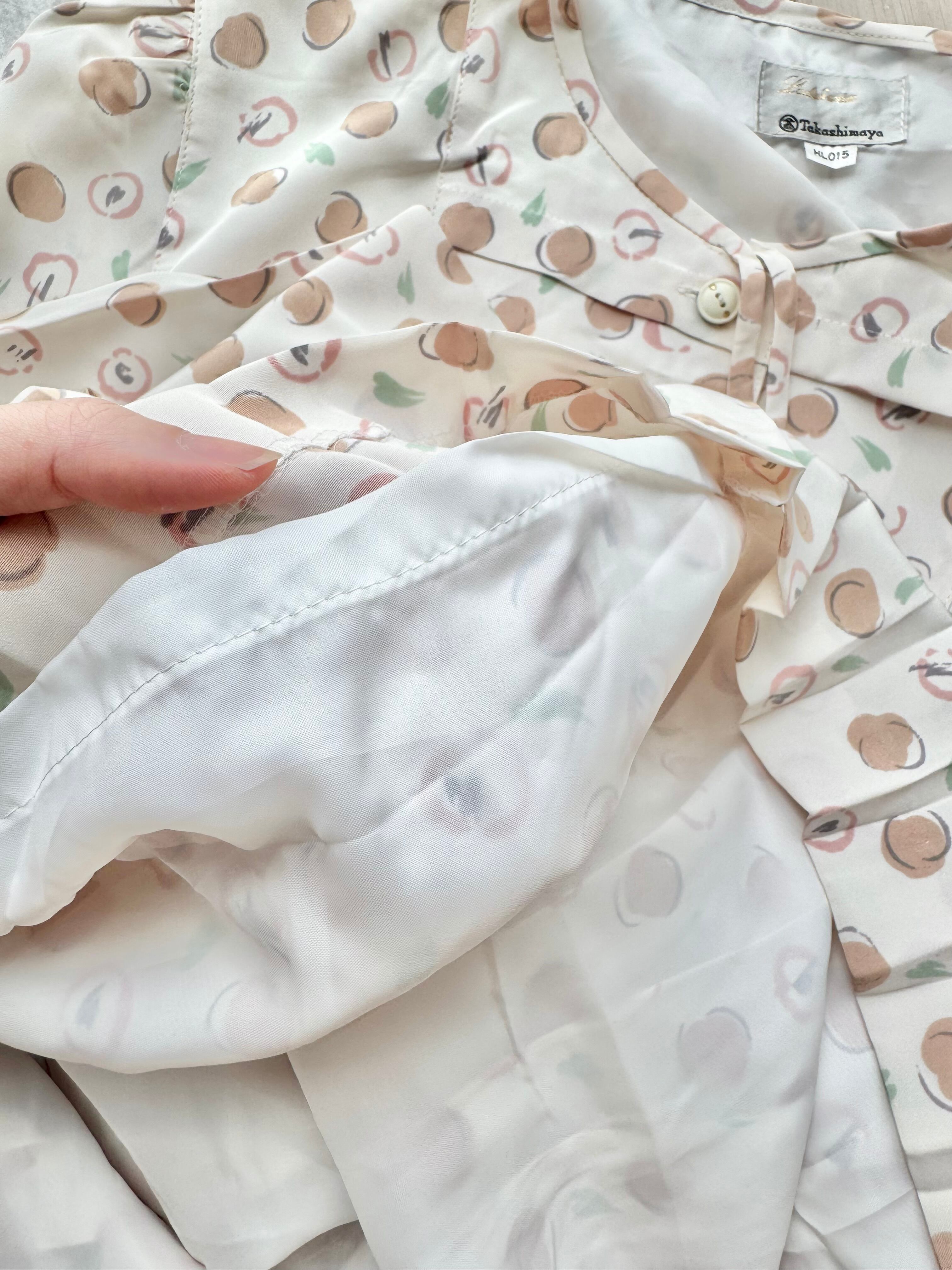 ドットのようにも見える優しい柄に、さりげないニュアンスカラーが重なり、甘さの中に落ち着きを感じる一着です。