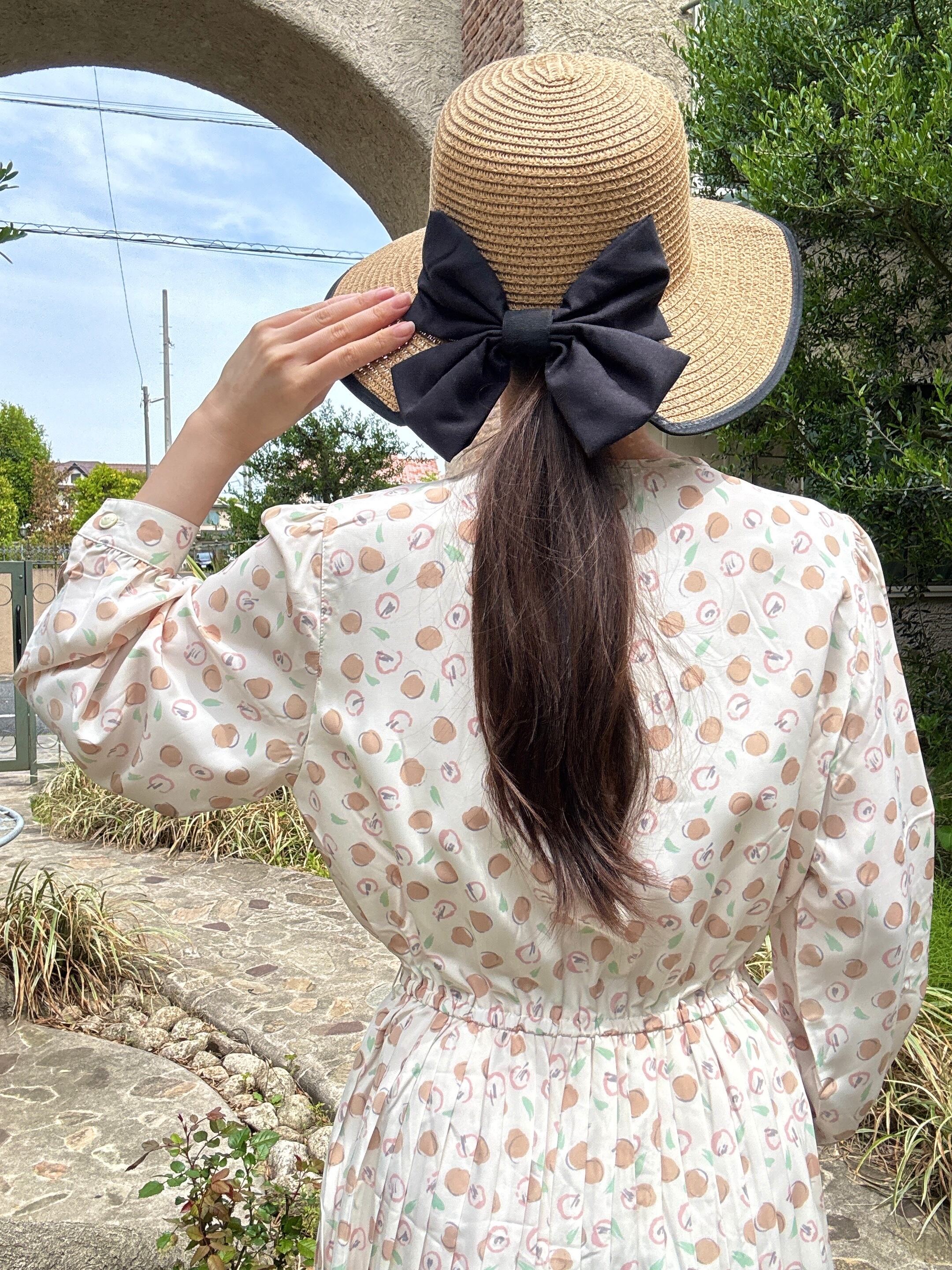 首元のリボンディテールと、ゴールドがさりげなく入ったボタンがクラシカルな雰囲気を引き立て、ウエストのギャザーが自然なシルエットを作ります。