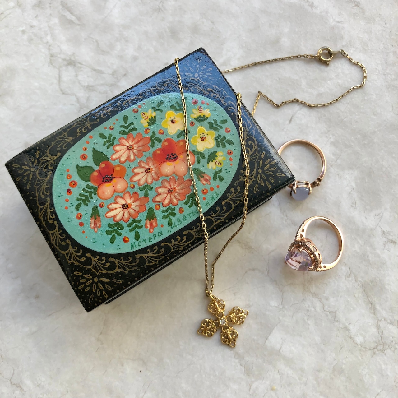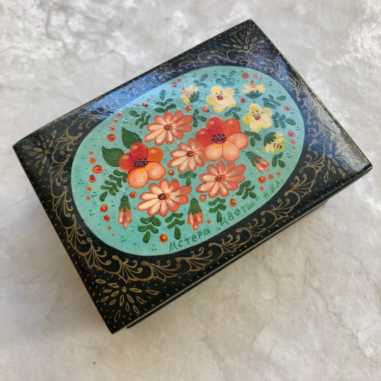 ロシアの伝統工芸ラッカー塗り細密画の小箱です。