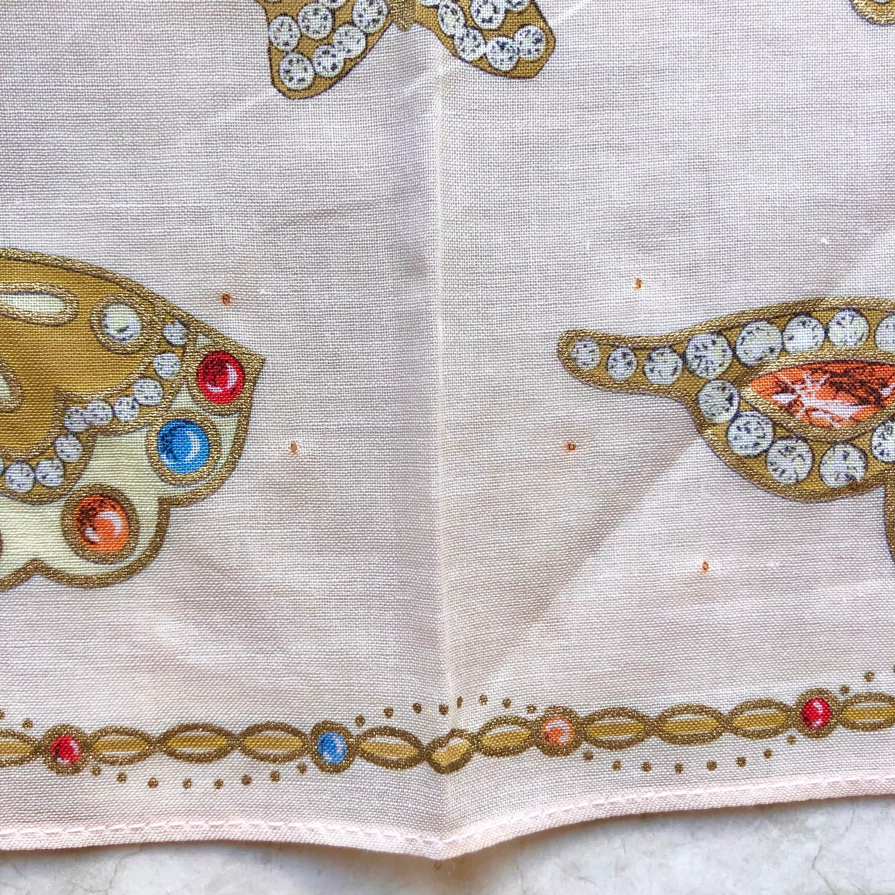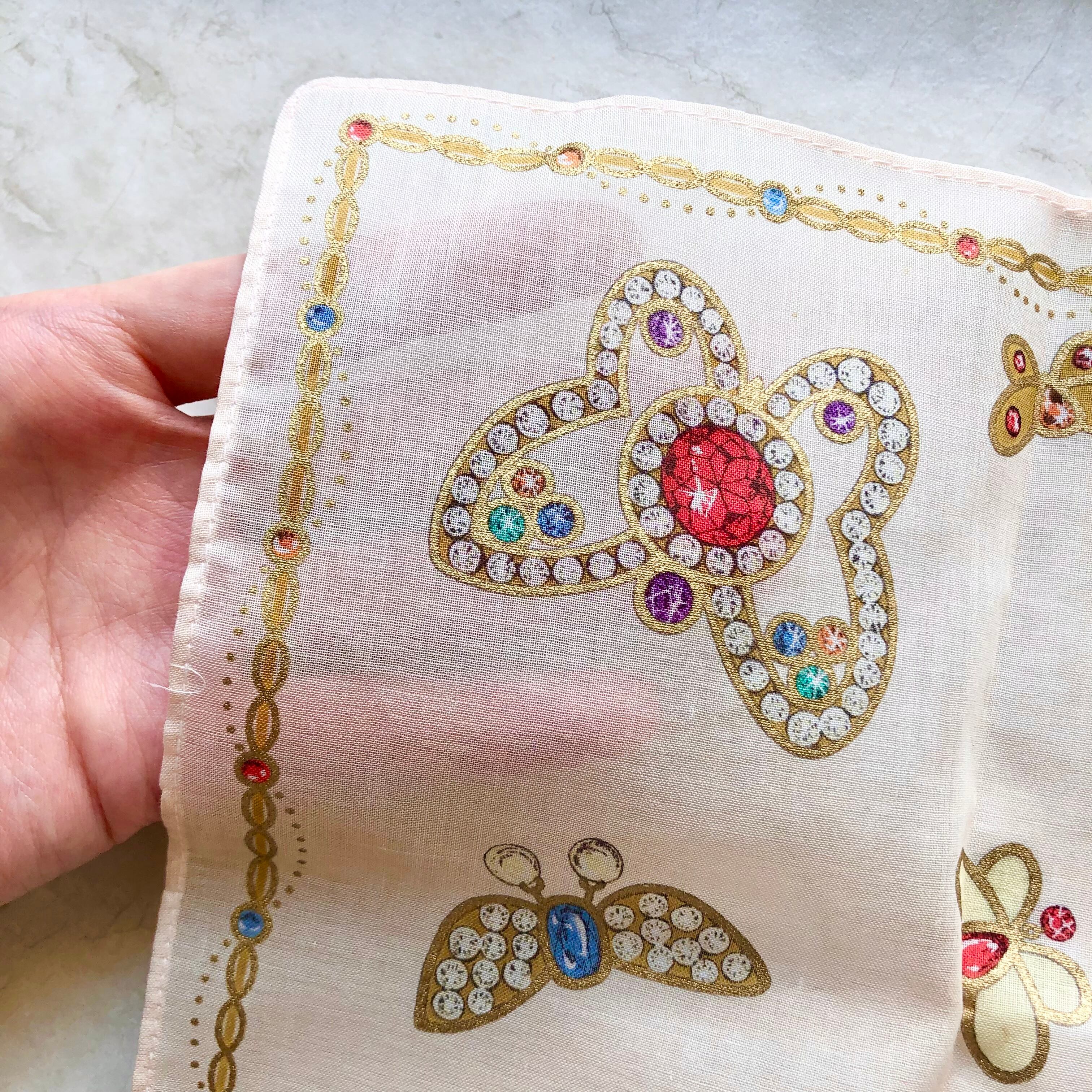 薄くて透け感のある生地に、ジュエリーでデザインされた美しい蝶々の模様が描かれています。