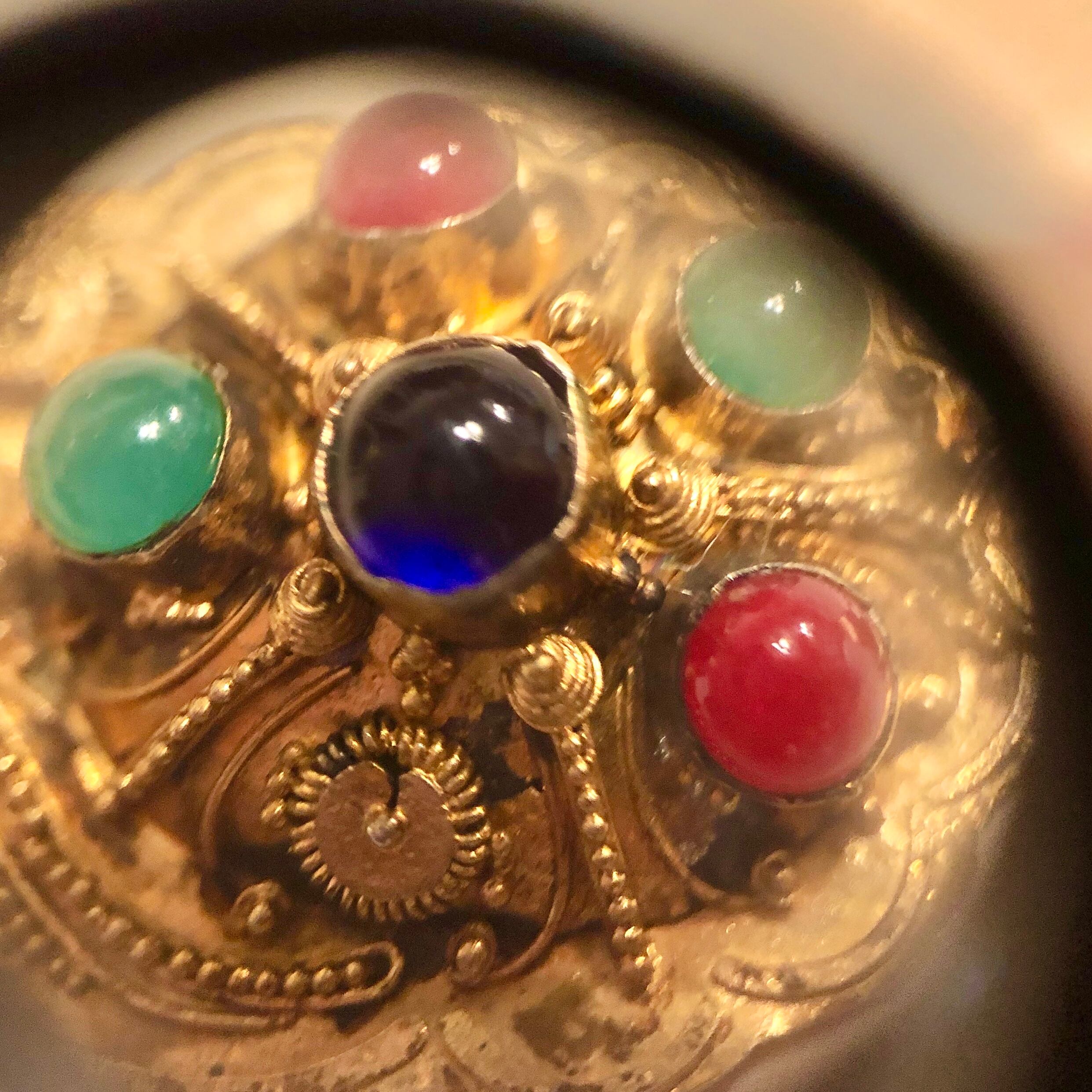 地金は真鍮でおそらく瑪瑙系の天然石が覆輪留めされています。
