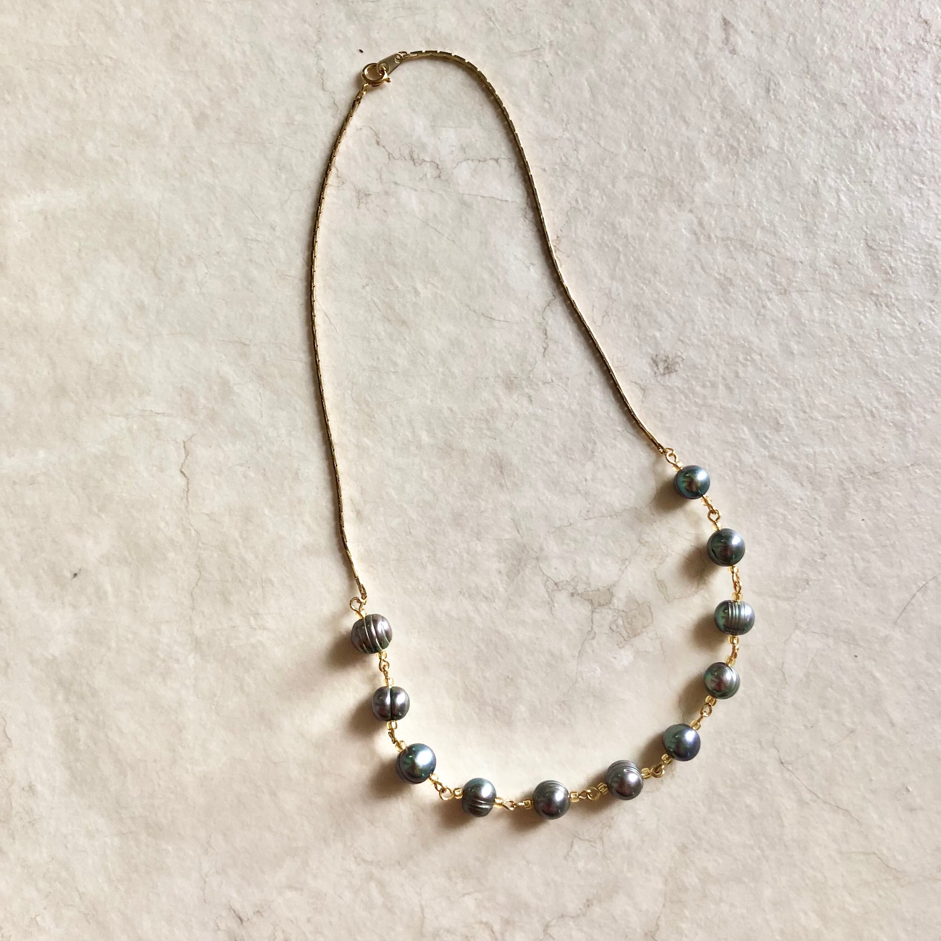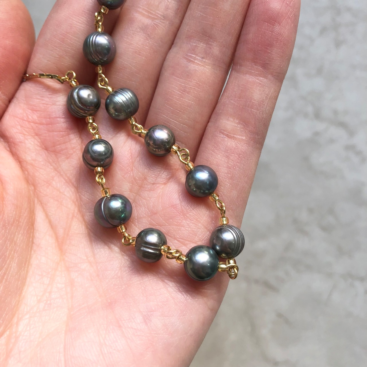 虹色が見えるブルーグレーのバロック淡水パールをネックレスに仕立てました。