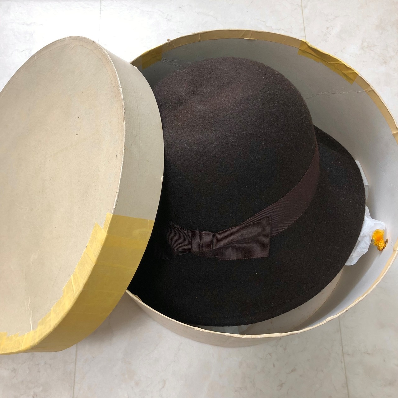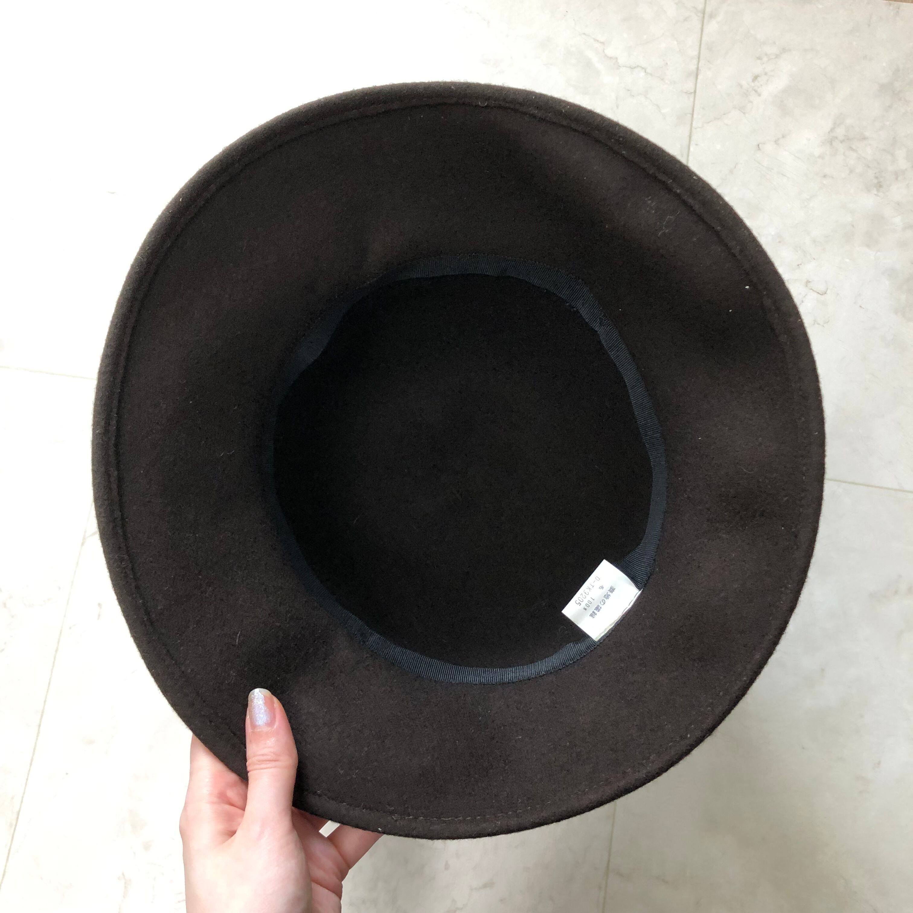 深い焦げ茶色の無地でクラウン全体がなだらかに丸く、ブリムは下向きです。