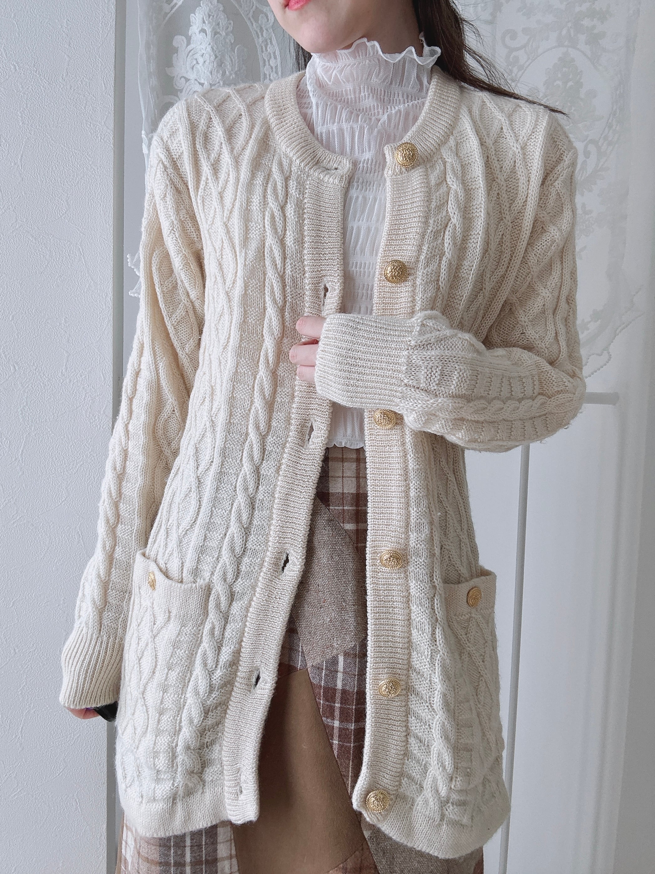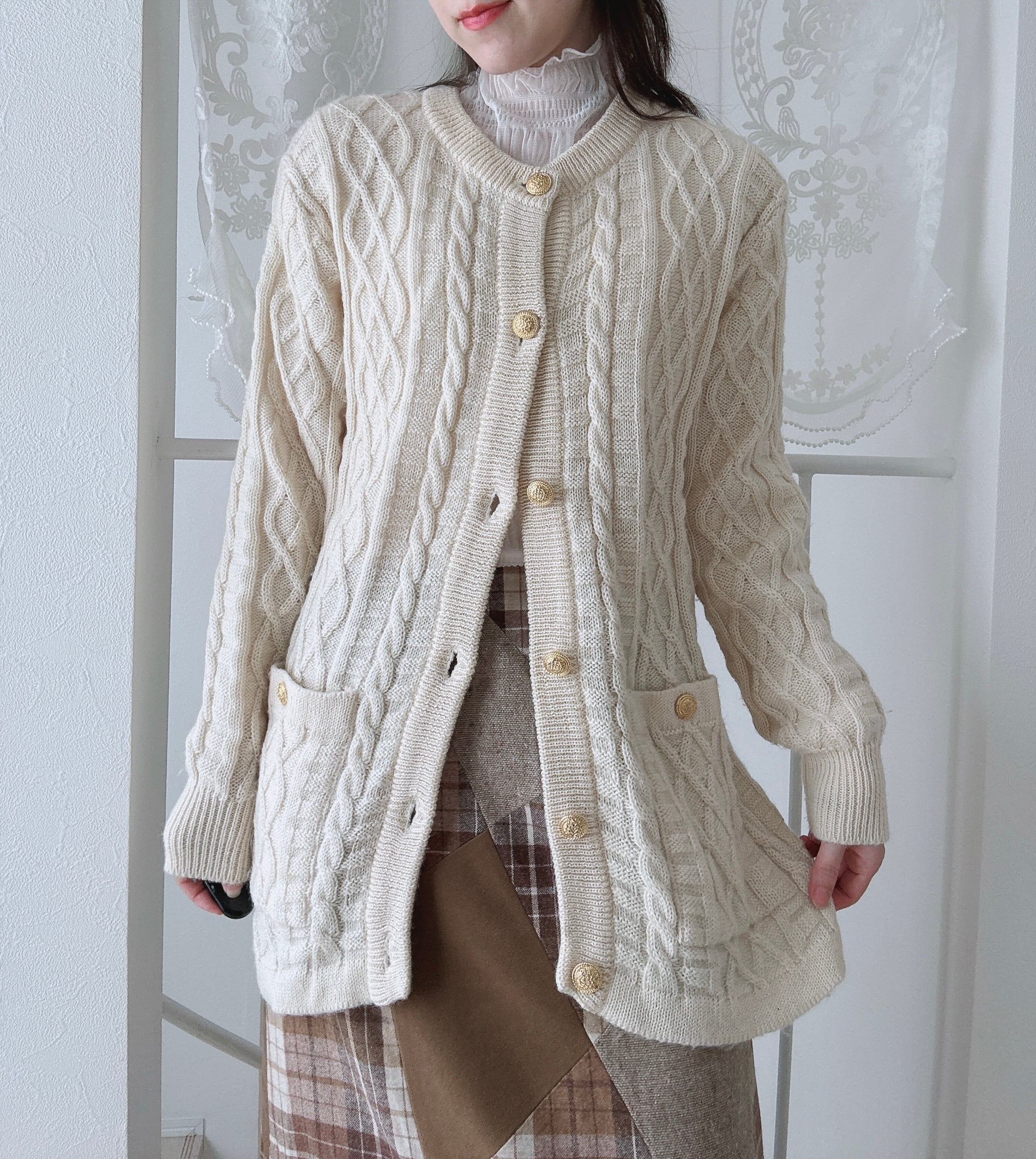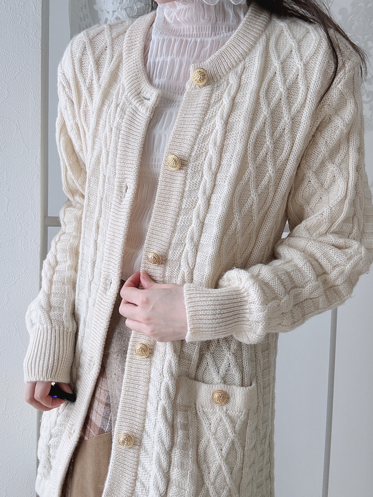 1293. 【毛100%・日本製】オフホワイトロングカーディガン|上質ウール・ヴィンテージ感ある金ボタン・柔らかニット