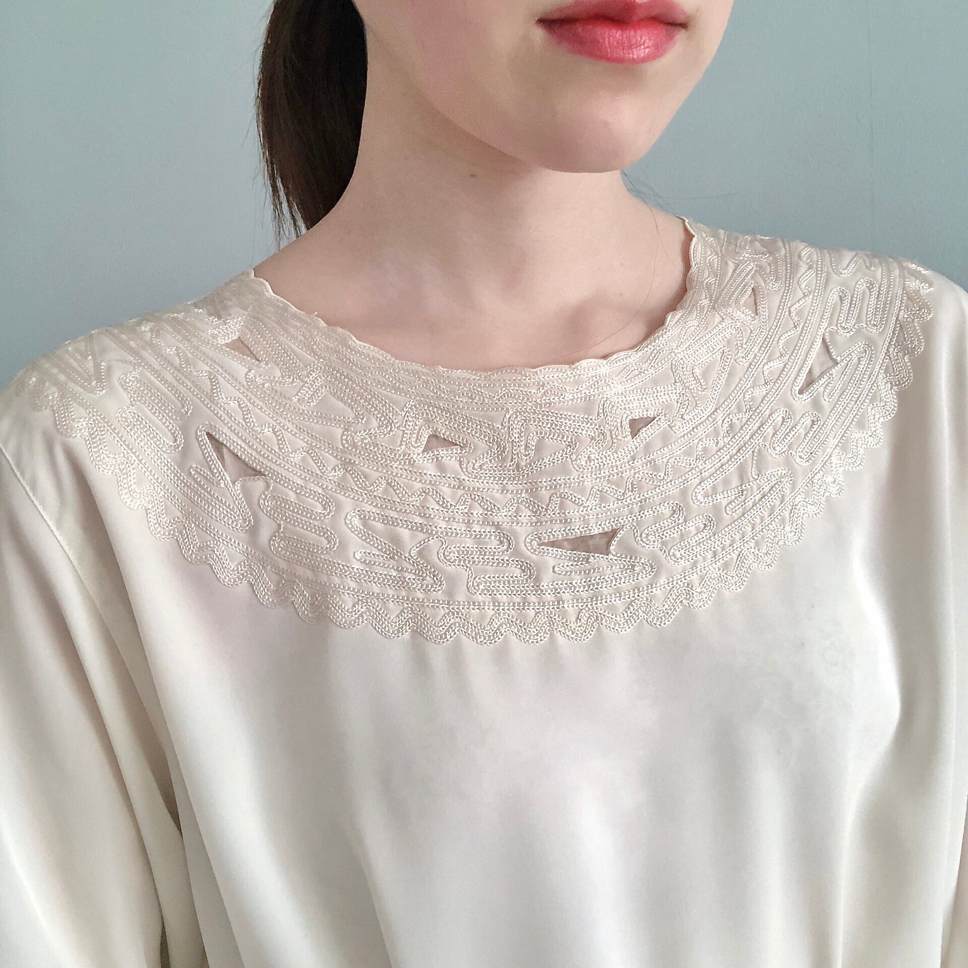 デコルテに施された繊細な刺繍やオーガンジー素材で透け感のあるスカラップ模様が美しいブラウスです。