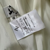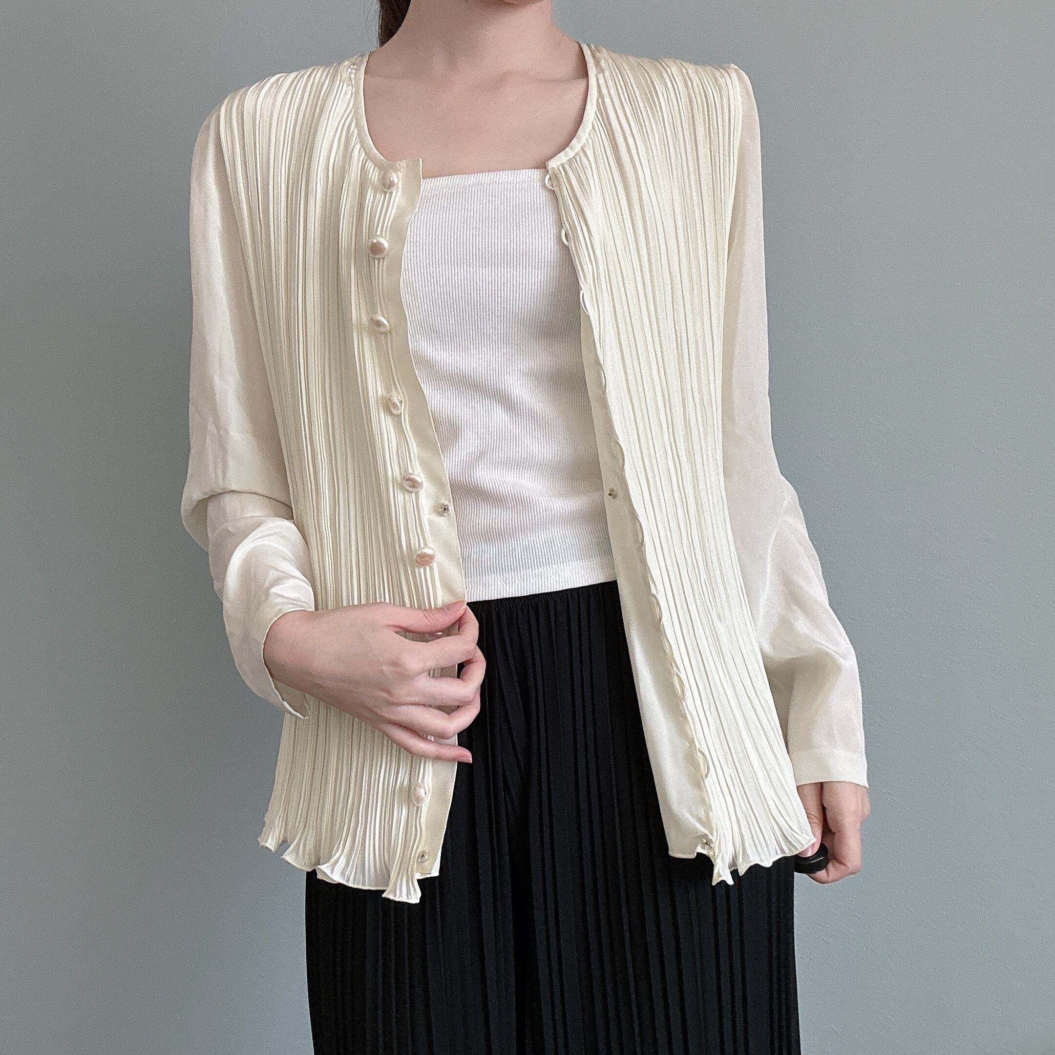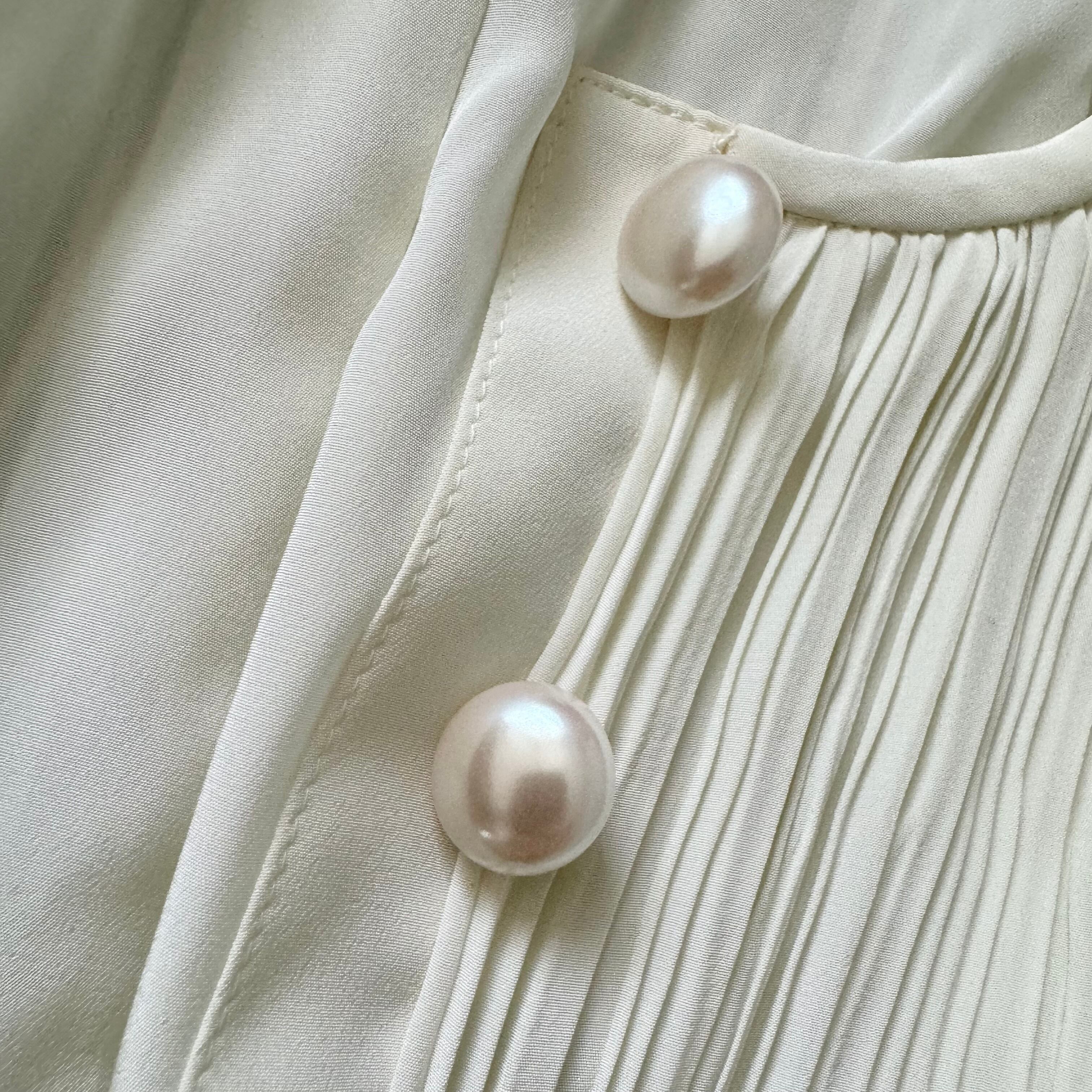 柔らかいプリーツ生地にマベパールのようなつるんとしたパールボタンが付いているブラウスです。